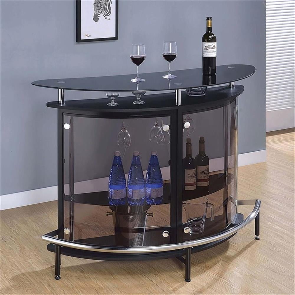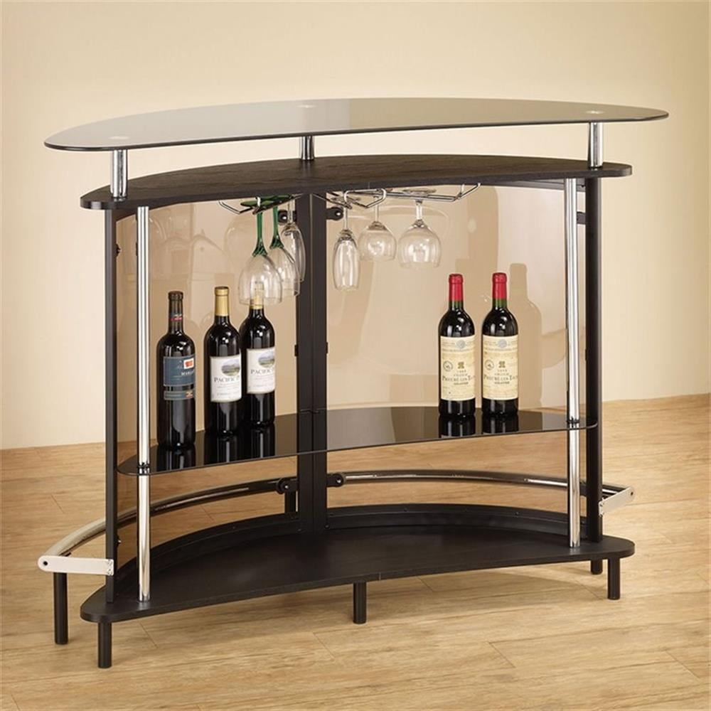 Coaster Contemporary Bar Unit, Black/Chrome Sleek contemporary bar unit Compact design, perfect for small spaces Durable metal frame Two tempered glass storage shelves Stemware rack and chrome accents Features one tier of shelving and stemware racks for easy access to glasses and bottles Assembly Required Dims: 50.75″ x 20.00″w x 41.00″h