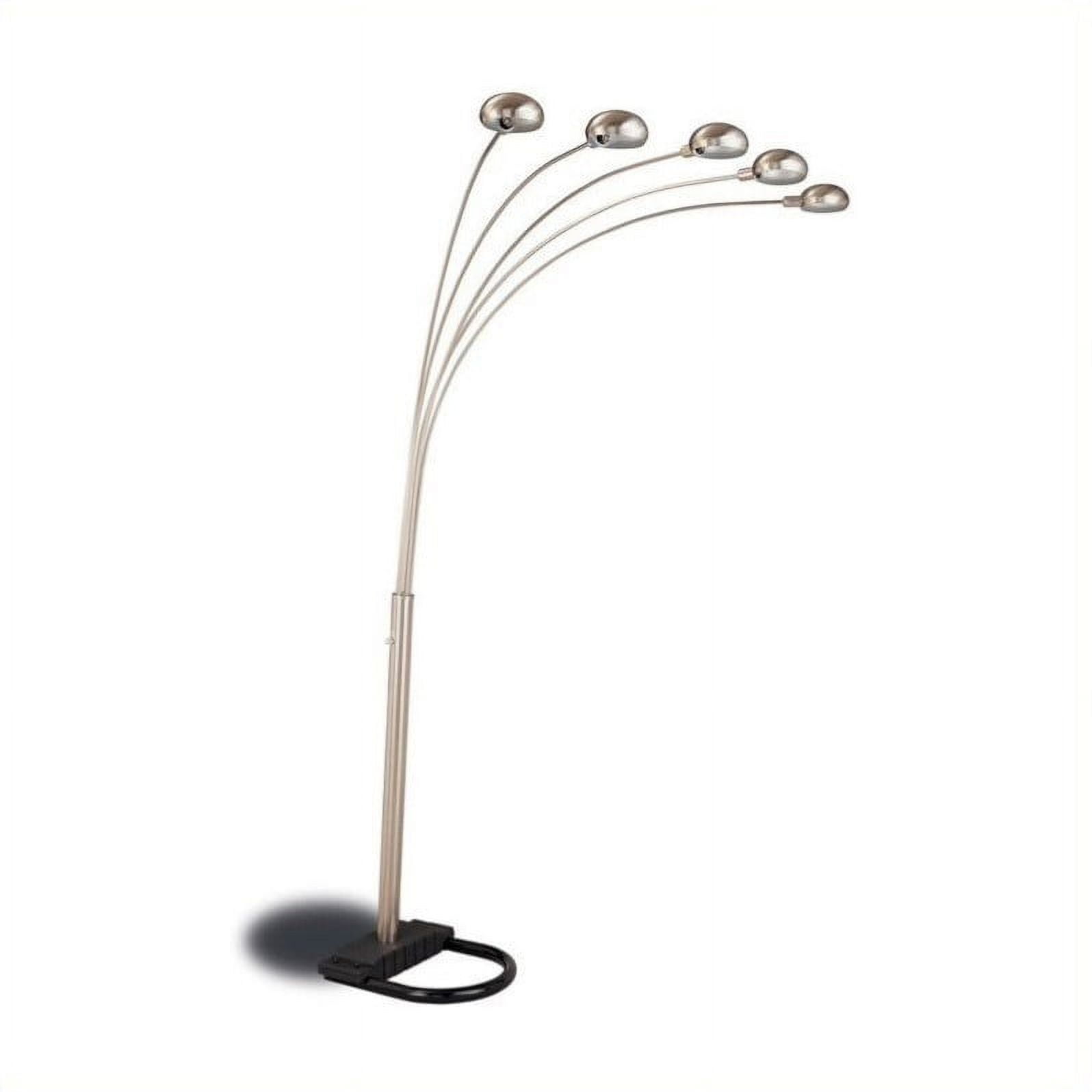 Illuminate your home with sleek, modern glamour and a kick of vintage inspiration. This striking sofa lamp makes a bold statement in a living room or basement lounge. Five smooth, round metal shades are affixed to a gracefully curved frame, glowing with contemporary glamour. A simple black base anchors it down, adding sturdy support. Finished in shining chrome, this floor lamp lights up a room in style, adding polish and panache to your decor. Features: Includes: One (1) floor lamp Finish: Black and chrome Materials: Metal Futuristic five-light sofa lamp Chrome finish with black support base Curvy dome shades continue the chrome finish 5 bulbs total included Switch type: Dimmer Socket: E12 Power cord length: 58″ The Number1243 needs to be plugged into an outlet when using Specifications: Product Dimensions: 92″H x 28″W x 46″D Product Weight: 29.41 lbs Wattage: 40W Assembly Required: Yes Warranty: One (1) year limited manufacturer warranty