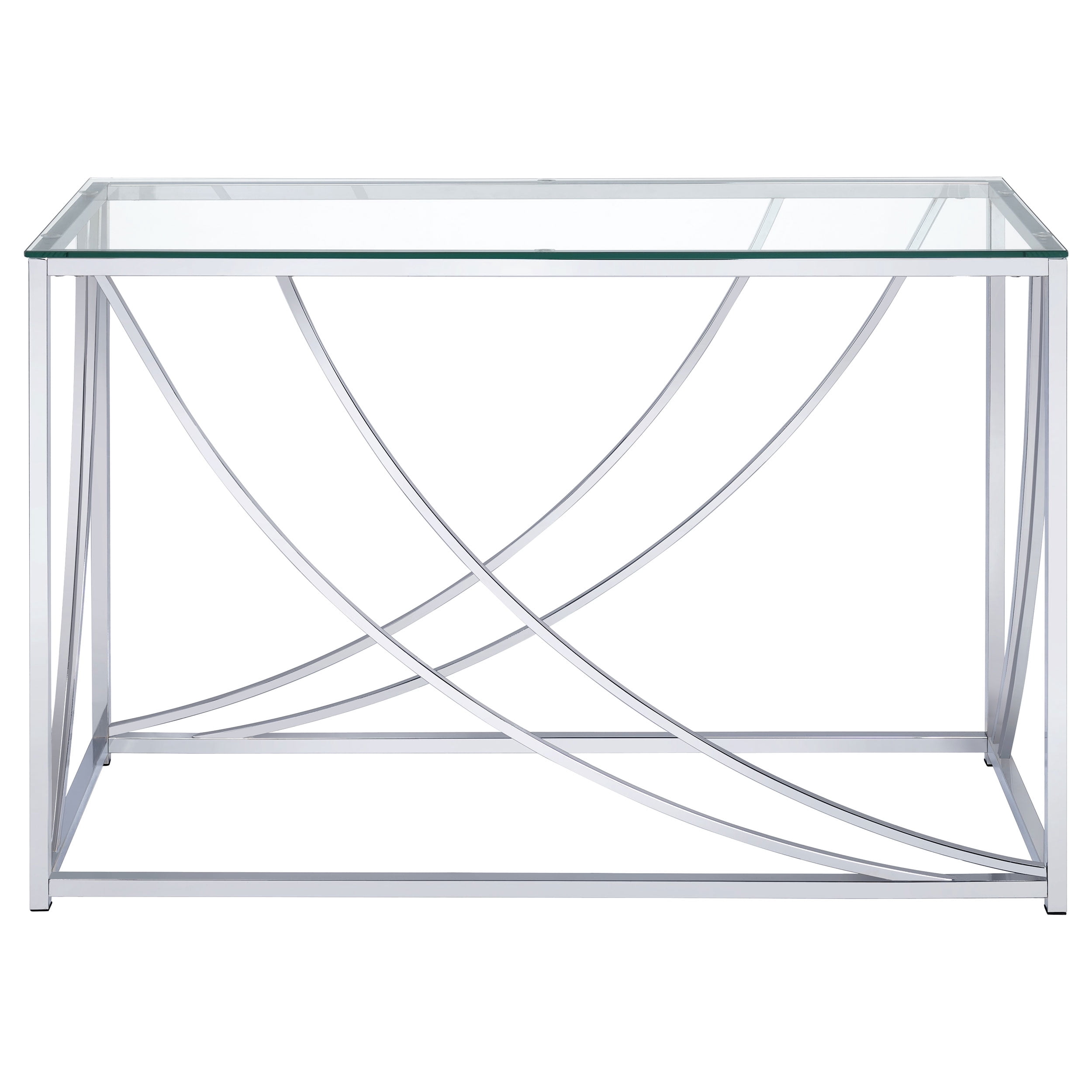 Includes: One (1) sofa table Finish: Chrome and Clear Materials: Metal, Glass Elegant, contemporary designed occasional set Unique detailing with stylish, swoop chrome accents along table sides Smooth glass table tops Top panel: Clear glass Base frame: Metal Leveler/ plastic glide: Plastic glide Shape: Rectangular