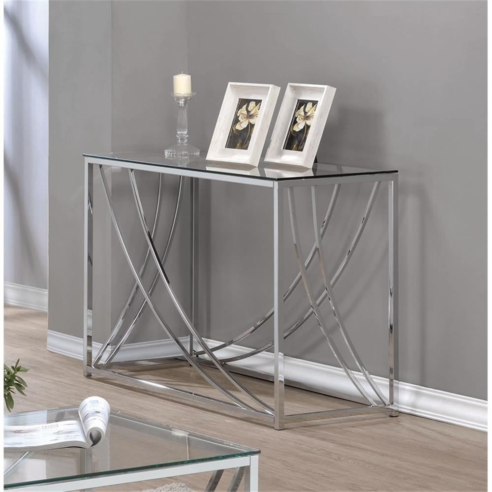 Full of clean lines and swooping curves, this modern sofa table adds depth to any living room or entryway. Bright and radiant, a shiny chrome finish dresses up the simple lines of the frame. The contemporary design of the decorative accents sets the smooth silhouette apart from the rest. Revel in the luxury and structure of the combination of a metallic base topped with glass. Create a visual focal point with the textures from this charming table. Features: Includes: One (1) sofa table Finish: Chrome and Clear Materials: Metal, Glass Elegant, contemporary designed occasional set Unique detailing with stylish, swoop chrome accents along table sides Smooth glass table tops Top panel: Clear glass Base frame: Metal Leveler/ plastic glide: Plastic glide Shape: Rectangular Specifications: Product Dimensions: 29.75″H x 42.25″W x 16.5″D Product Weight: 36.1 lbs Assembly Required: Yes Warranty: One (1) year limited manufacturer warranty