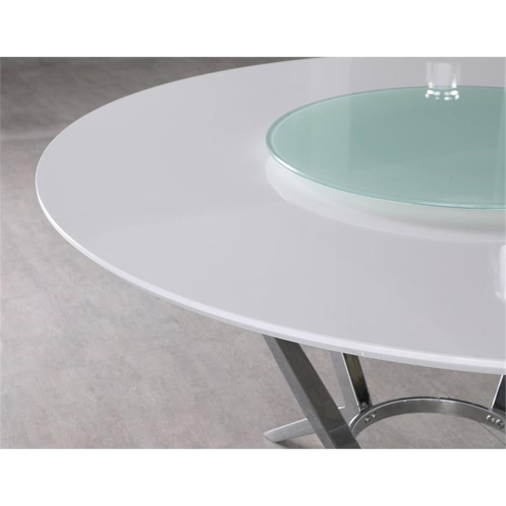 Include: One (1) table Finish: White and Chrome Materials: Glass, MDF, Metal Contemporary design that is both functional and attractive. You will enjoy every day dining in style Durable metal with a polished chrome finish combined with a high gloss white finish and textured gray chairs for that perfect harmony 54-inch diameter table can seat up to six and comes with a removable white glass lazy susan (24-inch dia) 24 inches dia white tempered glass, 8mm pencil edge Table top edge profile: Roundover bevel(top)/pencil edge (lazy susan) Leveler/ plastic glide: Leveler Shape: Round