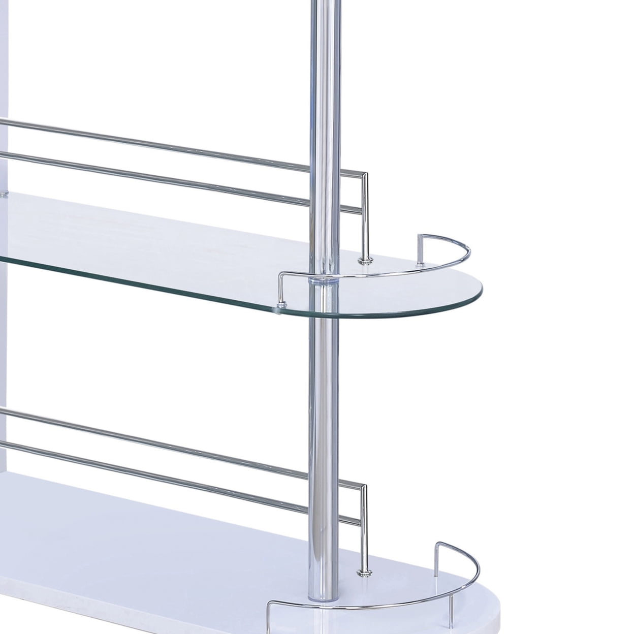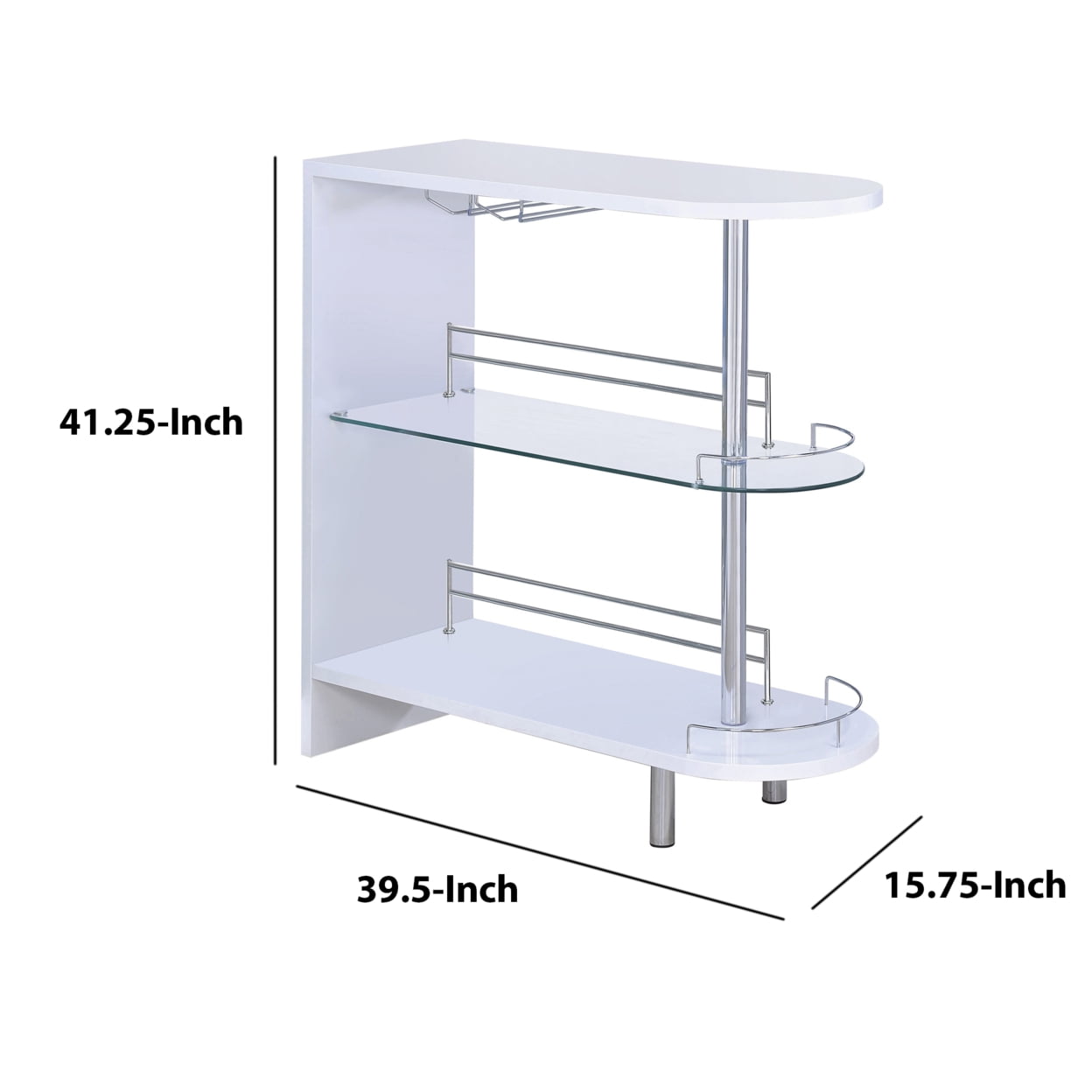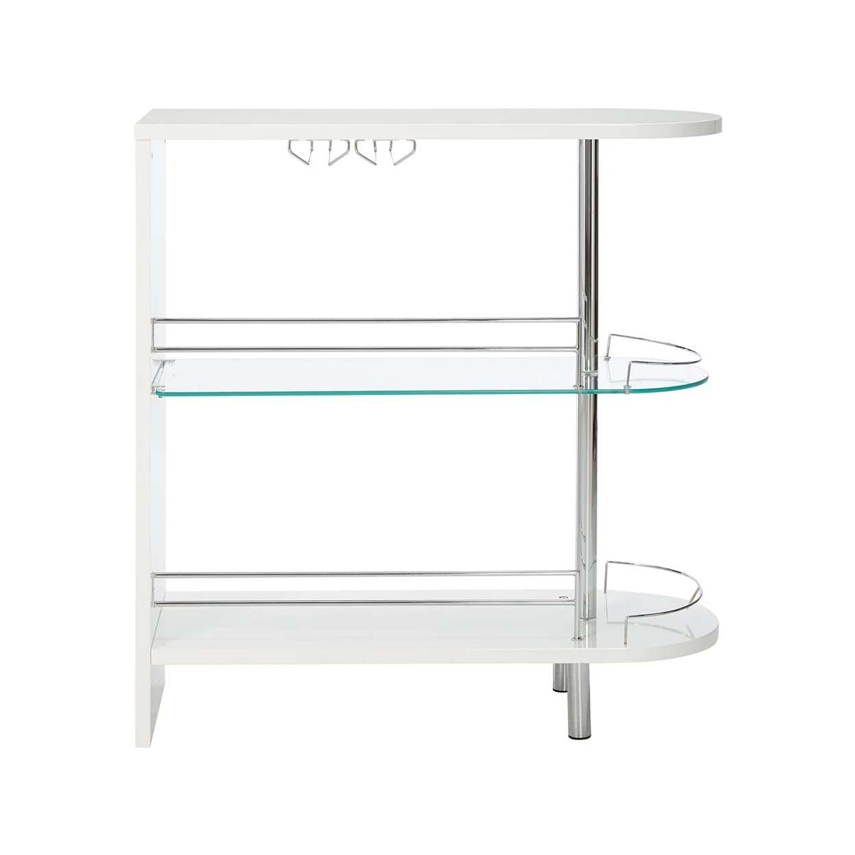 Includes: One (1) bar unit Finish: Glossy white and chrome Materials: MDF, Metal, Glass, Paper With PE Coating, Wood Rounded end adds an elegant feel to this glossy black bar unit Metal details, complete with chrome finish accentuate this modern piece Clear tempered glass shelf adds stability for your choice of spirits Storage features include two (2) tiers of shelving, including one (1) glass shelf with guardrails, and stemware racks Steel, MDF, and laminate construction Number of glassware capacity: 4 (2 glass holders) Width of the wine glass holder: 3.75″ Leveler/ plastic glide: Plastic glide Shape: Rectangular