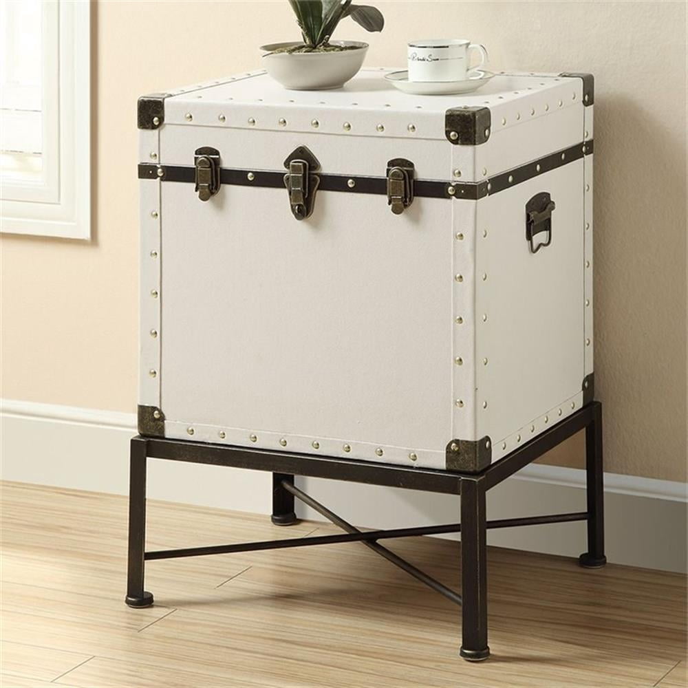 Includes: One (1) accent cabinet Finish: White Materials: PVC, MDF, Metal, Wood Accent table in white displays modern trunk style design Features nailhead trim and decorative front clasps Usable storage space inside The interior dimension of the trunk is 15.75″H x 16.73″W x 13.00″D The lid can stay open with holders. when the lid open, linear distance is 50.5cm (19.8″) Hardware type: Clasp Leveler/ plastic glide: Plastic glide