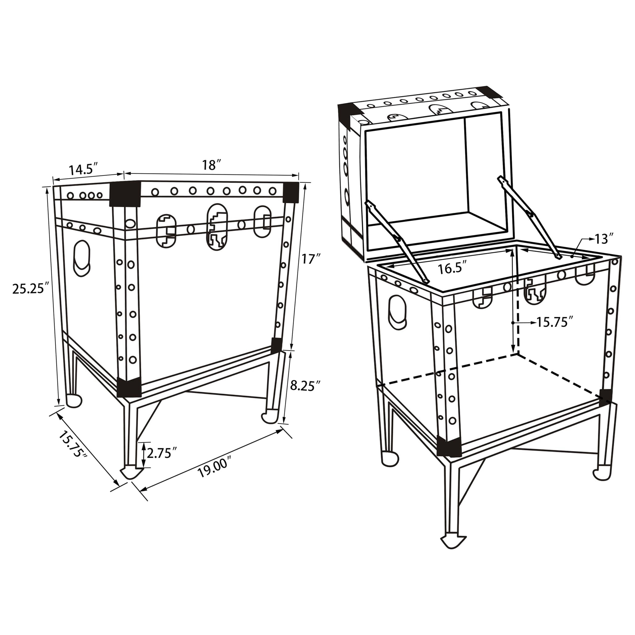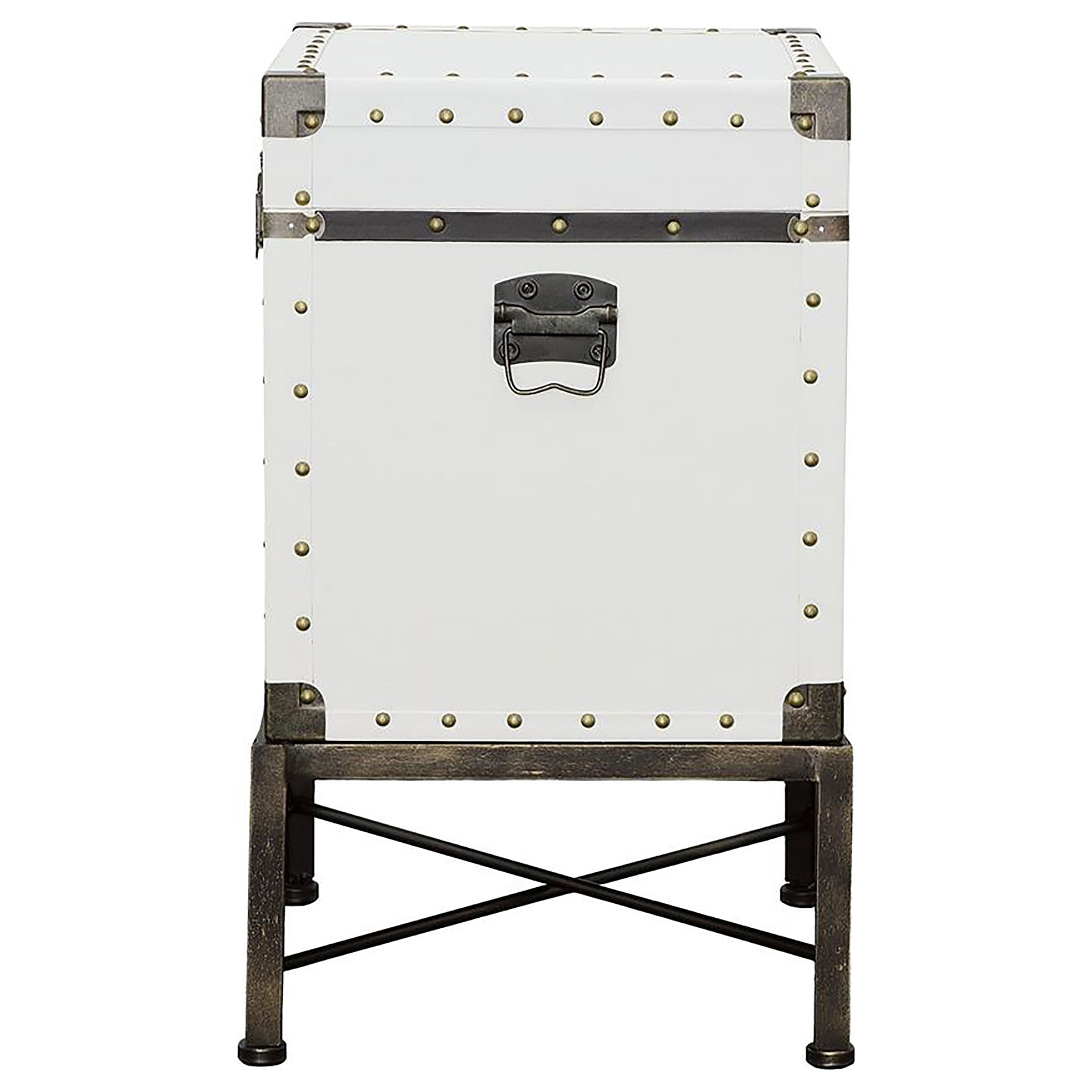 Pull out all the stops when outfitting a spirited theme room. Rich with character, this accent cabinet shows off a charming trunk-style build and trim package. Freshly covered in white, it wakes up a transitional space as it offers room for stashing linens and essentials inside. Nailhead trim and decorative front claps offer an industrial flavor. Dark metal legs with an ornate crossed support round out a host of fun features. Features: Includes: One (1) accent cabinet Finish: White Materials: PVC, MDF, Metal, Wood Accent table in white displays modern trunk style design Features nailhead trim and decorative front clasps Usable storage space inside The interior dimension of the trunk is 15.75″H x 16.73″W x 13.00″D The lid can stay open with holders. when the lid open, linear distance is 50.5cm (19.8″) Hardware type: Clasp Leveler/ plastic glide: Plastic glide Specifications: Product Dimensions: 25.25″H x 19″W x 15.75″D Product Weight: 21.5 lbs Assembly Required: No Warranty: One (1) year limited manufacturer warranty