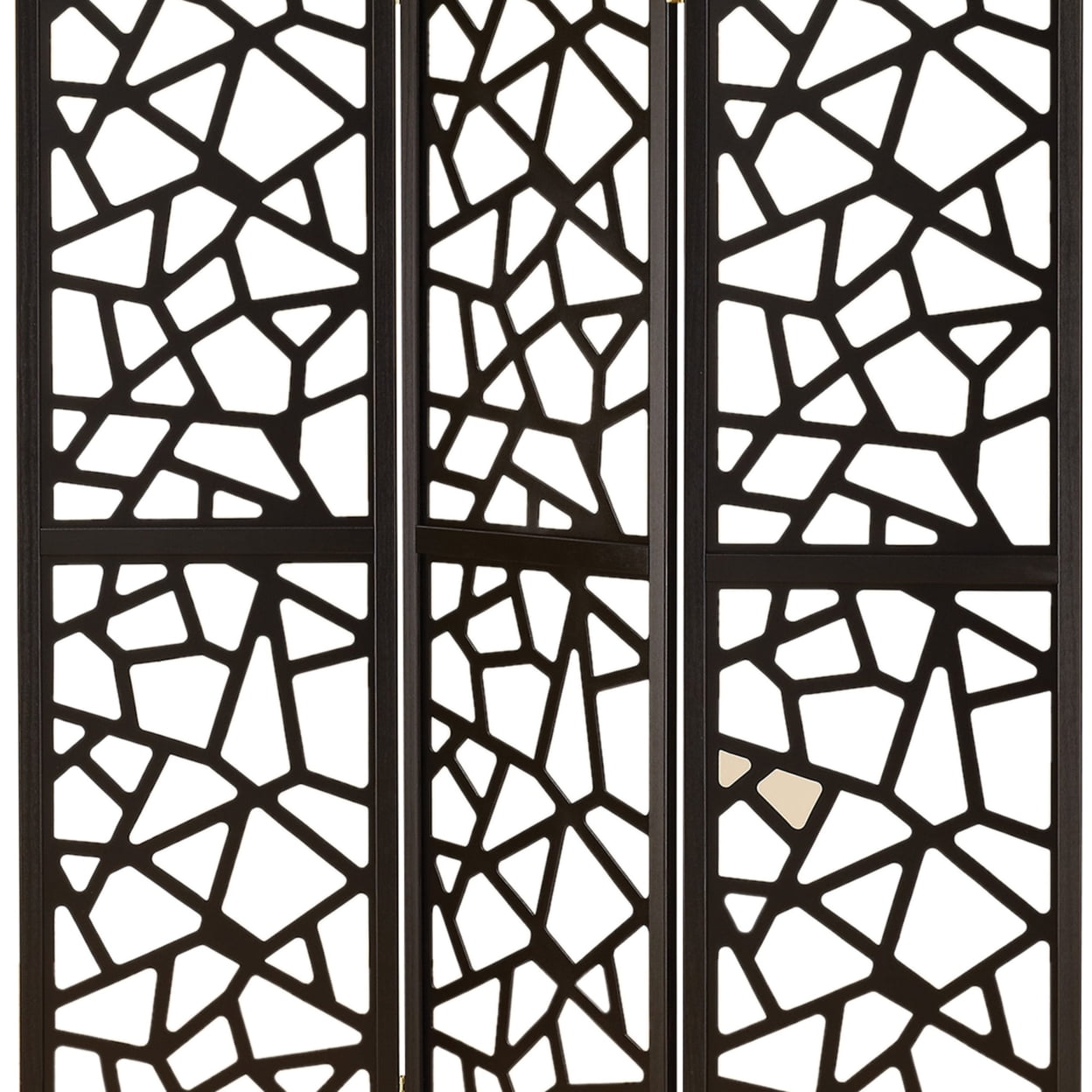Includes: One (1) folding screen Finish: Black Materials: MDF, Pine, Wood, Engineered Veneer Three-panel room divider with intricate open mosaic pattern Solid wood frame finished in black Constructed with FSC certified pine wood Type of pattern: Intricate mosaic cuts on each panel