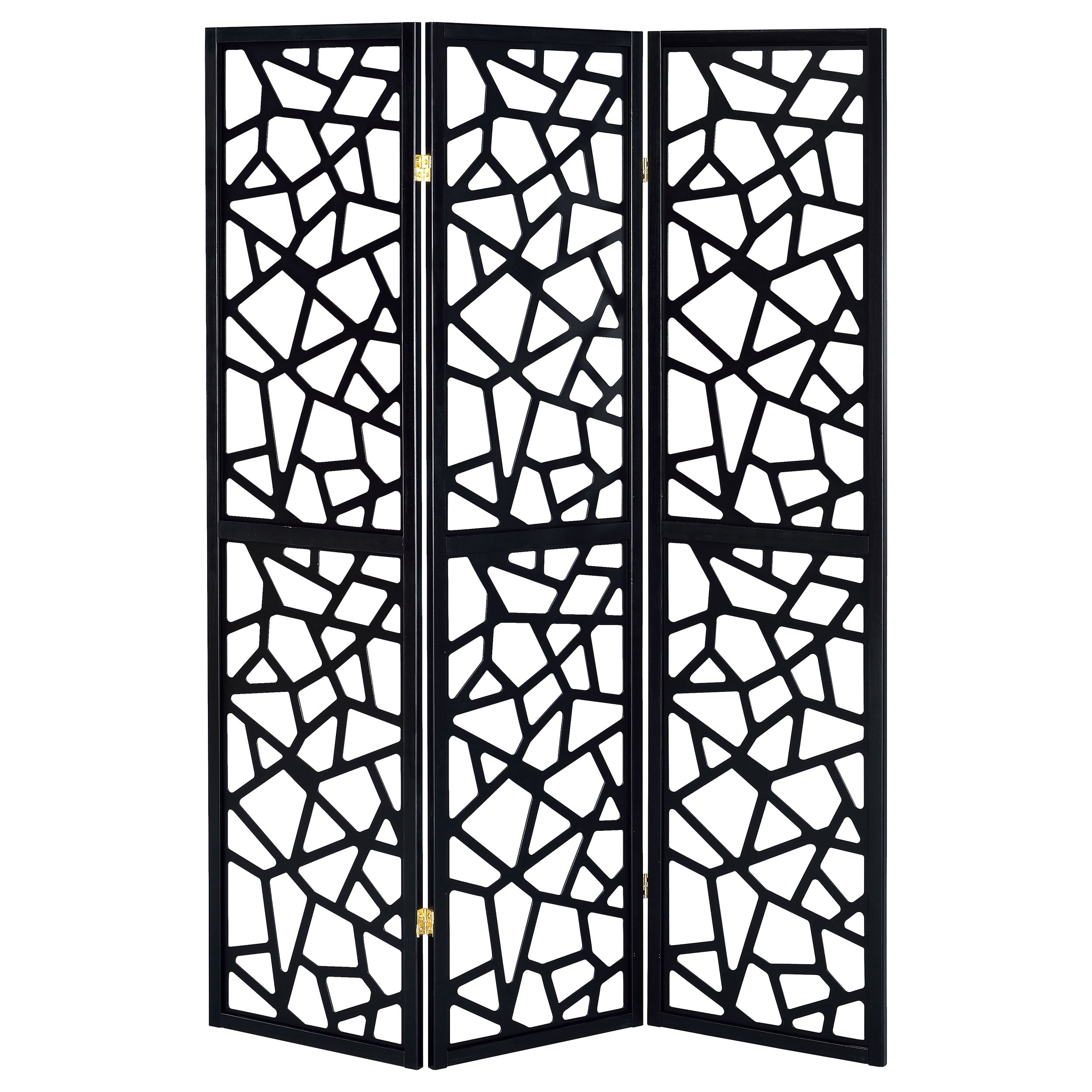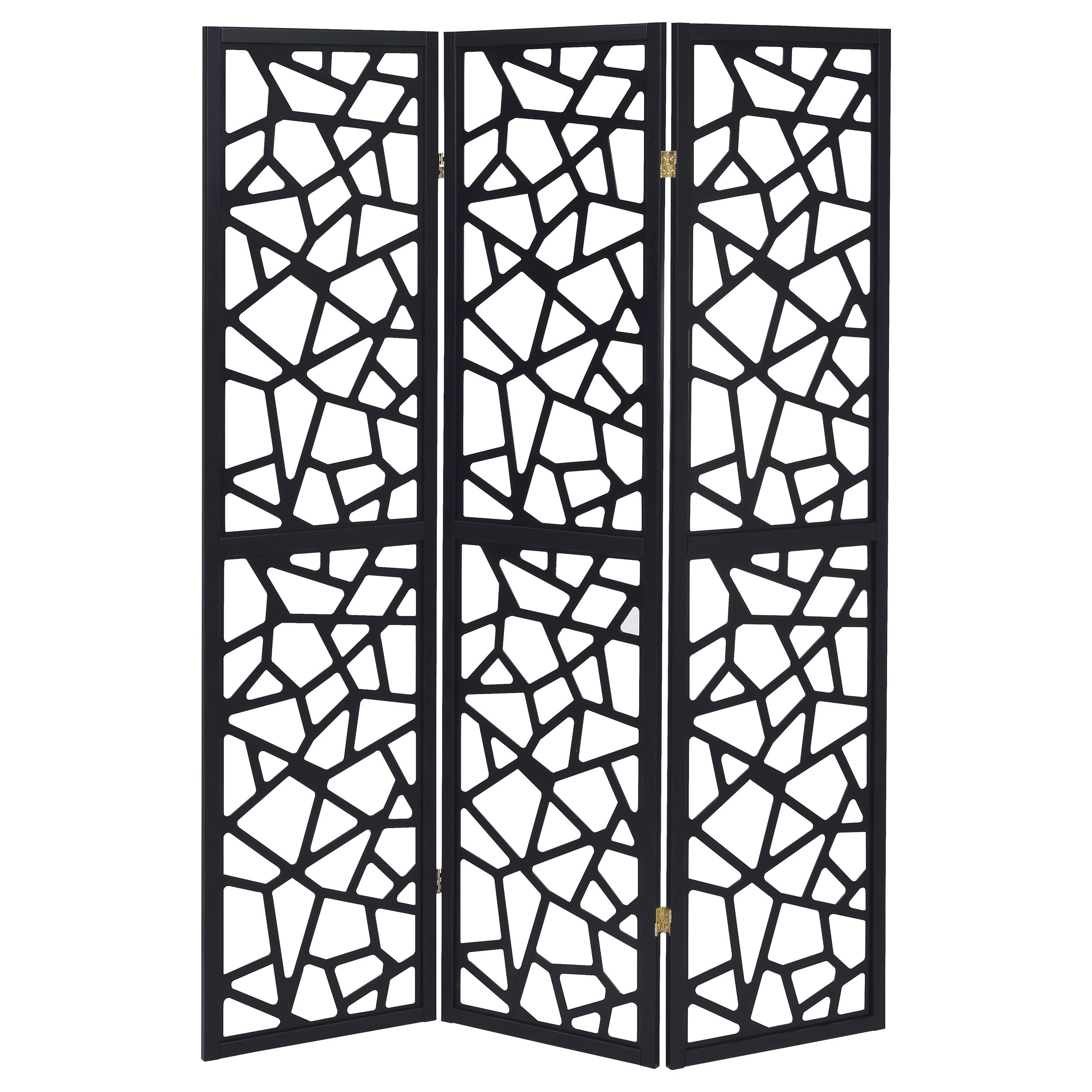 Energize a modern space in style. With a bold, chaotic pattern, this three-panel screen is a great choice for a modern or mid-century modern décor scheme. Black in finish, it offers eye-catching emphasis to a design pattern composed of intricate mosaic cuts. Three joined panels feature side hinges allowing for a variety of configurations. Place this dynamic screen as a true room divider, or as a standalone decor accent. Features: Includes: One (1) folding screen Finish: Black Materials: MDF, Pine, Wood, Engineered Veneer Three-panel room divider with intricate open mosaic pattern Solid wood frame finished in black Constructed with FSC certified pine wood Type of pattern: Intricate mosaic cuts on each panel Specifications: Product Dimensions: 70.25″H x 52″W x 0.75″D Product Weight: 13.2 lbs Assembly Required: No Warranty: One (1) year limited manufacturer warranty