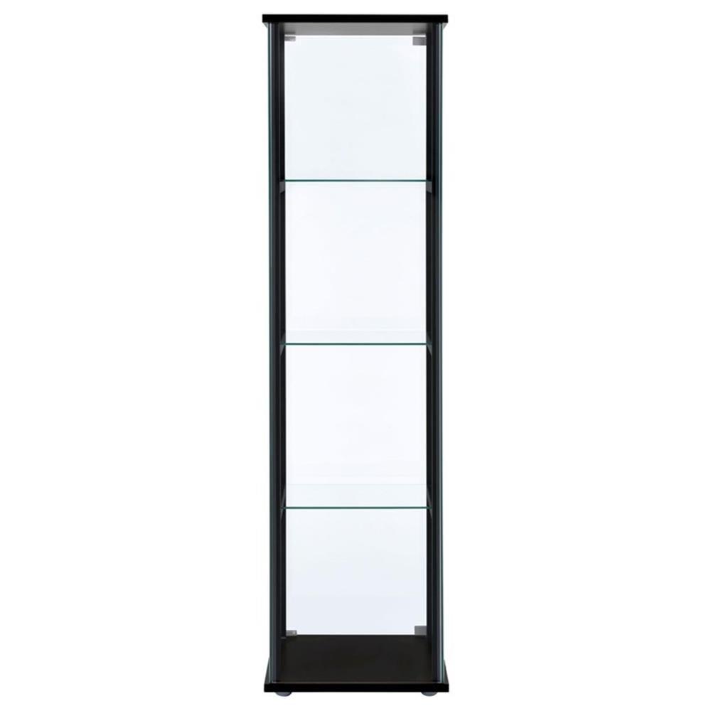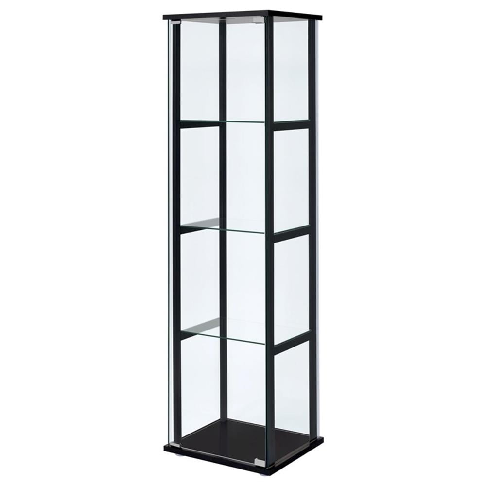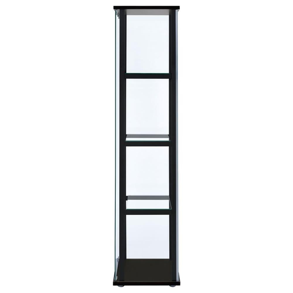 Ideal for a more compact space, this curio cabinet offers fresh and inspiring style. Simple linear design blends a slender black frame with tempered glass shelving. Push-to-open glass doors offer easy access to its interior space. This curio cabinet is an ideal venue for showcasing treasured decor and artwork. Add it to a tasteful seating ensemble or position it as an eye-catching standalone piece. Features: Includes: One (1) curio cabinet Wood finish: Black Glass: Clear tempered glass Materials: Glass, pine, particle board, engineered veneer, laminate Modern curio cabinet in black finish Featuring one reversible magnetic push-to-open clear tempered glass door for ease of access and strength Four tiers of shelving for additional display space Hardware type: Pull handle Specifications: Product Dimensions: 63.75″ H x 16.75″ W x 14.25″ D Product Weight: 80 lbs Number of Shelves: 4 Assembly Required: Yes Warranty: One (1) year limited manufacturer warranty