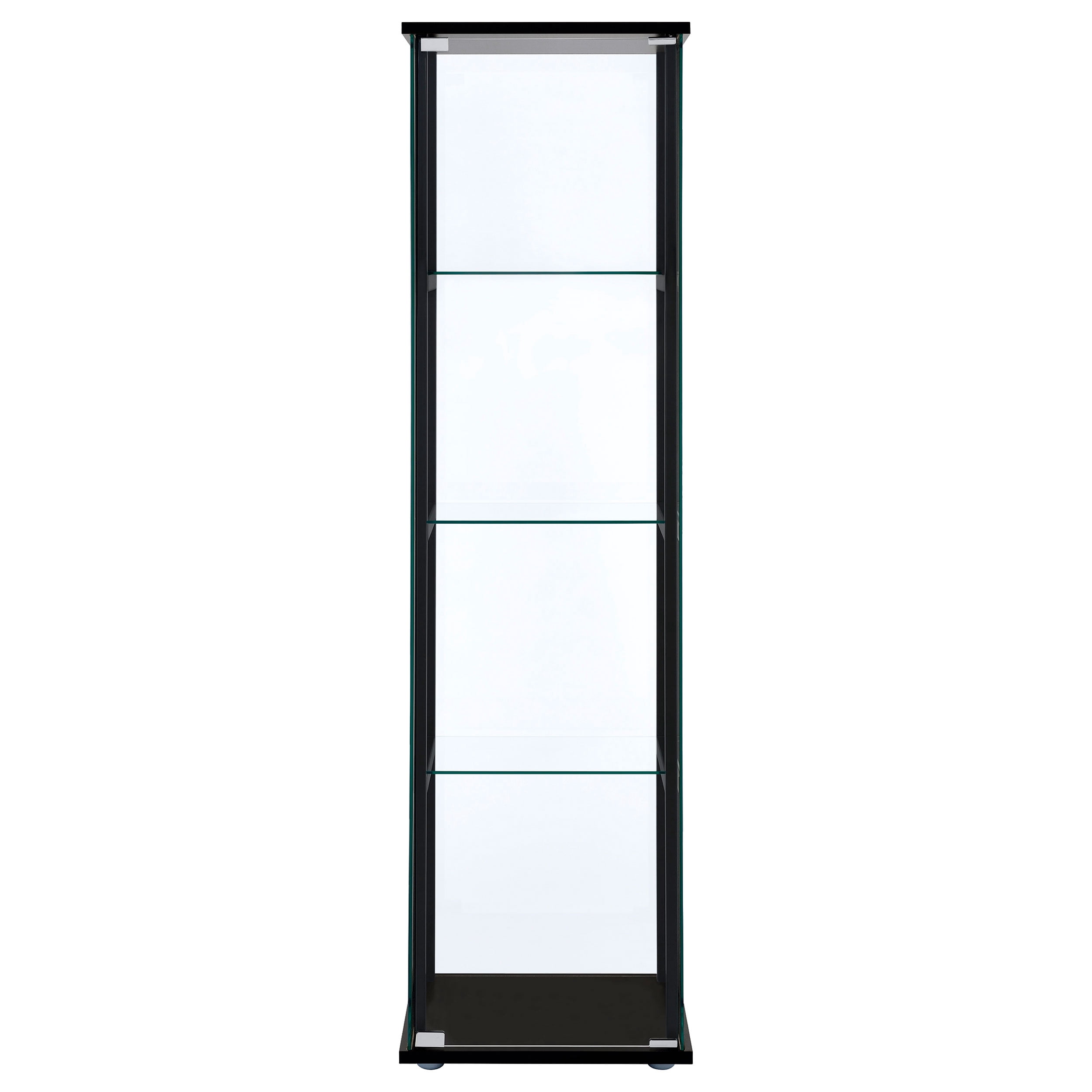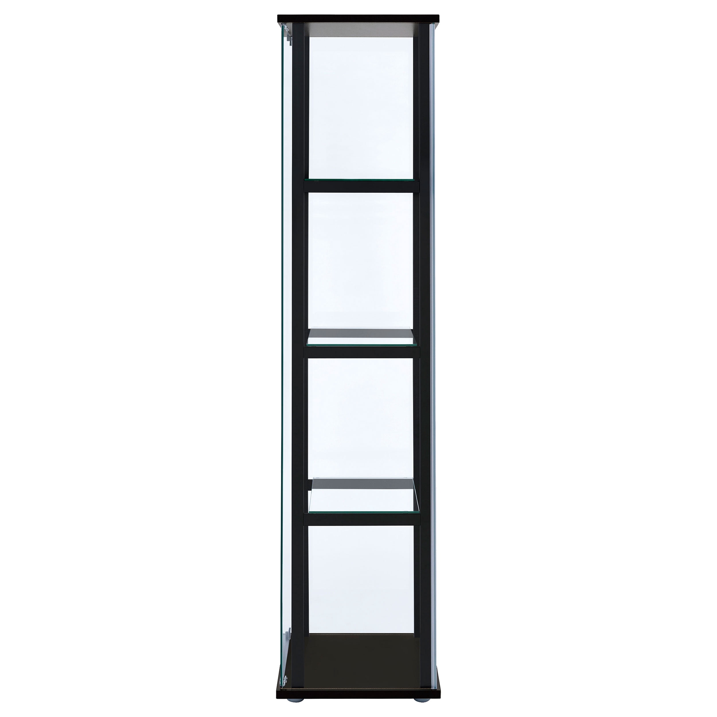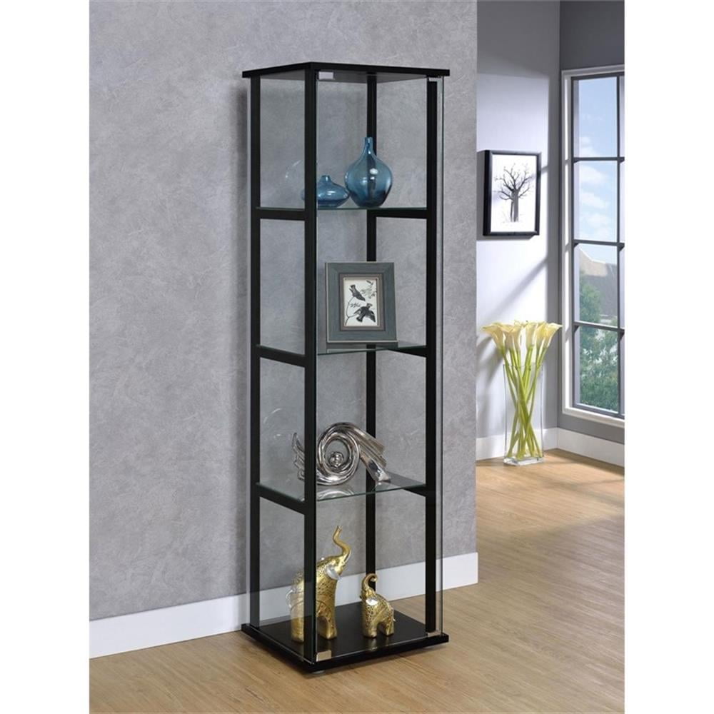 Ideal for a more compact space, this curio cabinet offers fresh and inspiring style. Simple linear design blends a slender black frame with tempered glass shelving. Push-to-open glass doors offer easy access to its interior space. This curio cabinet is an ideal venue for showcasing treasured decor and artwork. Add it to a tasteful seating ensemble or position it as an eye-catching standalone piece. Features: Includes: One (1) curio cabinet Wood finish: Black Glass: Clear tempered glass Materials: Glass, pine, particle board, engineered veneer, laminate Modern curio cabinet in black finish Featuring one reversible magnetic push-to-open clear tempered glass door for ease of access and strength Four tiers of shelving for additional display space Hardware type: Pull handle Specifications: Product Dimensions: 63.75″ H x 16.75″ W x 14.25″ D Product Weight: 80 lbs Number of Shelves: 4 Assembly Required: Yes Warranty: One (1) year limited manufacturer warranty