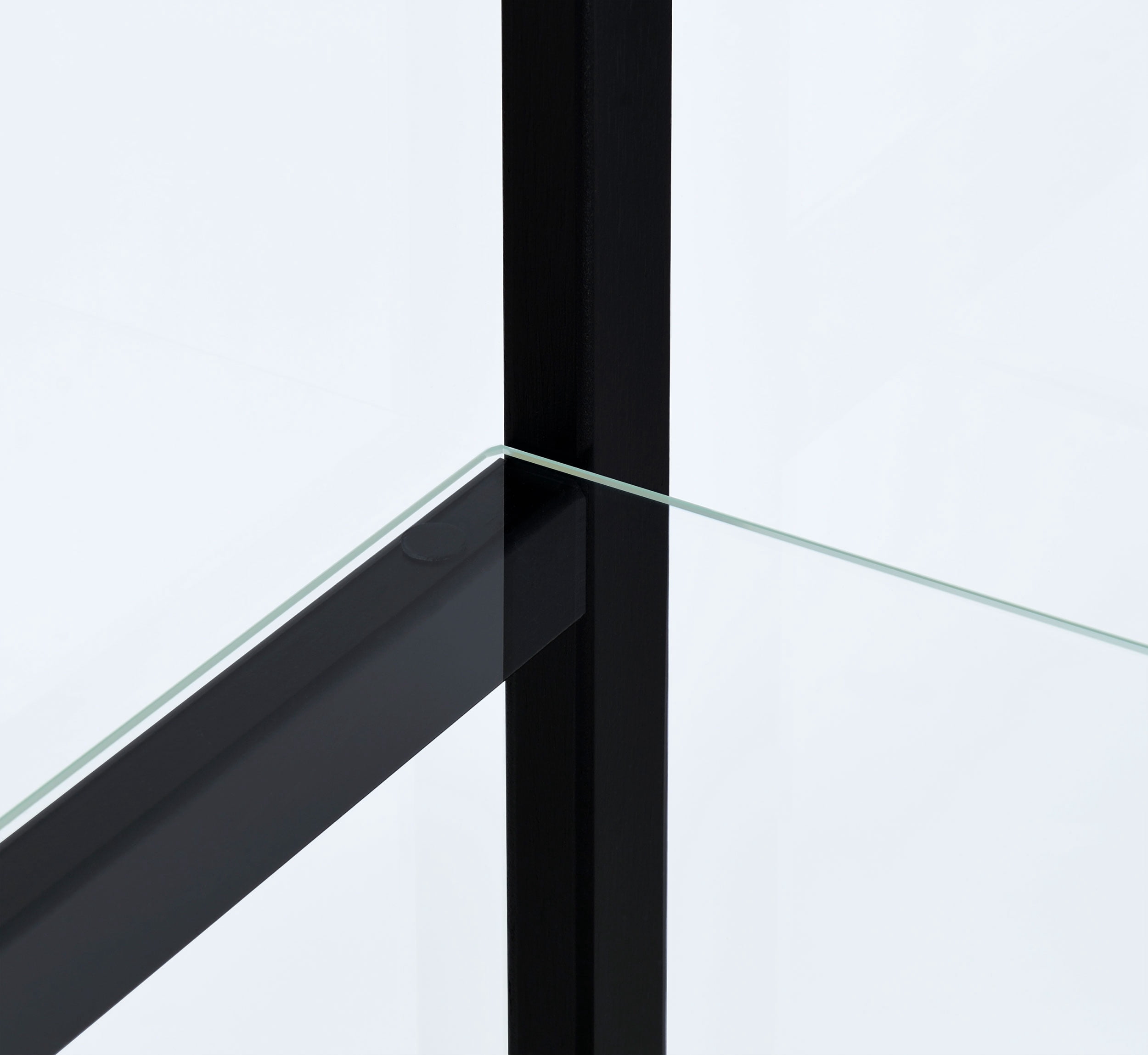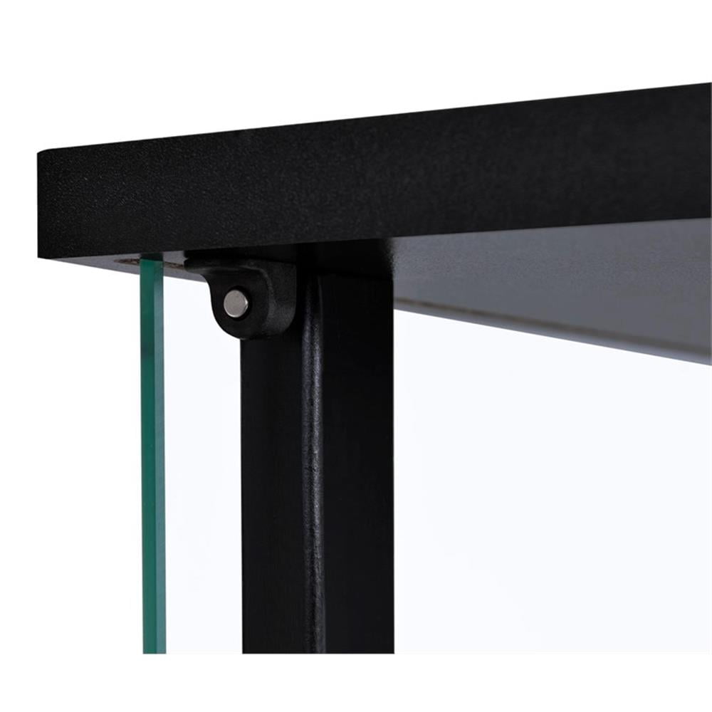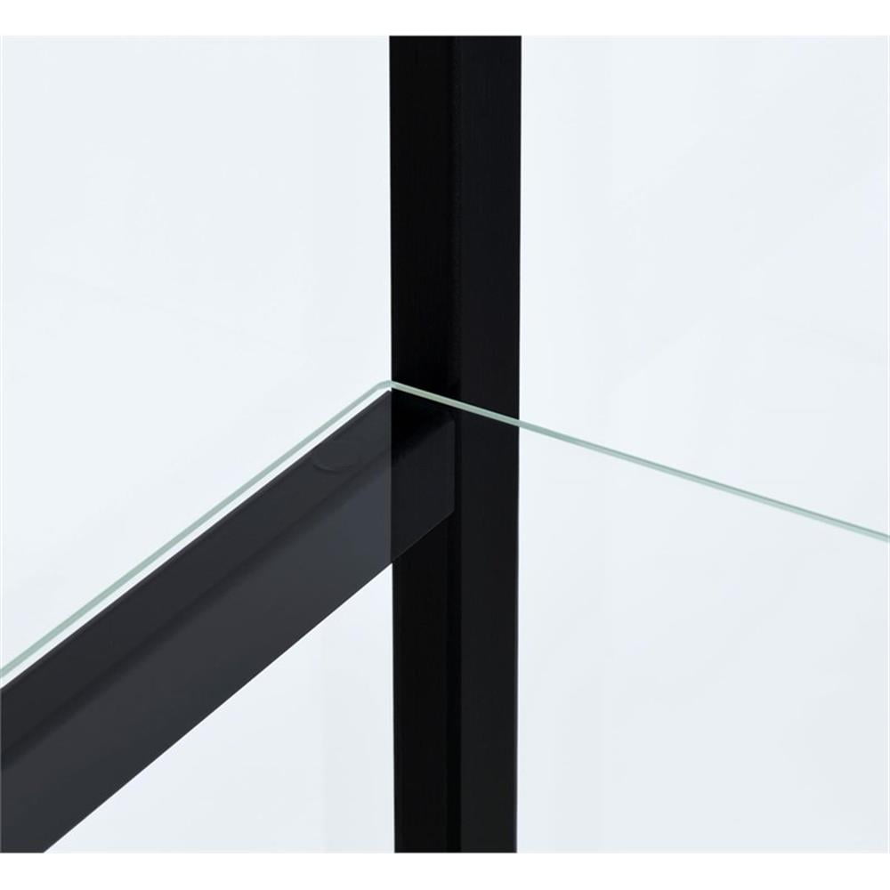Includes: One (1) curio cabinet Wood finish: Black Glass: Clear tempered glass Materials: Glass, pine, particle board, engineered veneer, laminate Modern curio cabinet in black finish Featuring one reversible magnetic push-to-open clear tempered glass door for ease of access and strength Four tiers of shelving for additional display space Hardware type: Pull handle