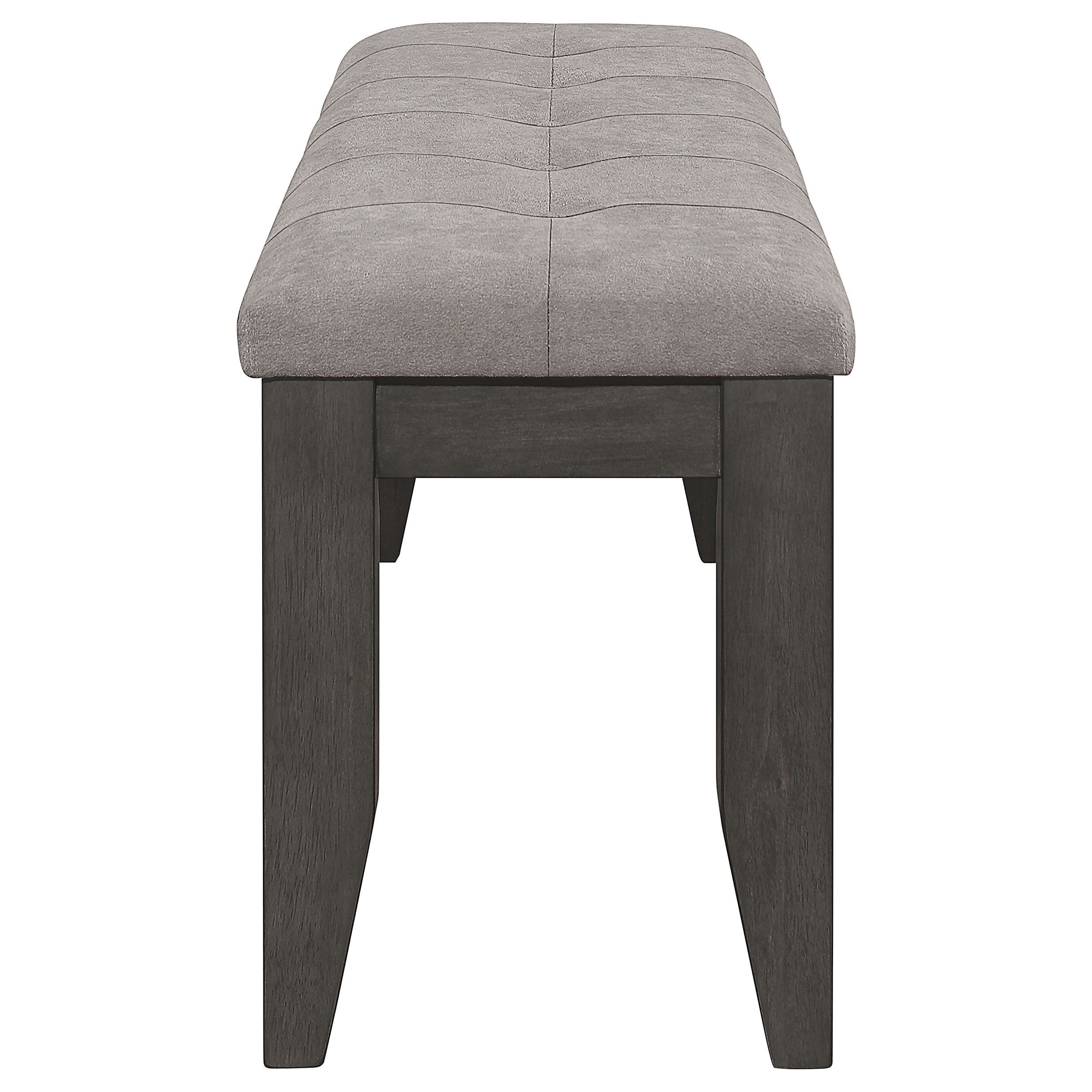 Includes: One (1) bench Wood finish: Dark Gray Upholstery: Gray fabric Materials: Asian hardwood, Asian tropical wood, fabric, foam The simple frame lends a contemporary touch and seats two comfortably The dark gray finish offers a rustic flair to dining spaces A button-tufted cushioned bench seat upholstered in a soft gray fabric offer a comfy resting place Straight, square legs offer a bold touch Seat construction: Box seat Cushion seat base: Plywood (9mm)