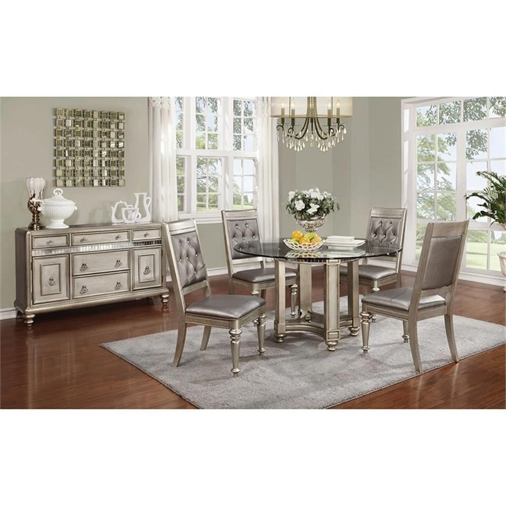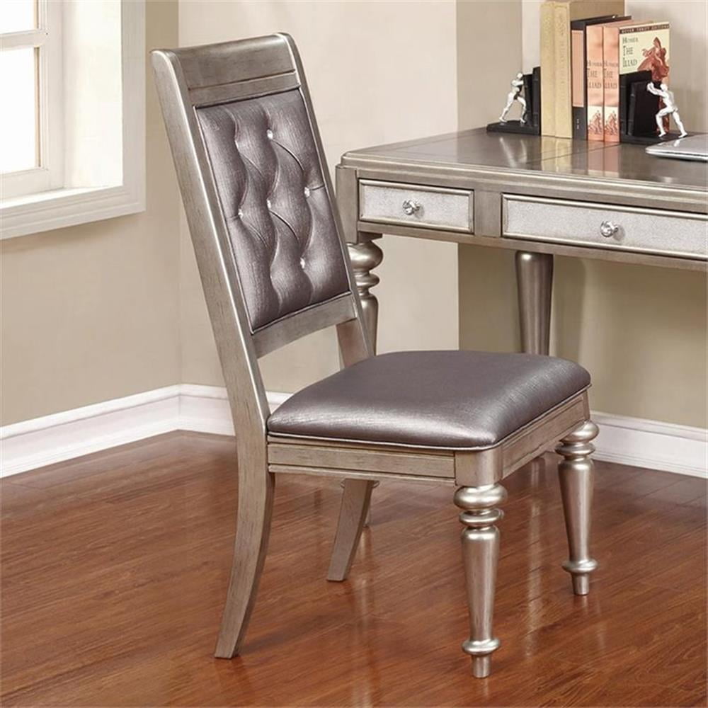 Button tufting creates a stylish pair of diamonds on this exceptional metallic dining side chair. Beautiful in a platinum metallic finish with hand-applied glazed highlights, this side chair is a glamorous addition to a regal dining room. Metallic faux leather adds another layer of dimensionality, while remaining easy to care for. Crystal buttons create a glittering effect. Turned-style front legs bring a touch of classic sophistication. Features: Includes: Two (2) dining chairs Finish: Metallic platinum Upholstery: Metallic Materials: Asian Hardwood, Faux Leather Material content: 40% resin, 30% ribbon, 30% cotton Cleaning code: X Glamorous platinum metallic finish with hand applied highlight glaze and curvaceous turned legs Sleekly styled chairs are upholstered in metallic faux leather with button tufted backs Crafted from Asian hardwood With plastic glide Seat construction: Seat frame Webbing base construction method: pirelli webbing with plywood 12mm Specifications: Product Dimensions: 41.25″H x 21.5″W x 24.5″D Product Weight: 46.3 lbs Seat Dimensions: 19″H x 18″D Weight Capacity: 300 lbs Assembly Required: Yes Warranty: One (1) year limited manufacturer warranty