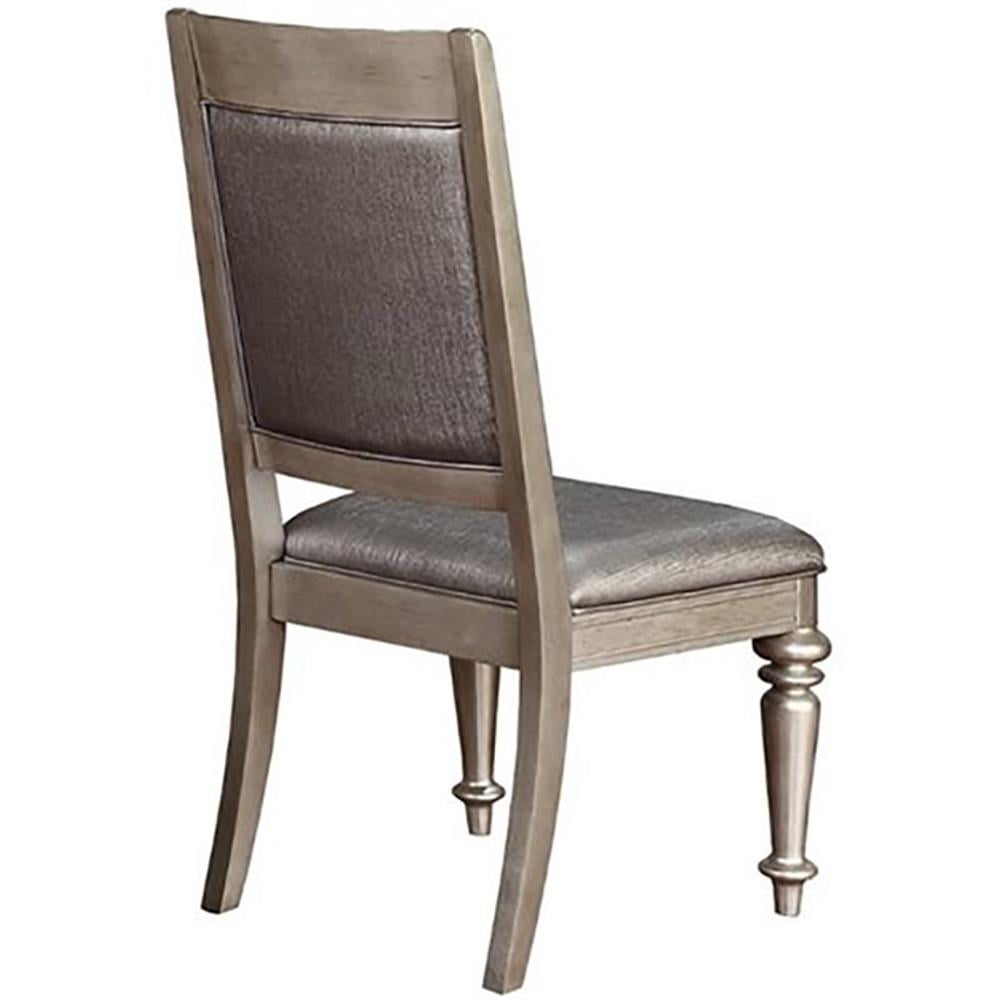 Includes: Two (2) dining chairs Finish: Metallic platinum Upholstery: Metallic Materials: Asian Hardwood, Faux Leather Material content: 40% resin, 30% ribbon, 30% cotton Cleaning code: X Glamorous platinum metallic finish with hand applied highlight glaze and curvaceous turned legs Sleekly styled chairs are upholstered in metallic faux leather with button tufted backs Crafted from Asian hardwood With plastic glide Seat construction: Seat frame Webbing base construction method: pirelli webbing with plywood 12mm
