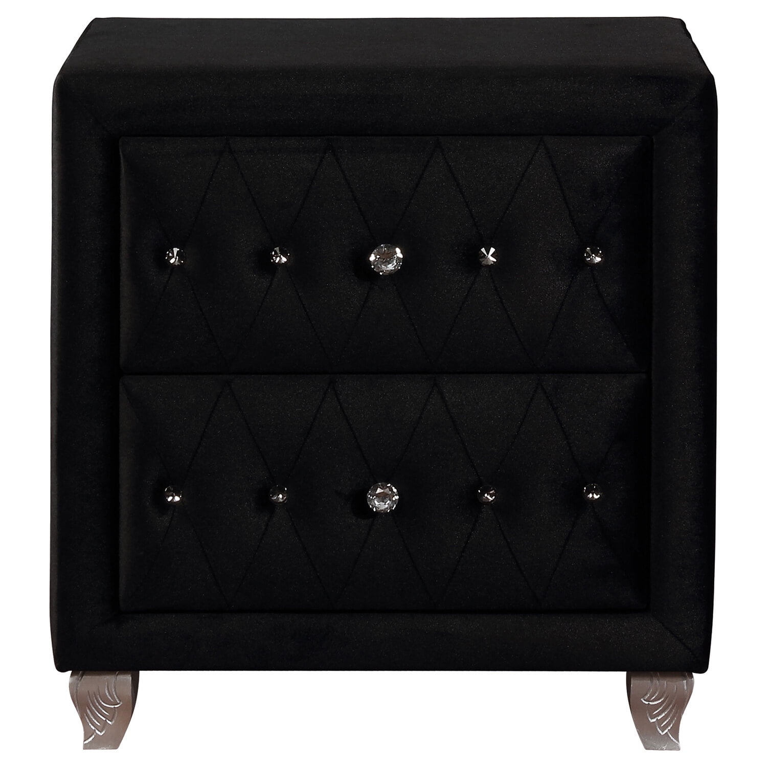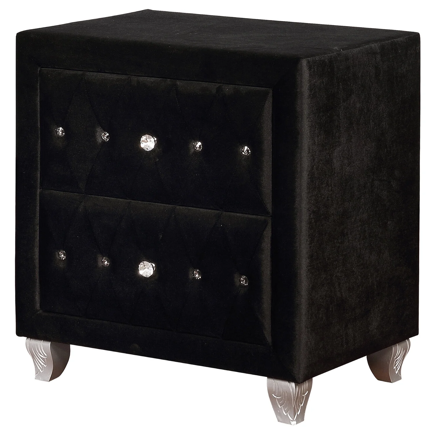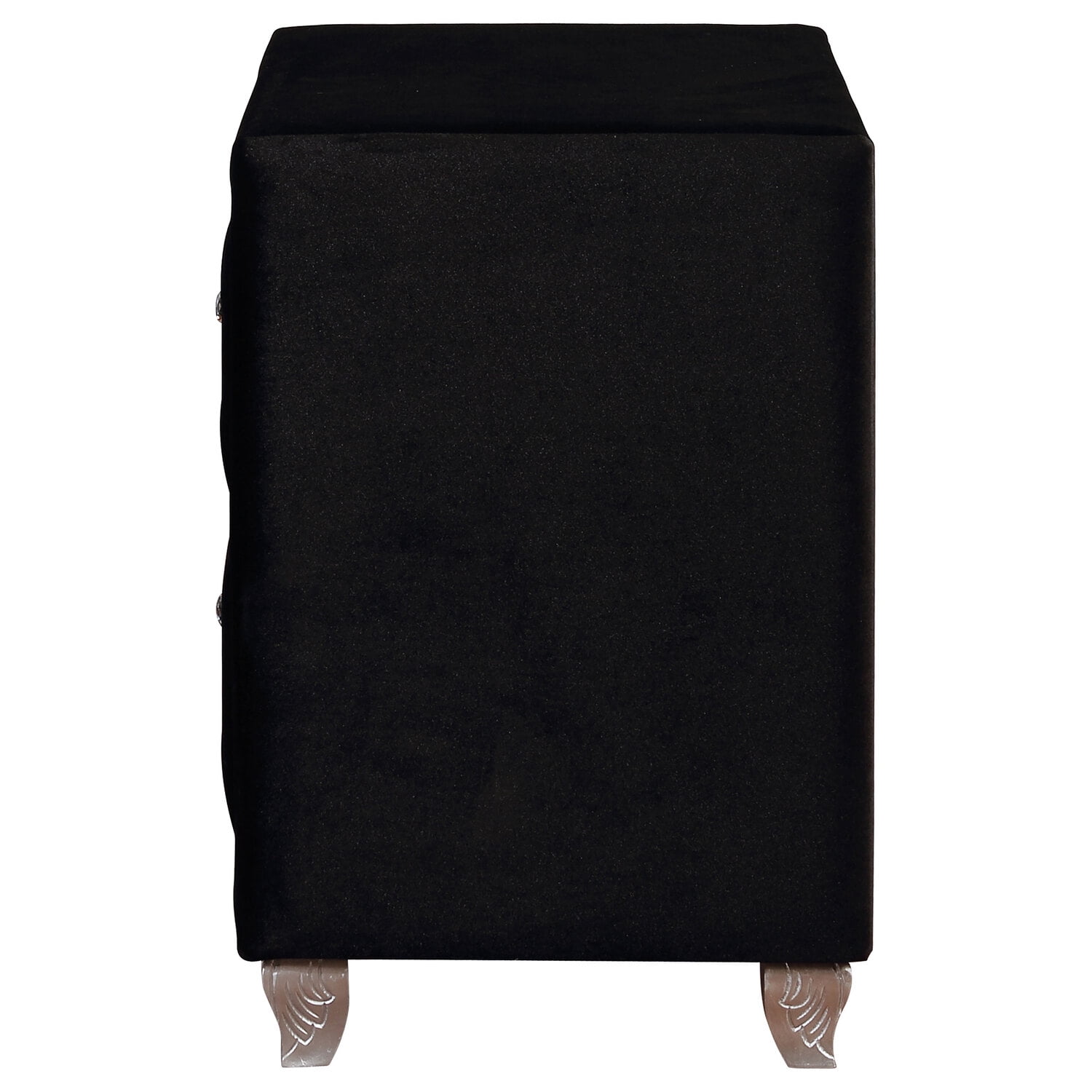 Glamorous and streamlined, this two-drawer black nightstand is full of fun details. Great for a chic bedroom, the sleek silhouette is covered in velvet fabric for a luxurious feel. Curved metallic legs add an extra layer of sophistication. Full of shine, the drawers feature crystal drawer pulls and lines of crystal button tufting. Decorate with a mirrored vase or jewelry box for a full-on stylish look. Features: Include: One (1) nightstand Upholstery: Black Leg finish: Metallic Materials: MDF, Plywood Create your ultimate retreat with a truly magical bedroom collection in black velvet Each collection piece is upholstered in plush, soft velvet and tufted with facetted buttons that sparkle perfectly Drawer joinery method: English dovetail Drawer box construction style: 5 pieces Drawer box – thickness of vertical panel: 9mm Drawer glides: Metal extension glide Drawer glide – size and length extension glide: 35mm x 9.84″L Drawer – felt lined: Yes, top drawer only Drawer – cedar line: No Drawer – tinted drawer: No Leveler/ plastic glide: No Hardware type: Crystal knob Drawers: Drawers vertical panel – Plywood; Bottom panel – Plywood Specifications: Product Dimensions: 27.5″H x 26″W x 18″D Product Weight: 50.04 lbs Number of Drawers: 2 Drawer Weight Capacity: 60 lbs Assembly Required: Yes Warranty: One (1) year limited manufacturer warranty