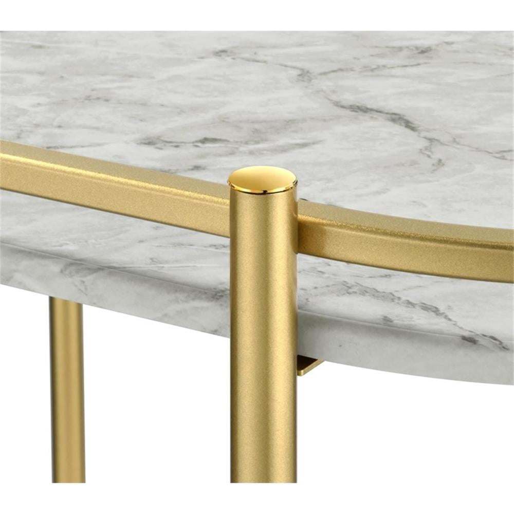 Invite guests over for an intimate soiree and serve up cocktails on this contemporary bar cart. Classic faux white marble shelves stack on top of one another, lending a traditional approach to its sleek modern silhouette. Rounded edges on one side add to the graceful appeal of the elongated shape. Designed in a metal frame with slim railing all around to keep bottles in place, this bar cart is ready to glide across floors. Lockable rolling casters secure it in place. Features: Includes: One (1) bar cart Finish: Faux White marble/Gold Materials: MDF, metal, PVC Perfect for contemporary dining spaces and entertaining guests Faux white marble shelves with rounded edges lend a traditional vibe A metal frame with a handlebar along one side makes it easy to push around Smoothly glide this cart from room to room with the lockable caster wheels Wine rack: 3 Shape: Rectangular Specifications: Product Dimensions: 32″ H x 18.5″ W x 29″ D Product Weight: 17.18lbs Assembly Required: No Warranty: One (1) year limited manufacturer warranty