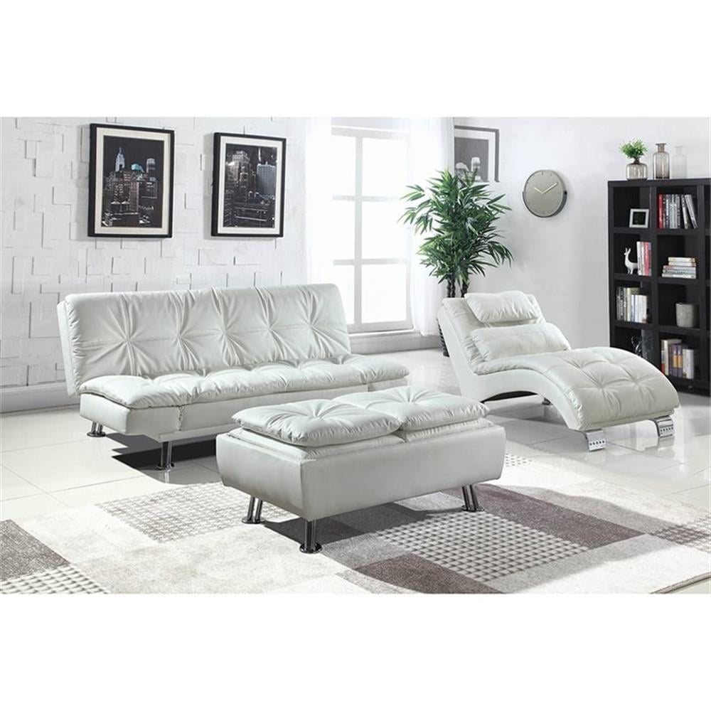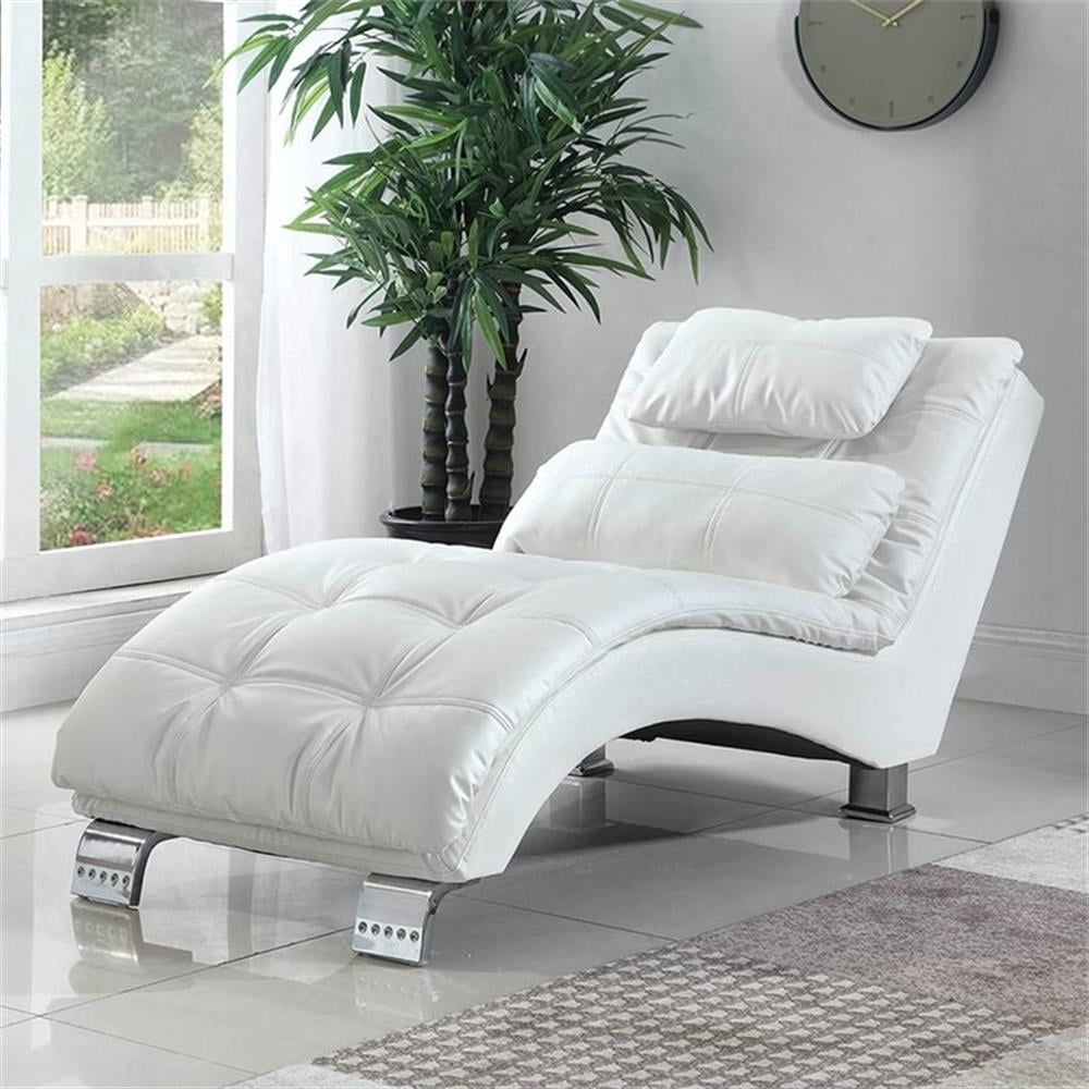 Set aside a spot for comfy resting in a modern space. This excellent chaise offers the ergonomic benefits of a contoured lounge with an eye-pleasing design. Covered in white faux leather, it’s both easy to care for and versatile enough to blend in a number of design schemes. Plush channeled padding and a pillow offer extra sensory pleasure. Stylish chrome finish metal feet pad its modern ambiance. Features: Includes: One (1) chaise Upholstery: White Leg finish: Chrome Materials: Hardwood, Metal, Plywood, PU Material content: 80% polyurethane, 20% polyester Cleaning code: W-S Ultra-cozy chaise lounge perfect for relaxing after a long day Cloud-like pillow top seat Plush channeled padding and pillow Component breakdown: Pillow top cushions Type of arm: Adjustable arm rests Type of stitching: White stitching Small pillow is already attached the chaise/ big pillow is detachable. Back upholstered with cover fabric Cushions: Back – Attached; Seat – Attached Leveler/ plastic glide: Plastic glide Decking construction: Seat – S-spring, wires; Back – Webbing, s-spring Specifications: Product Dimensions: 32″H x 29.5″W x 66.5″D Product Weight: 59.4 lbs Seat Dimensions: 16″H x 29.5″W x 44″D Assembly Required: Yes Warranty: One (1) year limited manufacturer warranty