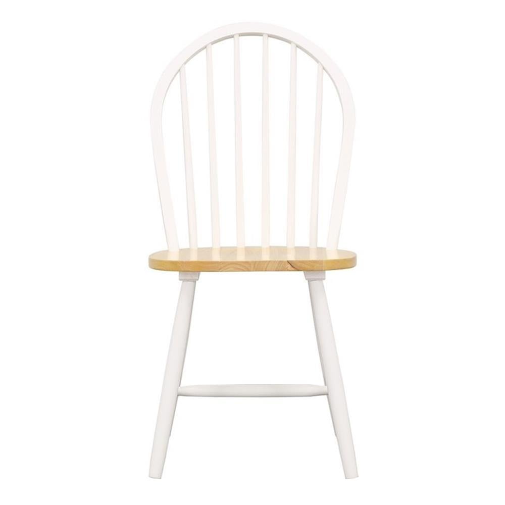 Includes: Four (4) dining chairs Finish: Natural Brown and White Materials: Rubberwood Two-tone white with natural wood tone for your country decor Curved stick back chairs are a timeless look Seat construction: L-shape back and seat Seat profile: Straight Leveler/ plastic glide: No No scoping
