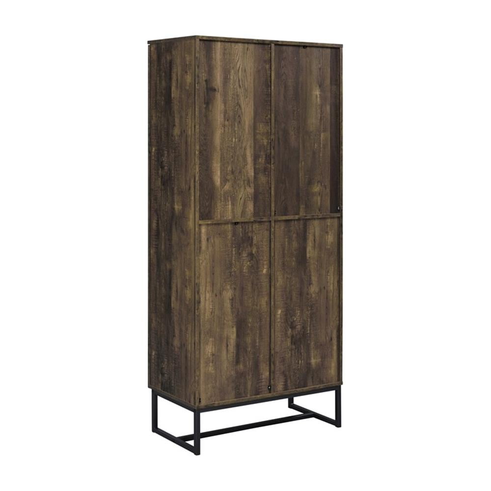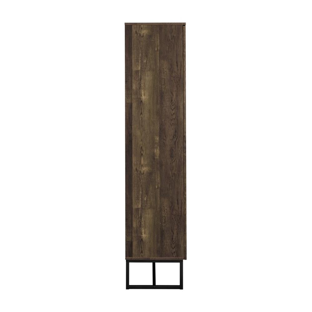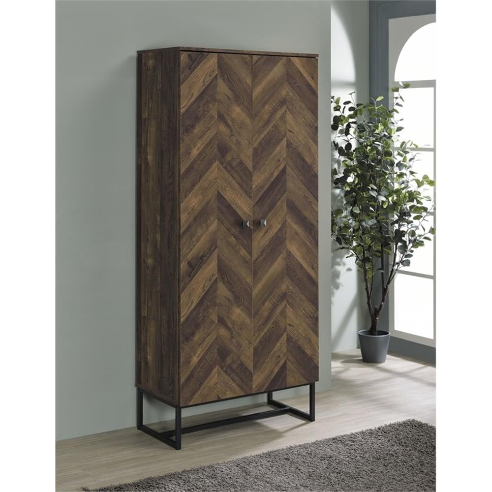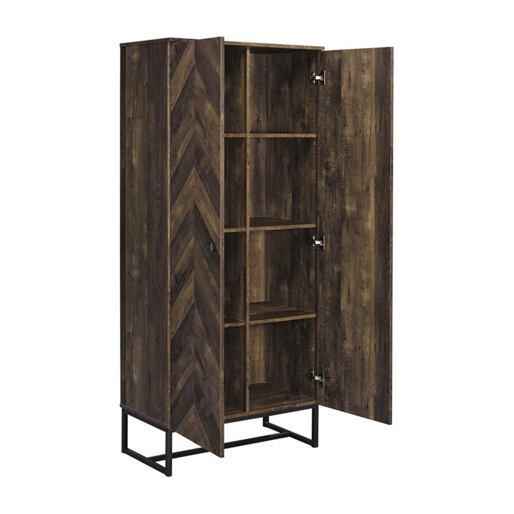 Covered in a rustic oak finish with a weathered herringbone pattern across the front, this tall, contemporary accent cabinet lends itself perfectly to a modern farmhouse living room, home office and more. Place it in a rustic-inspired dining room to hold platters and bowls or a living room to keep media like books and board games. Mounted on an open, slim heavy gauge steel base in a dark gunmetal finish, this handsome accent cabinet offers plenty of storage space inside. Tucked behind tall cabinet doors are six interior shelves for neatly organizing all your essentials. Mounted on each cabinet door are gunmetal finish square knobs as well. Features: Includes: One (1) accent cabinet Finish: Rustic Oak Materials: MDF, Metal, Melamine Paper, Particle Board, Wood Features eight storage compartments Heavy gauge steel base powder coated in gunmetal Constructed with MDF, particle board, steel, and engineered laminate Number of compartments: 8 Hardware type: Metal knob Leveler/ plastic glide: Plastic glide Specifications: Product Dimensions: 70.75″H x 31.5″W x 15.75″D Product Weight: 116.6 lbs Number of Doors: 2 Number of Shelves: 8 Assembly Required: Yes Warranty: One (1) year limited manufacturer warranty