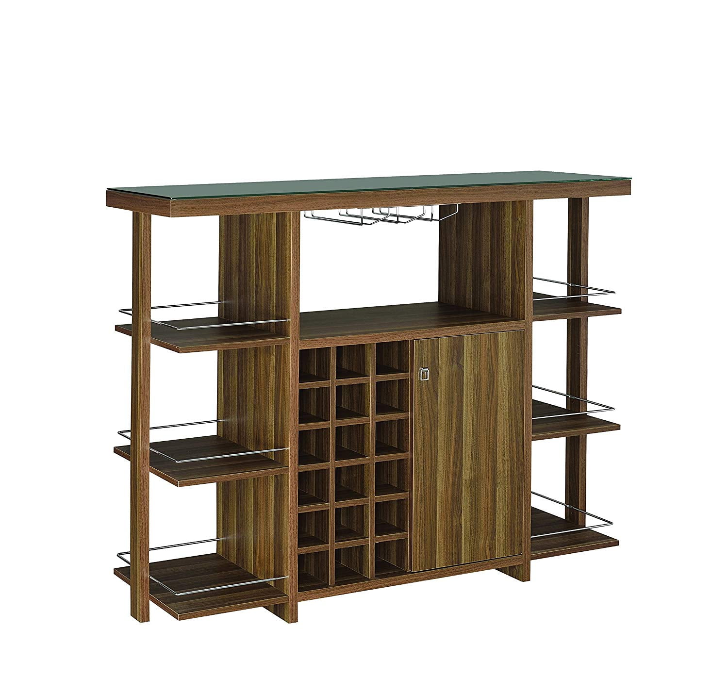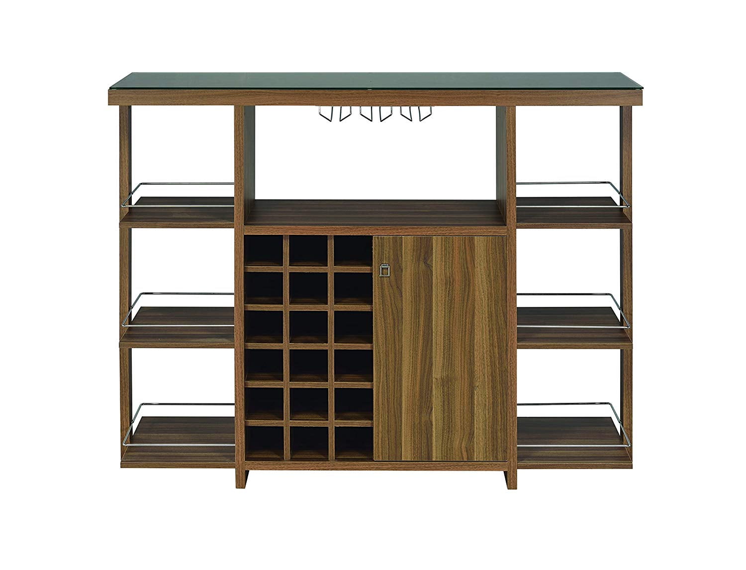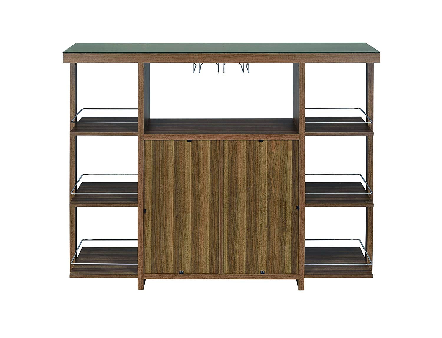 Complete a modern minimalist motif with the sleek lines from this walnut bar unit. Display your favorite glass stemware on the wine glass holders or on the six side shelves. In a warm hue, the open silhouette looks elegant with a shiny metallic guardrail that helps to secure belongings. A built-in eighteen bottle wine rack is great for the social entertainer. Enjoy a freshly poured libation around the bar, perfect for a transitional space or versatile living room. Features: Includes: One (1) bar cabinet Finish: Walnut Metal finish: Chrome Materials: MDF, Particle Board, Hollow Board, Engineered Veneer, Metal Modern bar cabinet with walnut finish sets the tone for any room you choose Increased storage space with three (3) tiers of shelving with guardrails on both sides A clear tempered glass top provides strength and style Adjustable shelf cabinet, stemware racks, and eighteen (18) bottle wine rack allow for beverage variety while entertaining MDF, particle board, and laminate construction Goblet holder:3 Hardware type: Ring pull Glassware capacity: 9 (3 sets glass holders) Number of compartments: 2 Width of the wine glass holder: 2.95″ (75mm) Leveler/ plastic glide: Plastic glide Shape: Rectangular Specifications: Product Dimensions: 43″H x 54″W x 15.5″D Product Weight: 126.5 lbs Wine Bottle Capacity: 18 Assembly Required: Yes Warranty: One (1) year limited manufacturer warranty