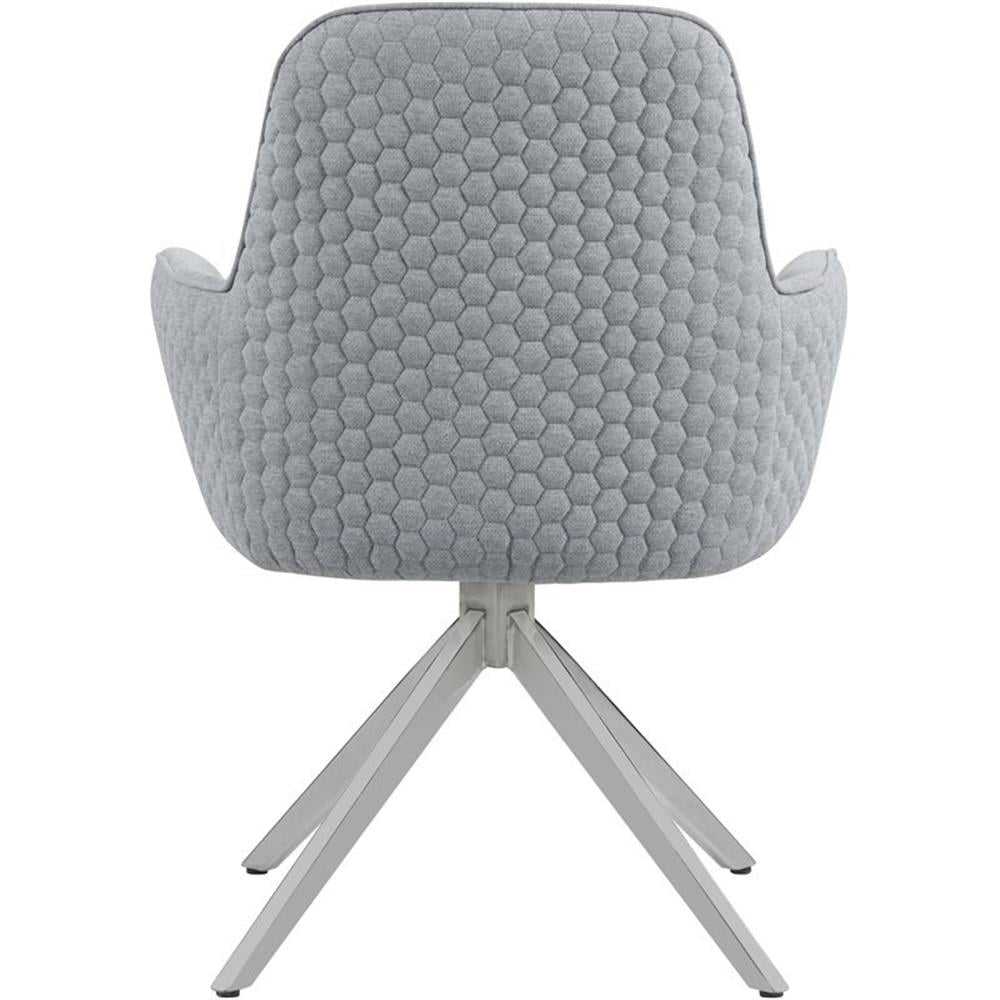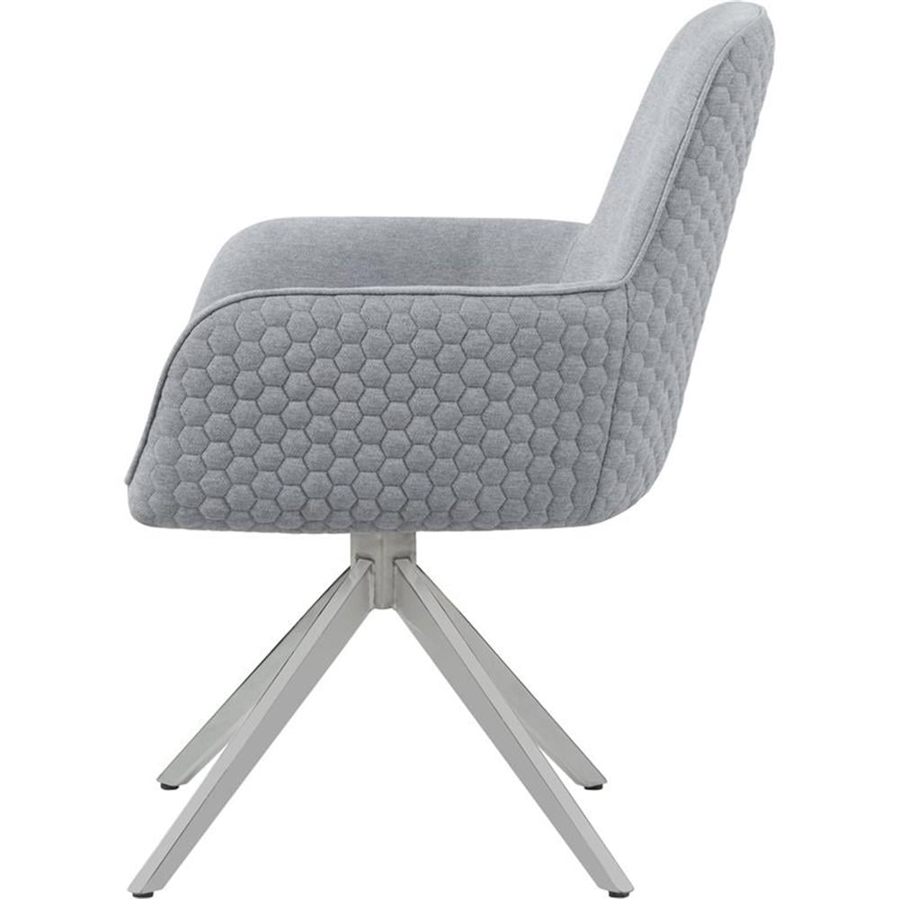 Includes: One (1) dining chair Leg finish: Chrome Upholstery: Light Gray Materials: Fabric, Metal, Foam, Plywood Material content: 100% polyester Cleaning code: S Chairs have low arms, 360 degrees swivel base , wide seating, and are accented with gray honeycomb quilted fabric Type of swivel of plate: 360 degree The height from floor to top of arm is 24.5″ Leveler/ plastic glide: Plastic glide