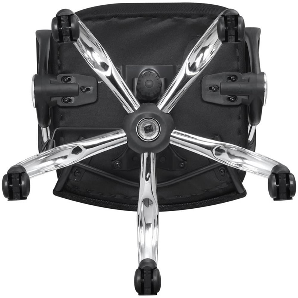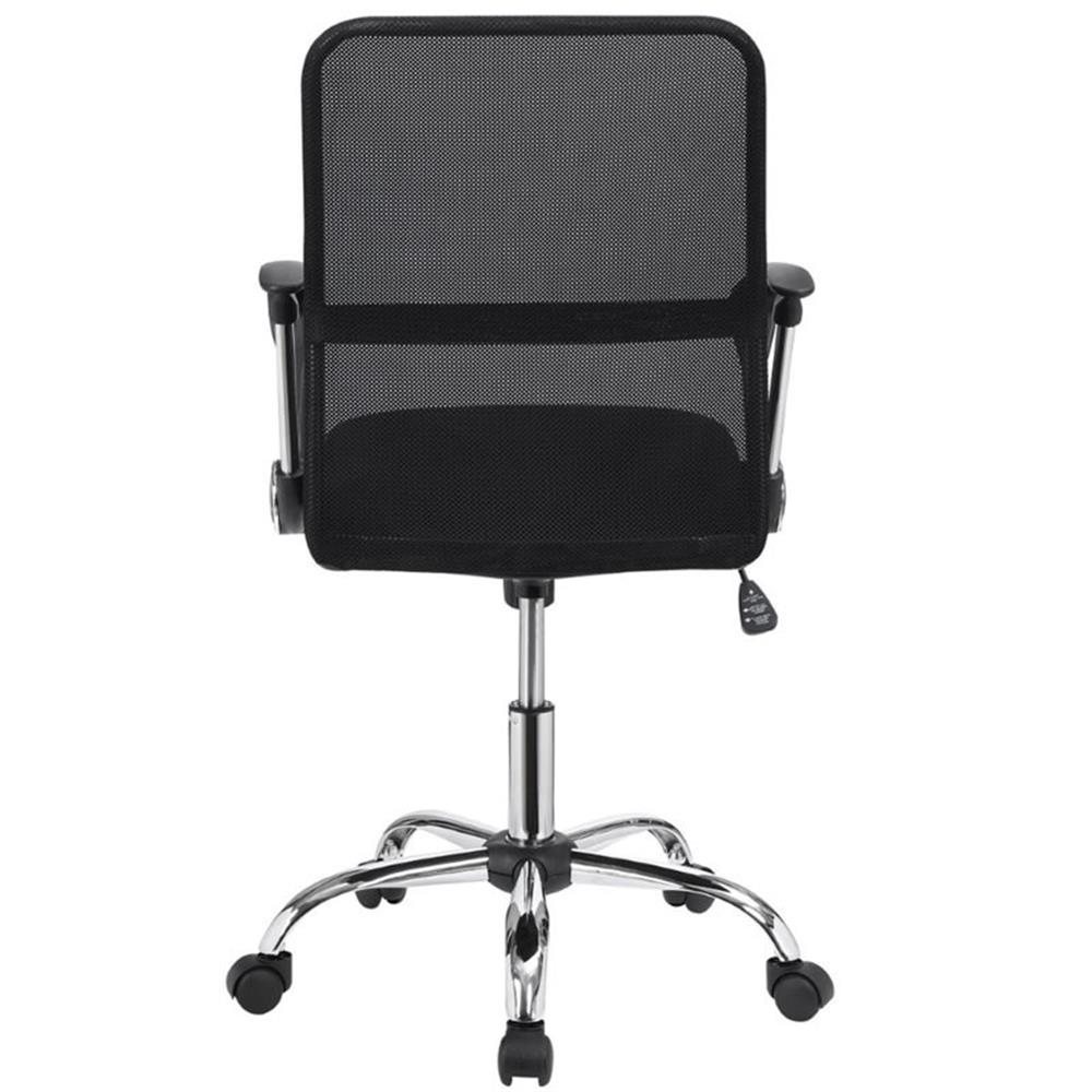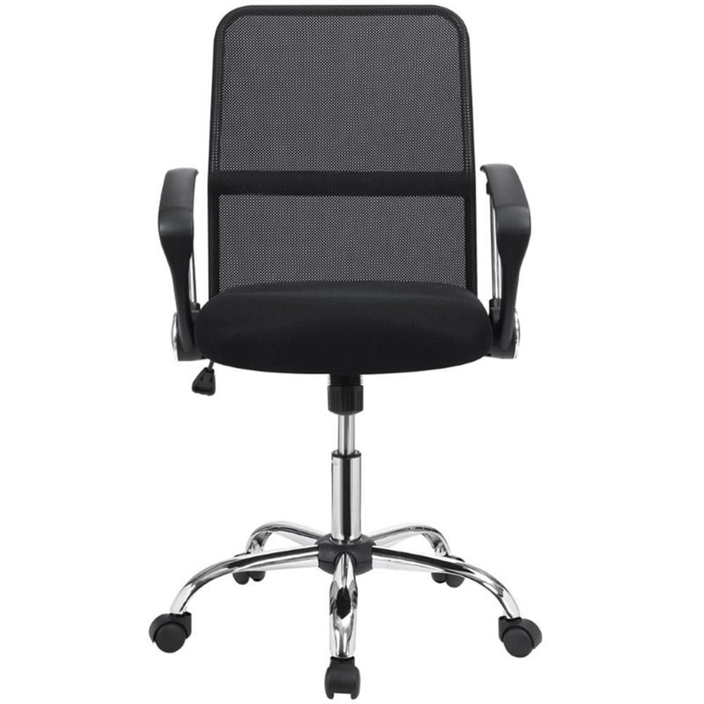Make work a pleasure. This stylish black office chair reflects an improvement on conventional chairs with its ergonomically positive build. Breathable fabric makes its seat back airy and light. Slender armrests unattached to its seat back allow more flexibility in movement. Adjust seat height positions to meet your needs. Features: Set includes: One (1) office chair Upholstery: Black Metal finish: Chrome Materials: Plywood, Fabric Seat construction: Upholstered Scoping seat: Yes Diameter and material of base: 350 wire Type of mechanism: Butterfly Type of base: Five-star base Type of mechanism: Swivel, height adjustable, tilt with lock function Function of armrest: Fixed The minimum angle of upright chair back: 96 degree The maximum angle when chair back tilt: 126 degree Backrest distance range from wall: 5″ Specifications: Product Dimensions: 36.75″ – 39.75″H x 23.25″W x 24″D Product Weight: 24.42 lbs Seat Dimensions: 19″ – 22″H x 19″W x 17.75″D Adjustability: Seat height Assembly Required: Yes Warranty: One (1) year limited manufacturer warranty