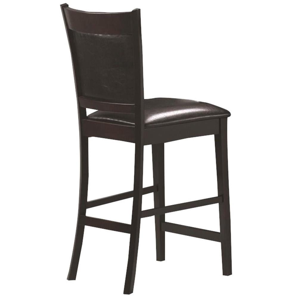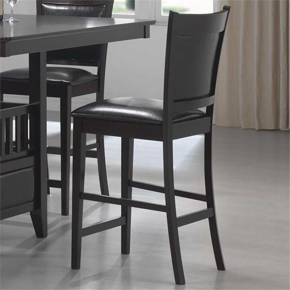 Includes: Two (2) counter height stools Leg finish: Espresso Upholstery: Black Materials: Asian Hardwood, Asian Tropical Wood, Faux Leather, Foam Materials content: 40% polyvinyl chloride, 40% tetoron cotton, 20% polyurethane Cleaning code: W Transitional counter height collection in chic espresso finish Crafted from select hardwoods and okume veneers Streamlined counter stools feature black faux leather upholstery on seat and back cushions Cushions: Attached Seat construction: Side rail Type of pattern: Seat and back cushion Leveler/ plastic glide: Plastic glide