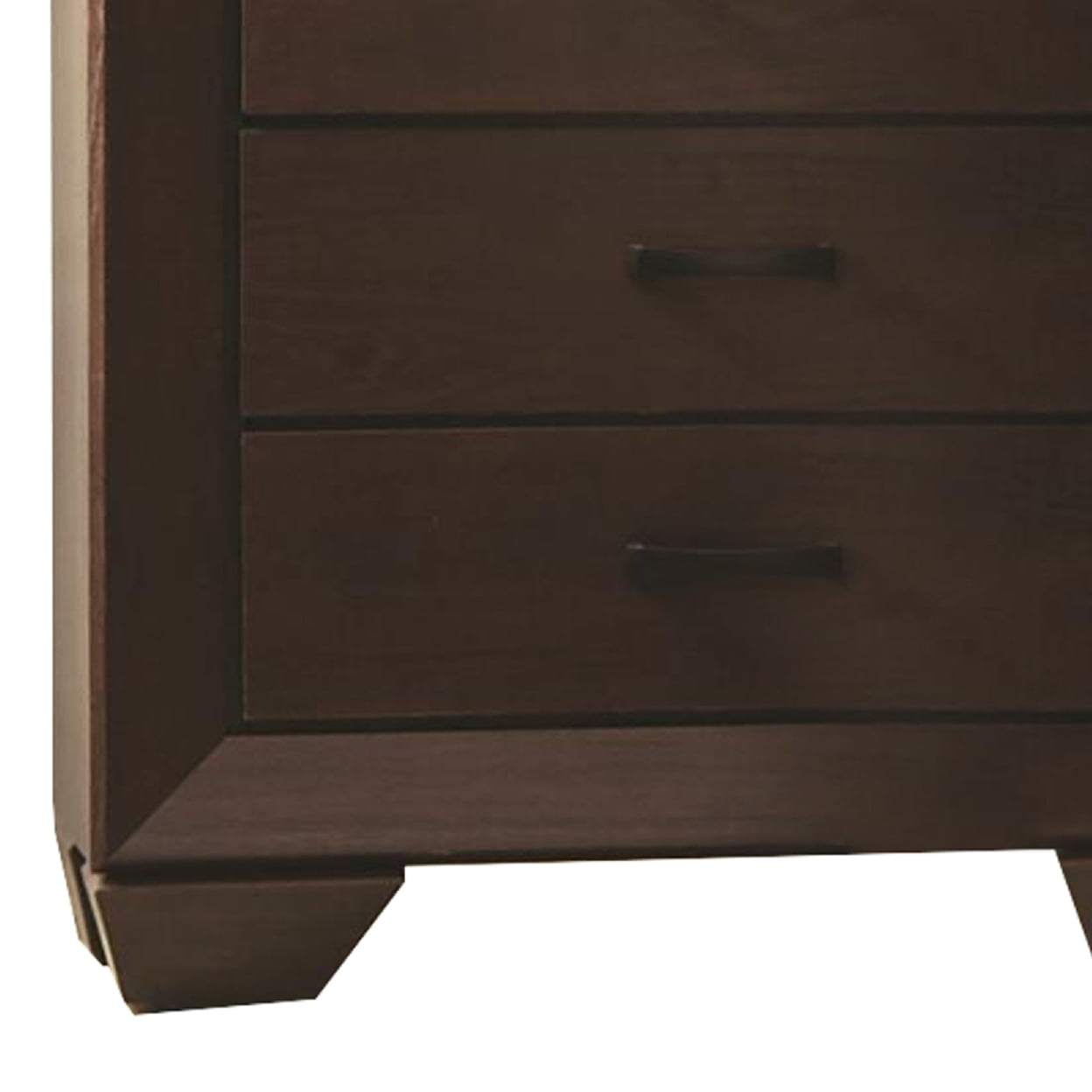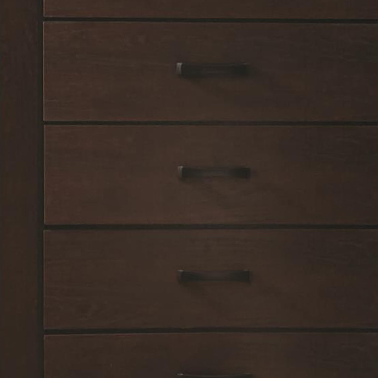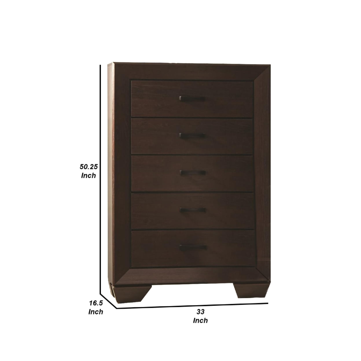 With crisp, clean lines and a simple design, this chest exudes simple elegance. Black, recessed grooves create a cool contrast to its dark cocoa finish. Its legs are crafted with a tapered design, providing sturdy support. A simple, square silhouette lends a touch of transitional appeal to match with a variety of decor styles. Exclusive to Coaster, this chest offers style, versatility, and exceptional value. Features: Includes: One (1) chest Finish: Dark Cocoa Materials: MDF, Particle Board, Paper Laminate, Wood Solid rubberwood legs in black finish Frame constructed with rubberwood and plywood Drawer box construction style: 5 pieces Drawer joinery method: English dovetail Drawer box – thickness of vertical panel: 9mm Drawer glides: Kenlin runner Drawer – felt lined: No Leveler/ plastic glide: Plastic glide Hardware type: Pull handle Drawers: Vertical panel – Paper laminate with MDF; Bottom panel – Paper laminate with MDF Drawer – cedar line: No Drawer – tinted drawer: No Specifications: Product Dimensions: 50.5″H x 33″W x 16.5″D Product Weight: 92.61 lbs Number of Drawers: 5 Drawer Weight Capacity: 45 lbs Assembly Required: Yes Warranty: One (1) year limited manufacturer warranty