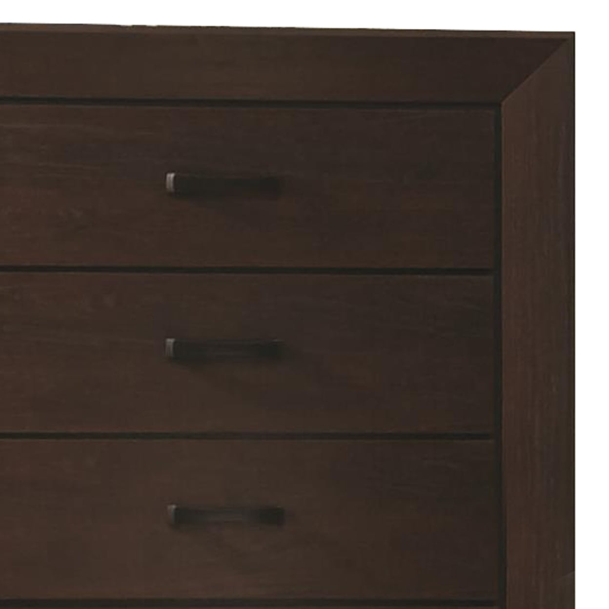 Includes: One (1) chest Finish: Dark Cocoa Materials: MDF, Particle Board, Paper Laminate, Wood Solid rubberwood legs in black finish Frame constructed with rubberwood and plywood Drawer box construction style: 5 pieces Drawer joinery method: English dovetail Drawer box – thickness of vertical panel: 9mm Drawer glides: Kenlin runner Drawer – felt lined: No Leveler/ plastic glide: Plastic glide Hardware type: Pull handle Drawers: Vertical panel – Paper laminate with MDF; Bottom panel – Paper laminate with MDF Drawer – cedar line: No Drawer – tinted drawer: No