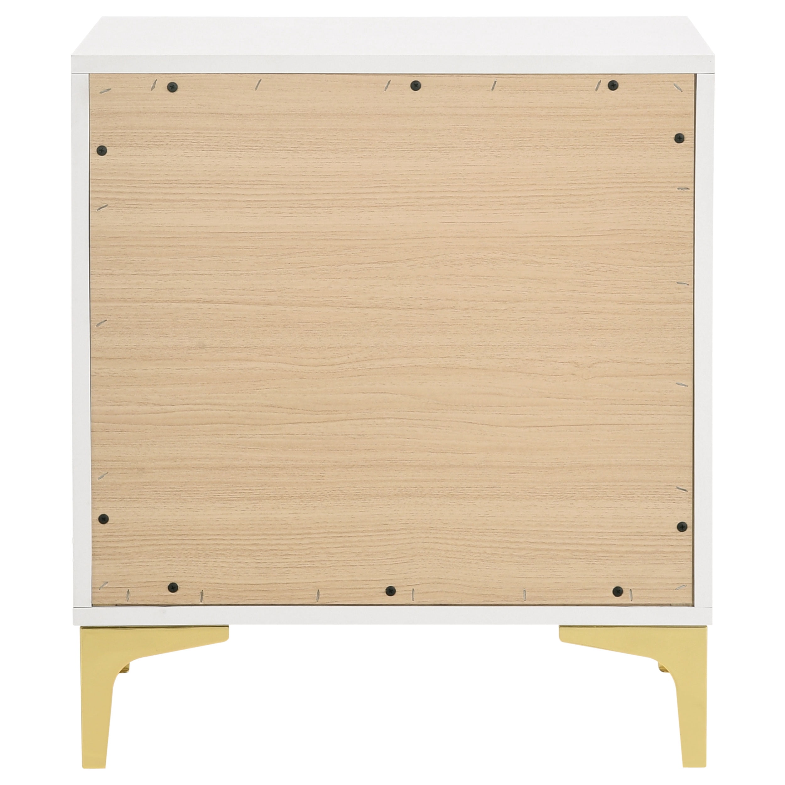 Includes: One (1) nightstand Finish: White Metal finish: Gold Materials: Asian hardwood, Asian tropical wood, MDF, particle board, iron, paper laminate, melamine laminate veneer Perfect for contemporary and modern bedrooms Two deep drawers offer all the space you need for bedside essentials The bright, white finished frame ensures a light and airy disposition Gold finished pull handles create a luxe flair Drawer joinery method: English dovetail Drawer glides: Kenlin center metal glide Hardware type: Pull handle Drawer box construction style: 5 pieces Drawer box – thickness of vertical panel: 9mm Leveler/plastic glide: Plastic glide Drawers: Vertical panel – MDF and paper laminate; Bottom panel – MDF and paper laminate