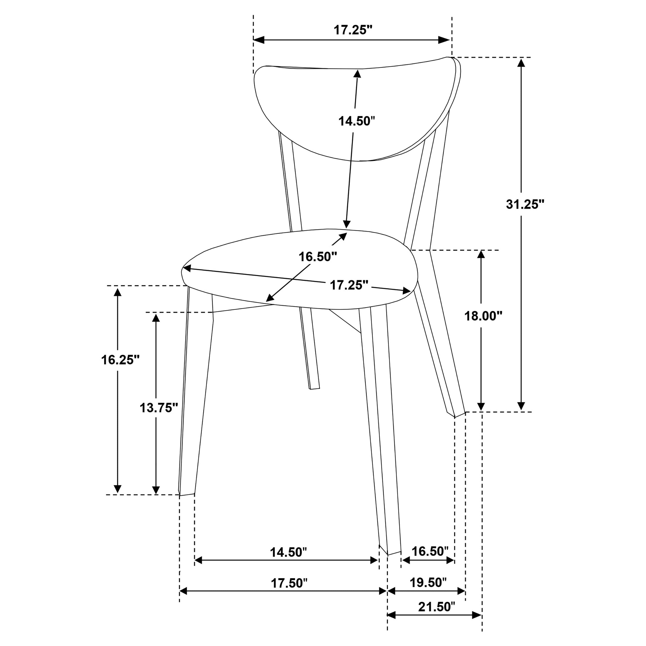 Set of 2 wooden, curved-back chairs add a touch of distinctive sophistication to any room Leatherette upholstered cushion provides comfort and support without sacrificing style Guaranteed to catch some eyes with rounded, triangle-shaped cushion and dramatic half-moon back Chic mid-century build will fit into any modern styled office, bedroom, or dining room Basic assembly with screwdriver required, tools not included Frame material: Asian hardwood and rubberwood veneer Cushion material: Leatherette Frame color: Chestnut brown Seat color: Beige Dimensions (L x W x H): 21.75 x 17.25 x 31.5 inches Seat Height: 18 in Seat Depth: 16.5 in Weight: 18.74 pounds Manufacturer Warranty: 1-year warranty