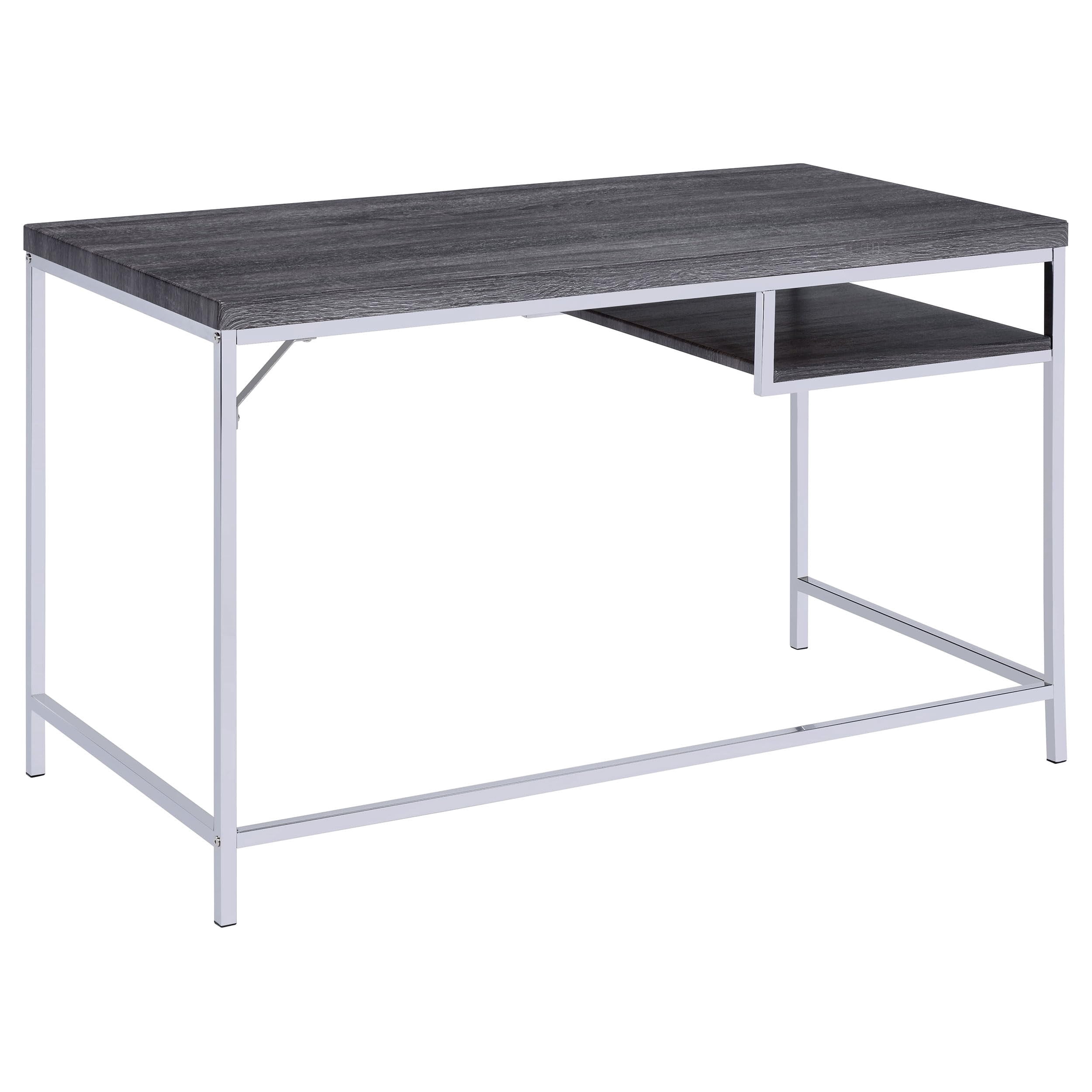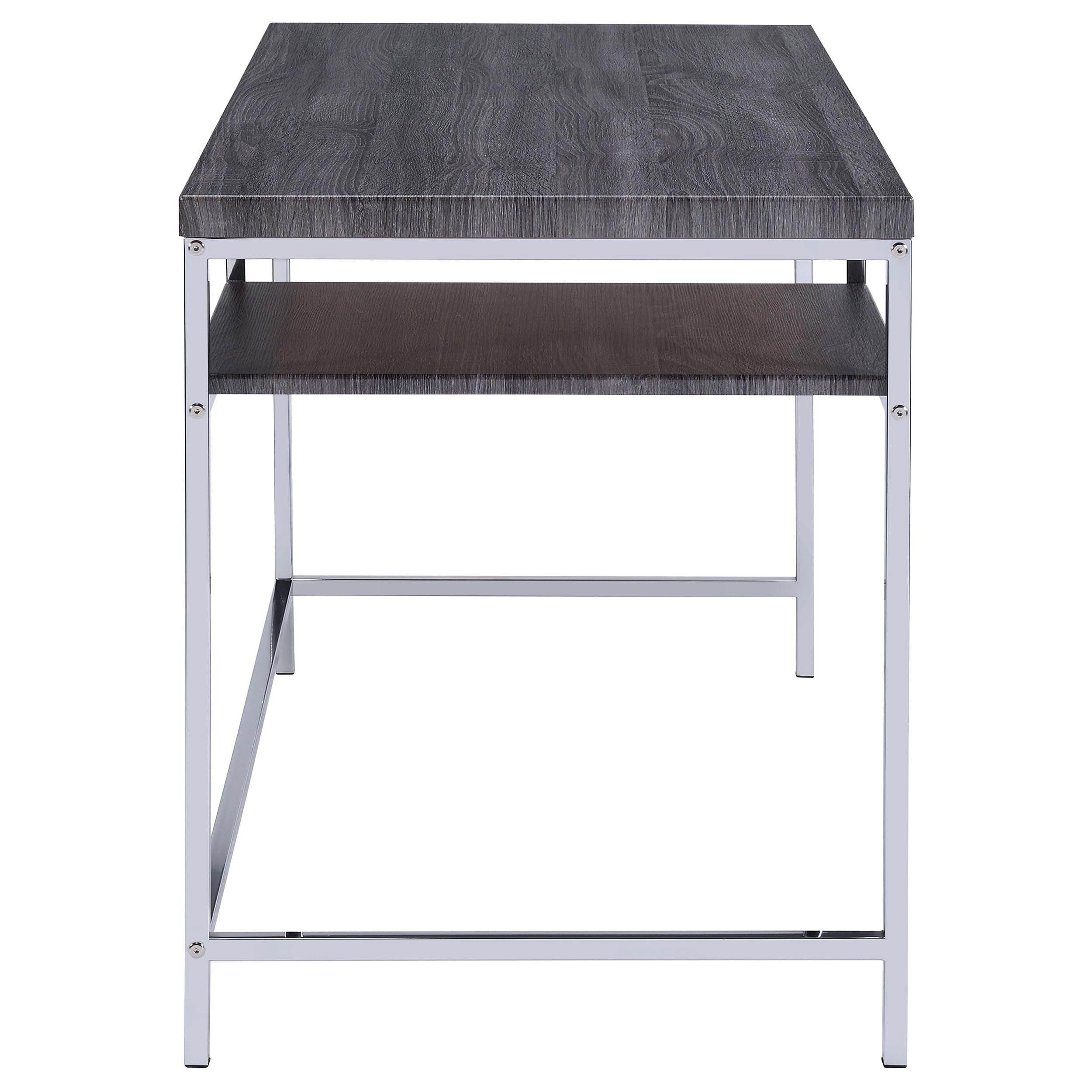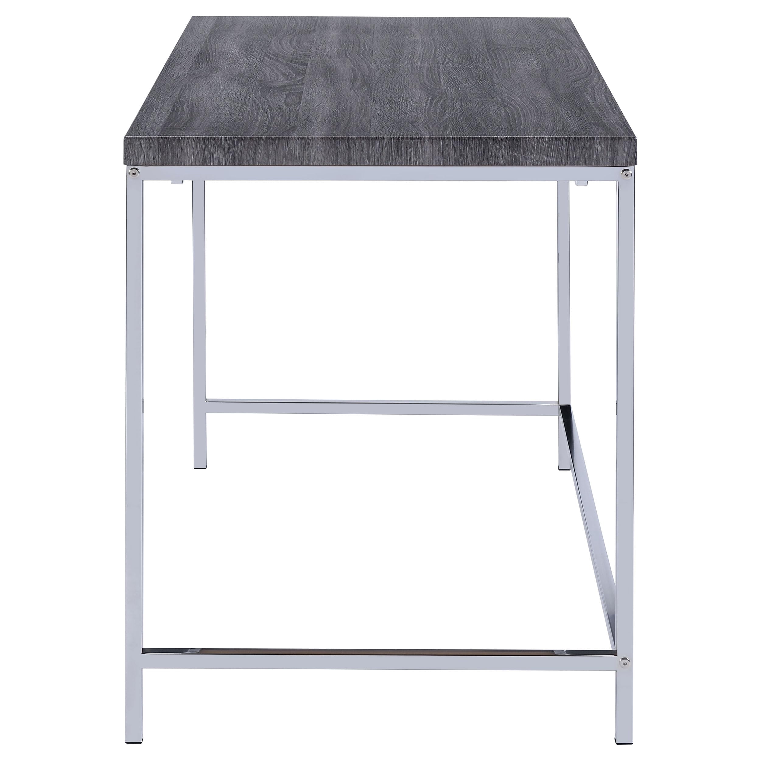 Includes: One (1) writing desk Wood finish: Weathered Gray Metal finish: Chrome Materials: Metal, MDF, PVC laminate Coastal meets modern with writing desk in weathered Gray finish Metal frame in electroplated polished chrome finish Desk’s one (1) open storage shelf decrees simplicity Leveler/ plastic glide: Plastic glide