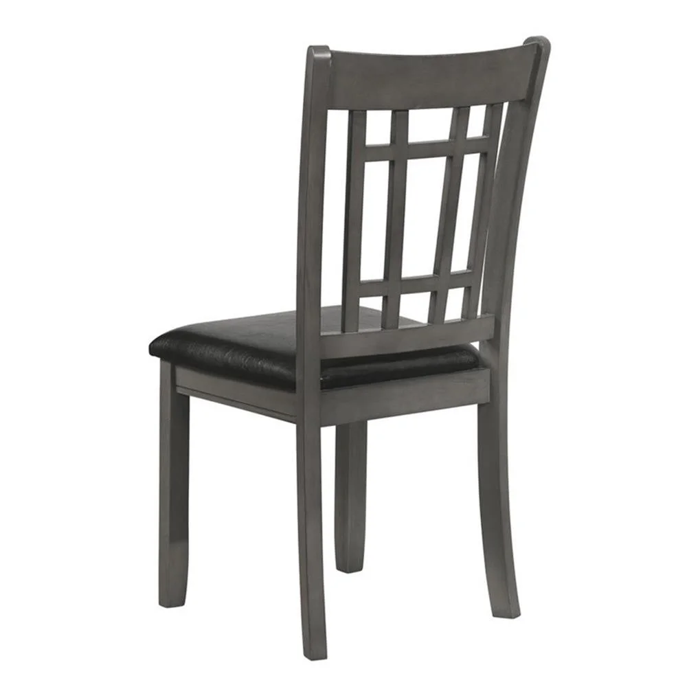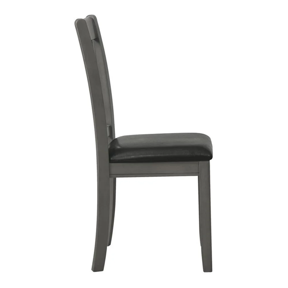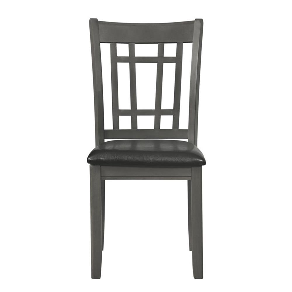 A combination of vertical and horizontal slats creates a window pane effect for this charming transitional dining chair. An armless silhouette is a versatile choice for relaxed, everyday living. The chair boasts a medium gray finish over Asian hardwood construction. Webbed seating and black faux leather upholstery combine for stylish comfort. Invite friends and family to have a seat and enjoy a lovely meal. Features: Chair upholstery: Black faux leather Leg finish: Medium Gray Materials: Asian hardwood, particle board, faux leather, foam Our top selling transitional style sets are now available in a new gray finish Chairs have black faux leather seats Chair have seat frame construction and webbed seating for more comfort Cushioned seating: For ultimate comfort and support Leveler/plastic glide: Plastic glide Seat construction: Seat frame Cushion seat base: Particle board (15mm) Specifications: Product Dimensions: 38.25″ H x 18.5″ W x 21.25″ D Seat Dimensions: 19.25″ H x 16.5″ W x 16.75″ D Product Weight: 15.98lbs Assembly Required: Yes Warranty: One (1) year limited manufacturer warranty