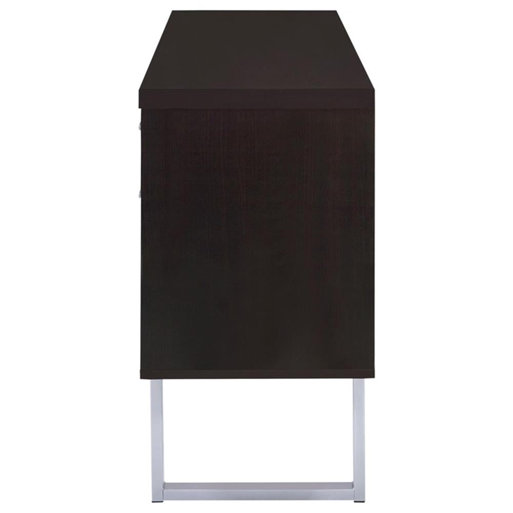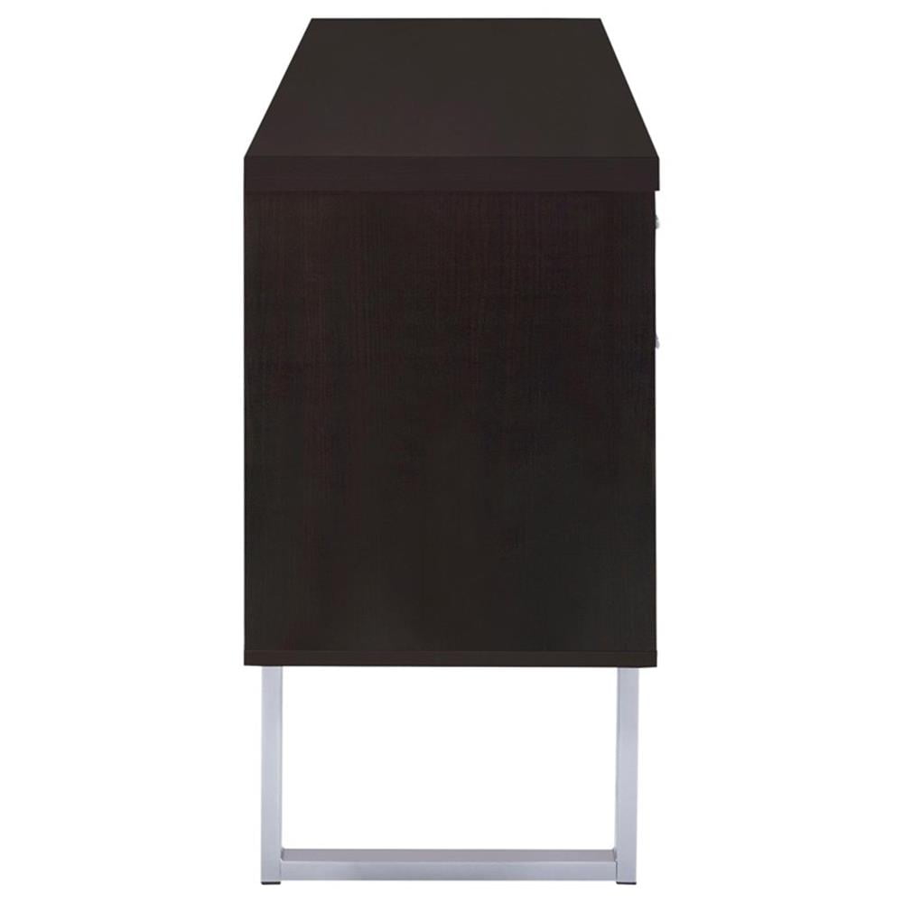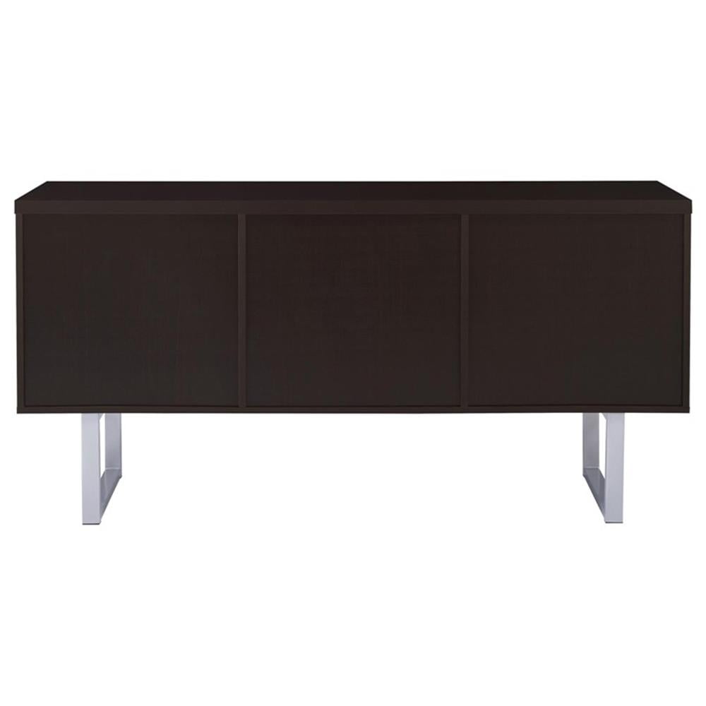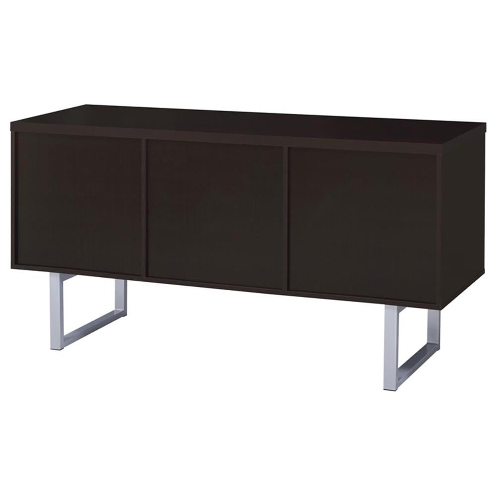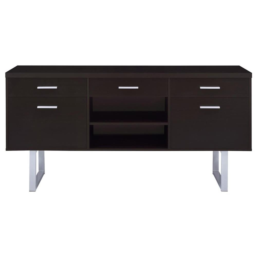 Includes: One (1) credenza Wood finish: Cappuccino Metal finish: Silver Materials: MDF, metal, particle board, hollow board with honey comb, hollow board, paper laminate Classy office desk in cappuccino finish Clean metal base in silver finish Credenza features expanded space with three (3) storage drawers, two (2) file cabinets, and an open storage compartment with an adjustable shelf File cabinet holds both legal and letter size files Drawer: Euro glides Drawer joinery method: Front cam bolt walnut and back screw construction Size of file cabinet: Legal and letter size Rods can be swapped: Yes Hardware type: Pull handle Leveler/plastic glide: Plastic glide