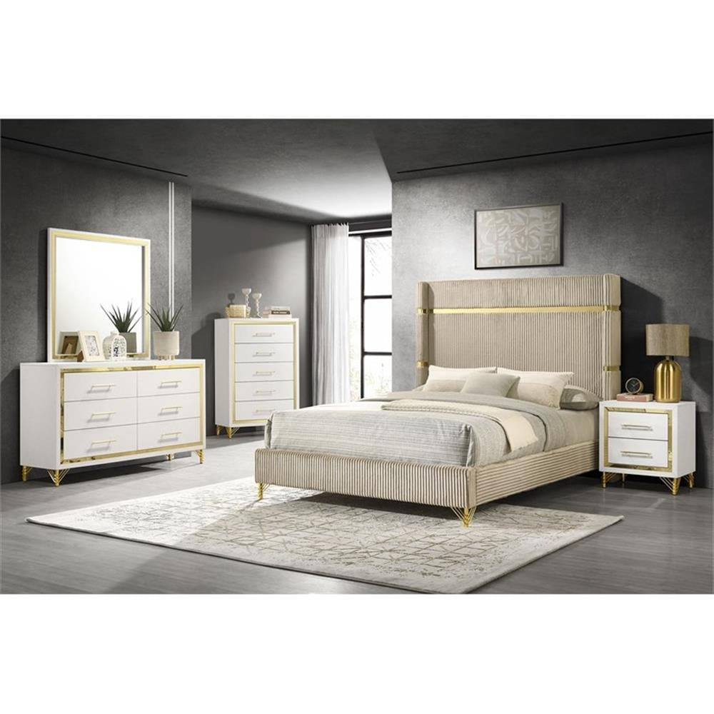 Indulgently soft beige fabric creates the centerpiece of a modern bed. Its wingback silhouette is timeless and refined, with a low footboard that creates an open, airy look and feel. The tall headboard features stylish bands of gleaming gold finish trim that create depth and contrast perfectly with the vertical fluted look of the upholstery. At the bottom of the bed, decorative feet feature hairpin-inspired style that brings a retro touch of character to your bedroom. The bed is a charming focal point for your elegant bedroom. Features: Includes: One (1) bed Color: Beige Materials: MDF, laminated veneer lumber, fabric, foam, iron, Asian hardwood Method attach bed rails: L-shape hook and plate Distance from floor to top of slat: 9.75” (248mm) Clearance dimension for adjustable bed: 59.25″ W x 81.75″ D (1505 x 2075 mm) Support leg with leveler: 4 pieces Specifications: Size: Queen Product Dimensions: 60.75″ H x 66.5″ W x 88″ D Product Weight: 79.81lbs Assembly Required: Yes Warranty: One (1) year limited manufacturer warranty