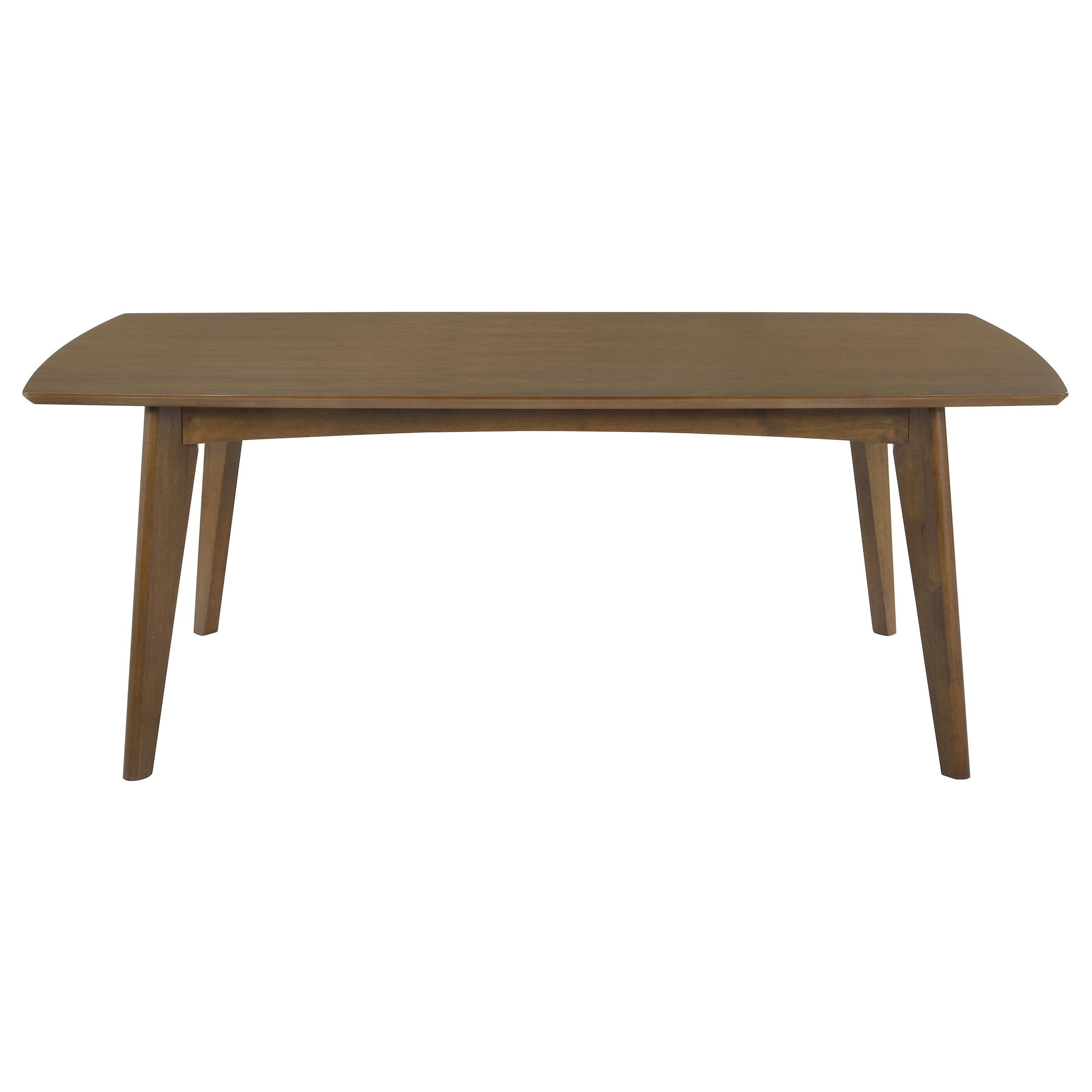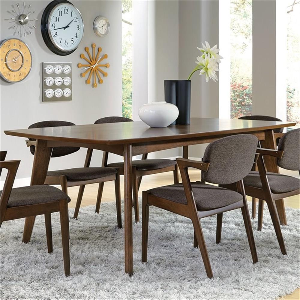 Include: One (1) table Finish: Dark Walnut Materials: Asian Hardwood, Asian Tropical Wood, MDF, Walnut Veneer Swanky mid-century modern dining collection in dark walnut finish Rectangular table crafted from Asian hardwood in a dark walnut finish seats 6 comfortably Oval leg table has an 18″ leaf extension with a great walnut veneer top Table top edge profile: Roundover savel Shape: Rectangular