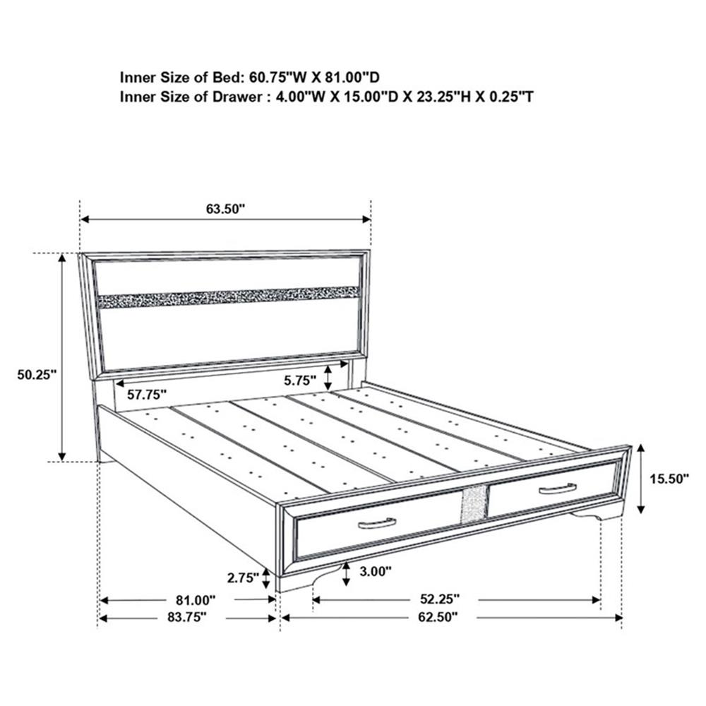 This alluring bed from the Miranda collection has both fashion and function. It features crisp lines and a headboard that’s as simple as it is impressive. The footboard is built with two roomy drawers to hold extra sheets and blankets. The bed has an effortless timelessness and elegance. Add to the bedroom for a charming ambiance that’s sure to please. Features: Includes: One (1) bed Finish: Black Hardware finish: Rhinestone pull handles Materials: Asian hardwood, Asian tropical wood, MDF, particle board, paper laminate veneer, 3D foil paper veneer Glittering stripes add energy to a contemporary design with glamorous at the forefront Elegant and timeless design with just the right amount of “bling” Bed features storage at footboard and is fully slatted Exclusive rhinestone pull handles set this collection apart Felt lined top drawers: Safely store jewelry or treasured keepsakes Under bed storage: Store away personal items 50 lbs. tip over test: Cases 30″ and taller passed ASTM standards test Drawer box – thickness of vertical panel: 9mm Drawer box construction style: 5 pieces Drawer joinery method: English dovetail Drawer glides: Kenlin runner Hardware type: Pull handle Method attach bed rails: L-shape hook and plate Drawers: Drawers vertical panel: MDF with PU paper, bottom panel: MDF with PU paper Inner size storage bed: 60.94″ W x 81.10″ D Support leg with leveler: 5 pieces Specifications: Size: Queen Product Dimensions: 50.25″ H x 63.5″ W x 83.75″ D Product Weight: 164.95lbs Box Spring/ Foundation Required: No Number of Drawers: 2 Weight Capacity: Drawer – 45lbs Assembly Required: Yes Warranty: One (1) year limited manufacturer warranty