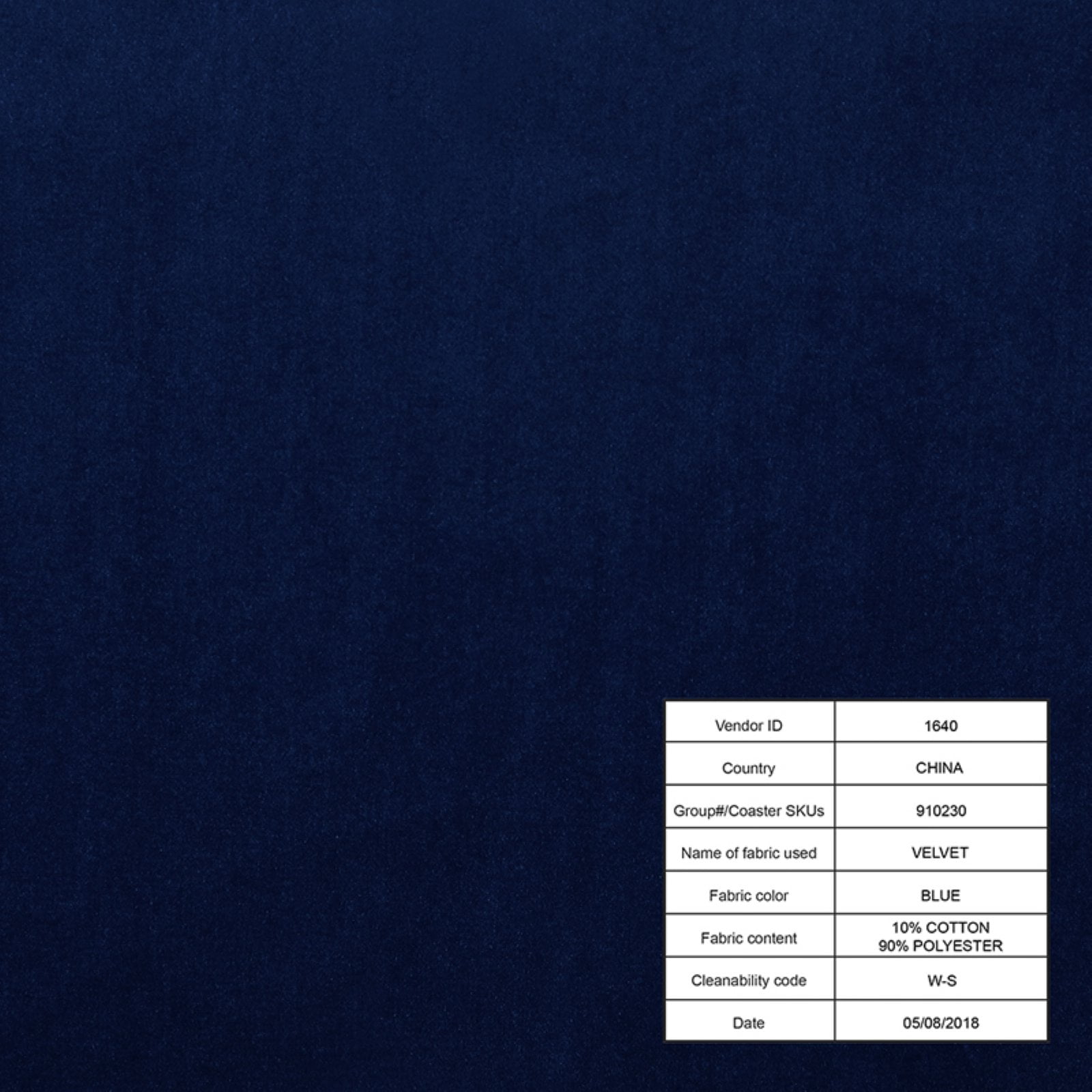 Dimensions: 15.5W x 15.5D x 16H in. Metal legs with glam brass finish Ottoman upholstered in blue velvet Velvet is 10% cotton and 90% polyester Modern cube shape Assembly required