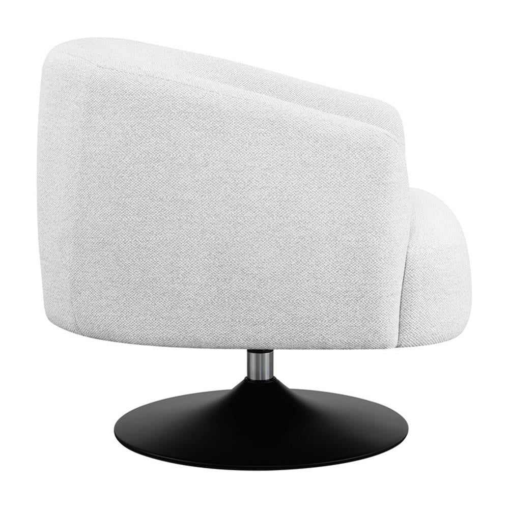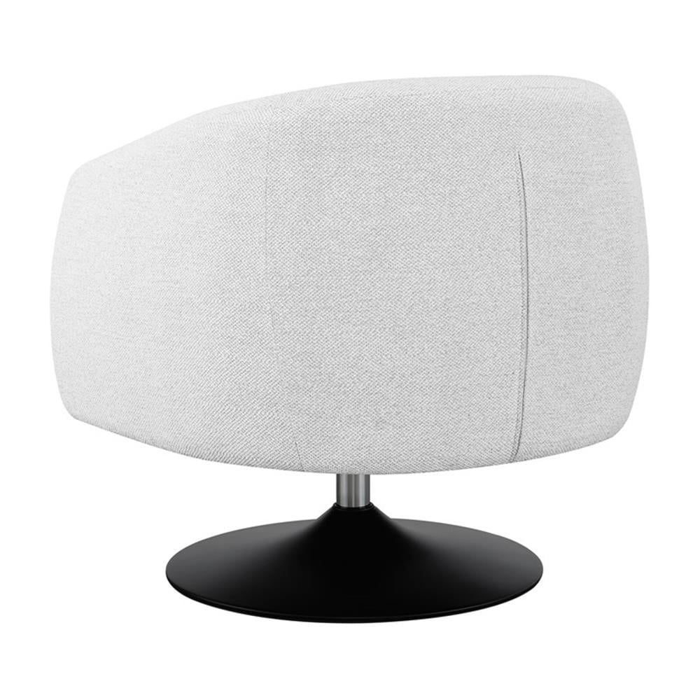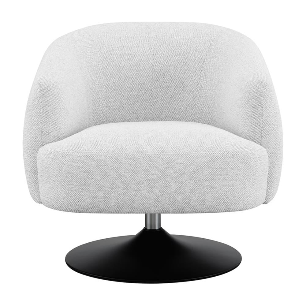 Includes: One (1) chair Upholstery: Beige Finish: Matte Black Materials: Foam, Plywood, Pine, Metal, Fabric Material content: 100% polyester Cleaning code: W-S Trendy boucle fabric, the perfect touch for this swivel accent Tailored tight back and seat compliment the clean lines Modern barrel-chair design with exposed pedestal base 360-degree swivel base for ultimate lounging comfort Seat construction: Attached Movement: Stationary