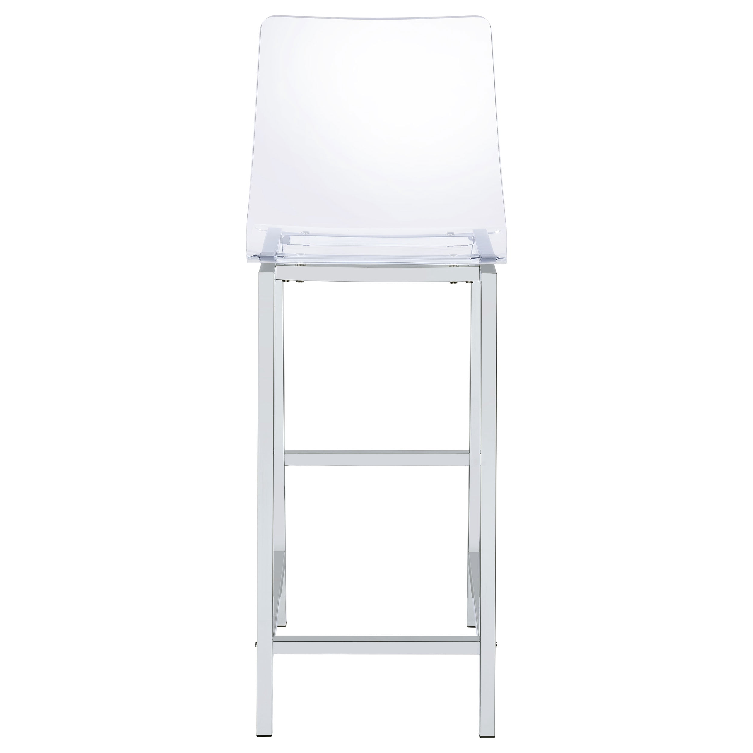 Includes: Two (2) bar stools Metal finish: Chrome Upholstery: Clear Acrylic Materials: Metal, Acrylic Contemporary rectangular metal bar set electroplated in chrome Bar stool maintains the modern visual with topgrade clear acrylic seats Leveler/ plastic glide: Plastic glide