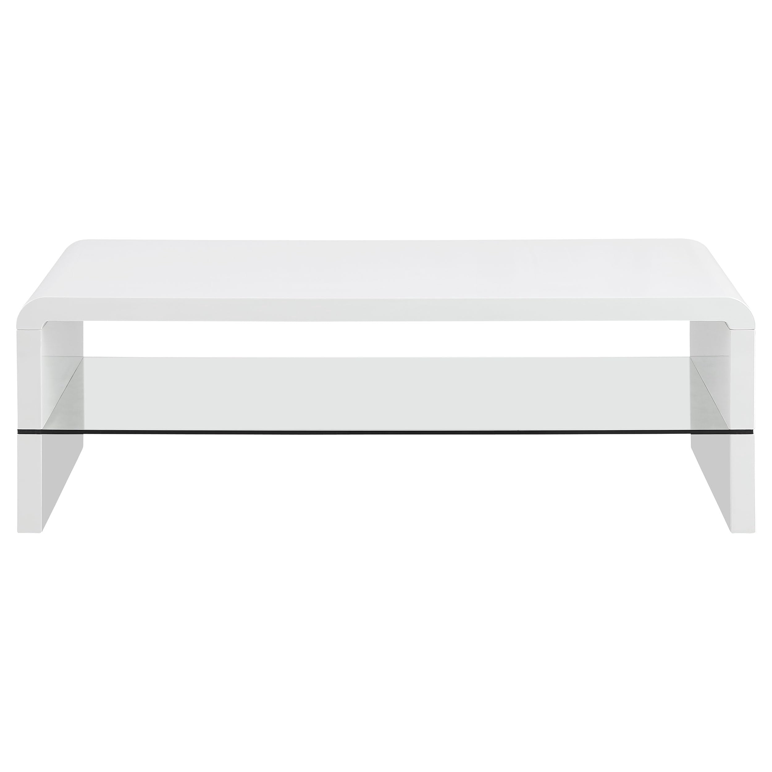 Includes: One (1) coffee table Finish: White High Gloss Materials: MDF, Glass, Wood Stylish modern design Rectangular shape featuring clean lines with soft rounded edges Tempered glass shelf for storage or display Constructed with MDF and 8mm tempered glass Leveler/ plastic glide: Plastic glide Shape: Rectangular