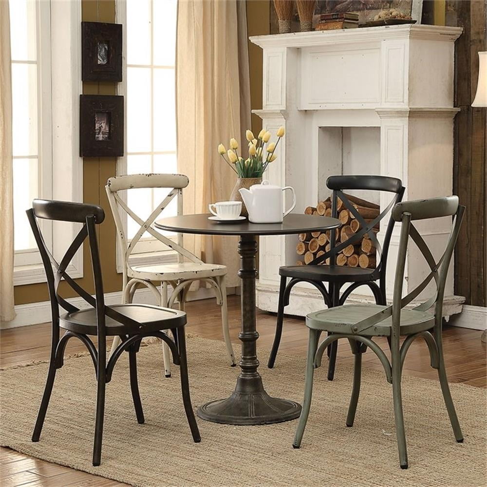 Include: One (1) table Finish: Bronze Materials: MDF, Metal Charming French sidewalk bistro dining collection Metalwork pedestal table has an antique bronze finish with hand applied details Round pedestal table is perfect for small spaces Table top thickness: 18mm Floor to bottom apron size: 29.25″H Leveler/ plastic glide: Leveler Shape: Round