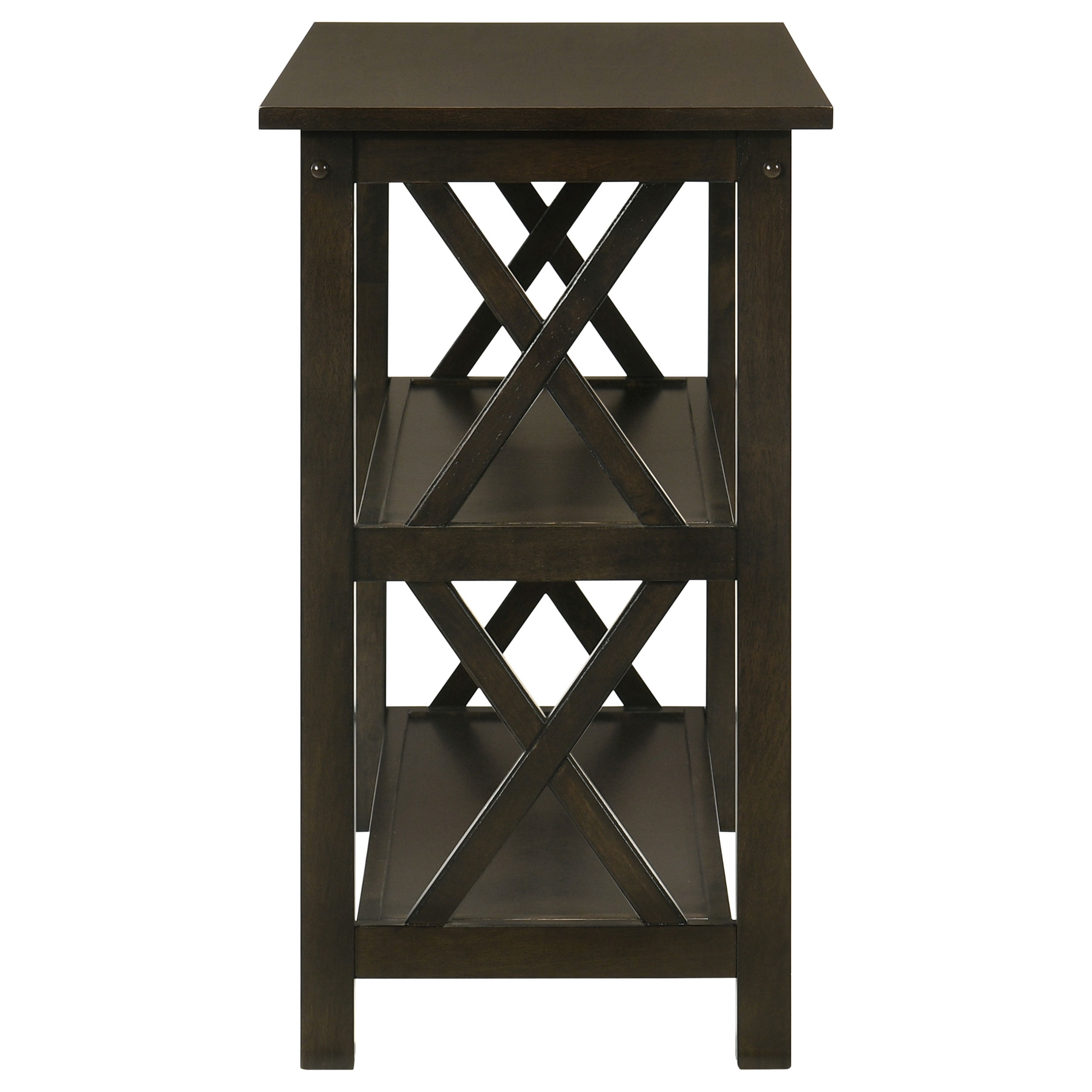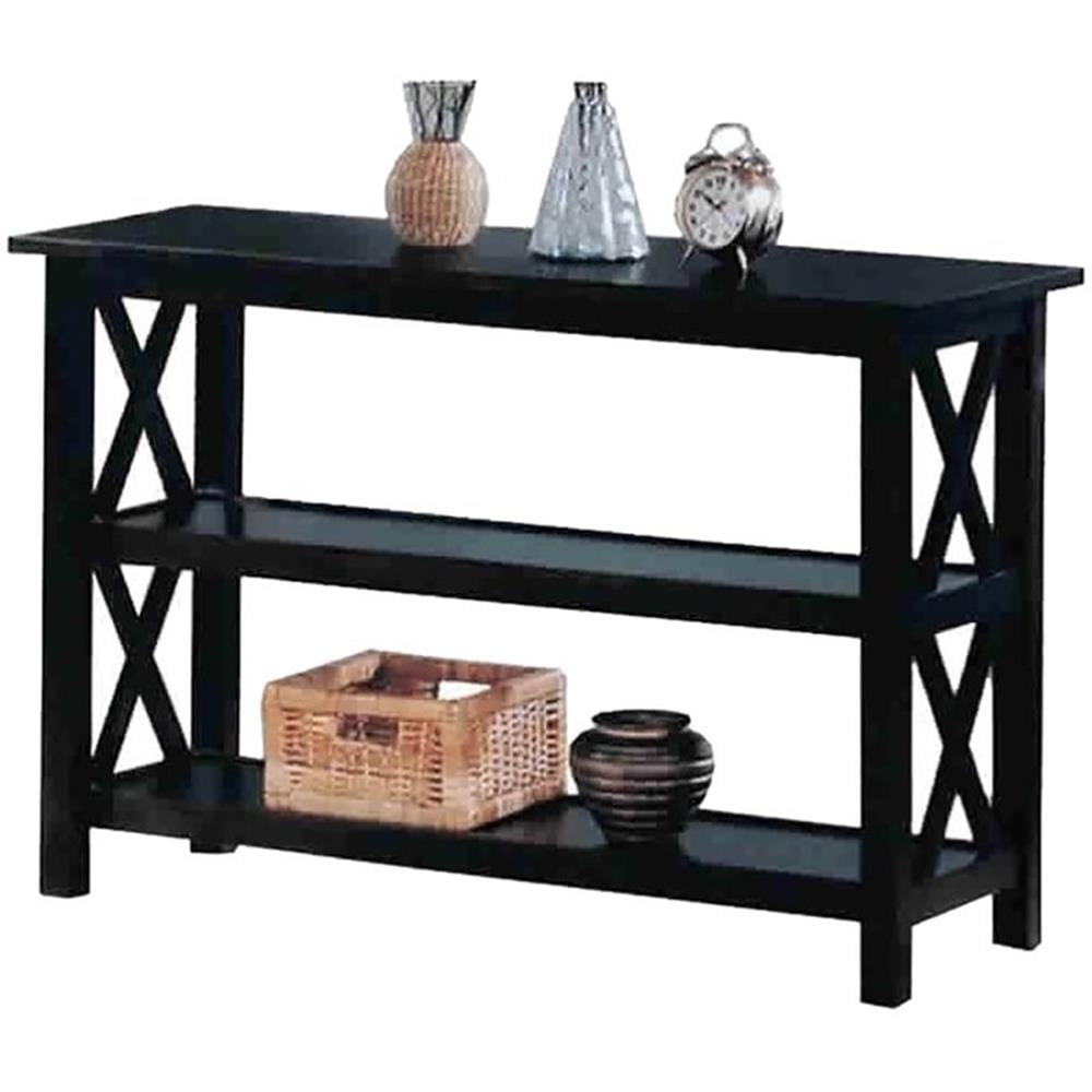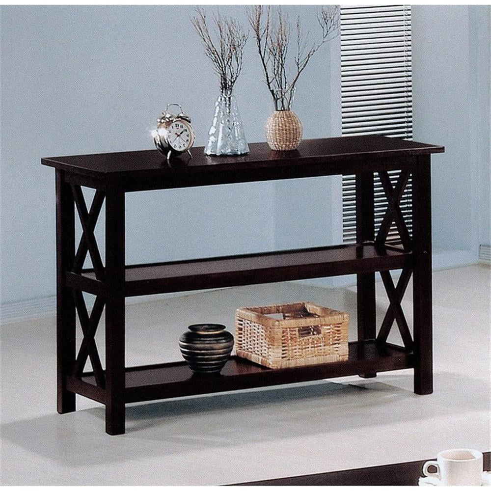 Includes: One (1) sofa table Finish: Deep Merlot Materials: Asian hardwood, MDF, rubberwood veneer Deep, rich dark merlot finish Spacious storage shelves underneath Eye-catching, X-shaped designs Type of shelves: Lower storage shelf