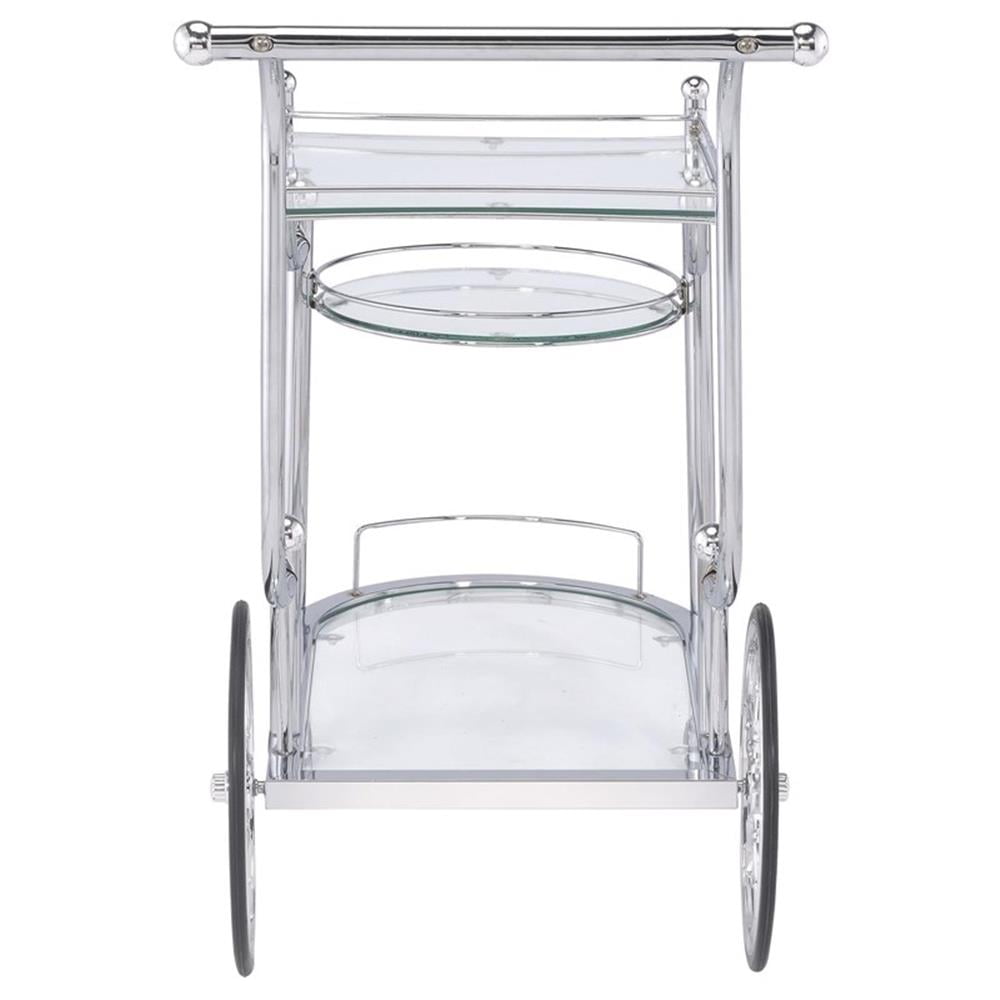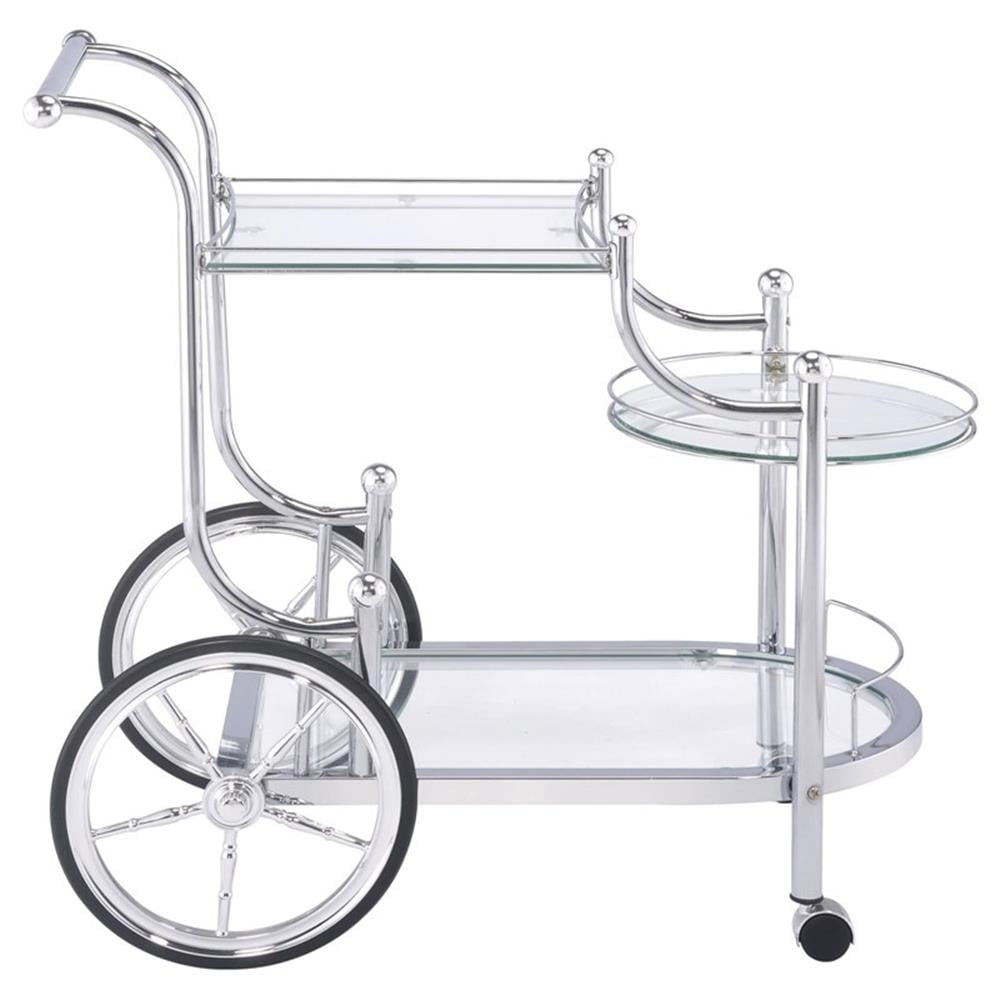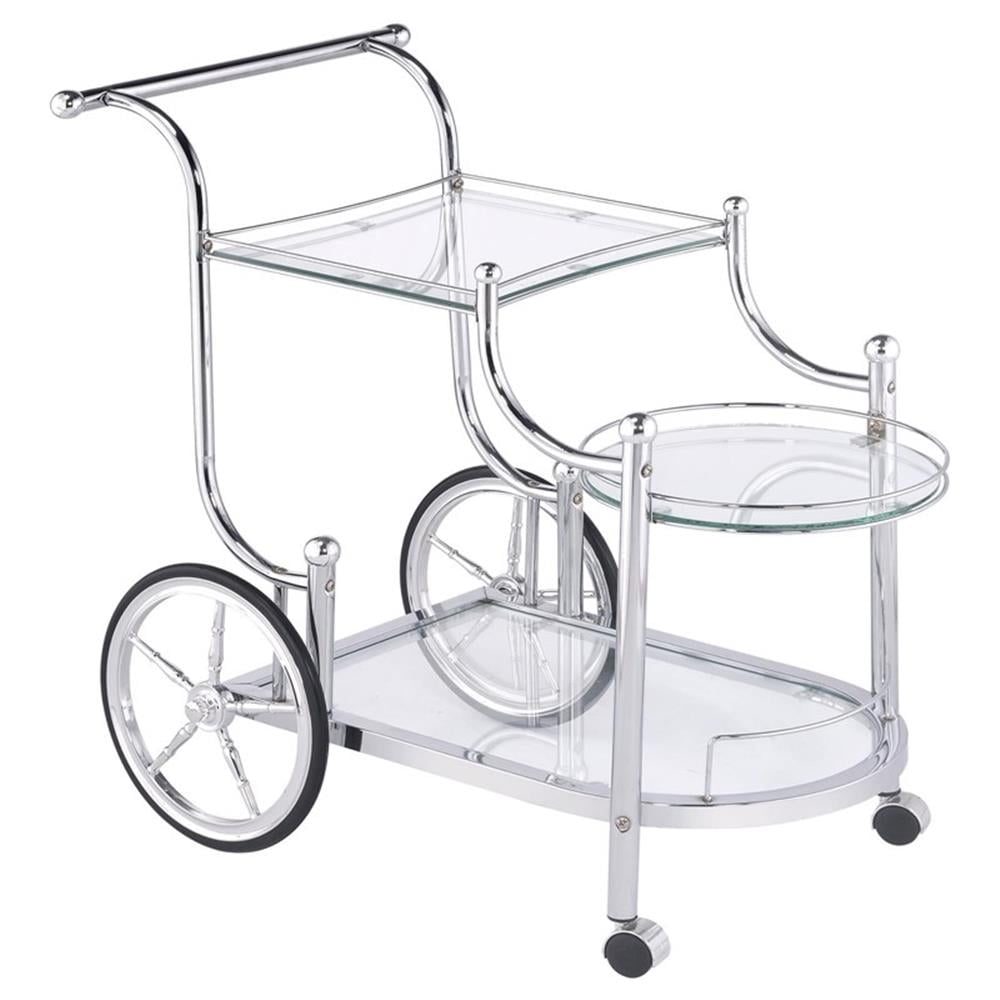 Includes: One (1) serving cart Metal finish: Chrome Materials: Glass, metal Carriage style serving cart dazzles with timeless appeal Chrome finish further enhances classy feel Three (3) tiers of clear tempered glass shelving with guardrails provide strength and style Spoke wheels and casters add antique-style detail Glass: Clear tempered glass Shape: Rectangular