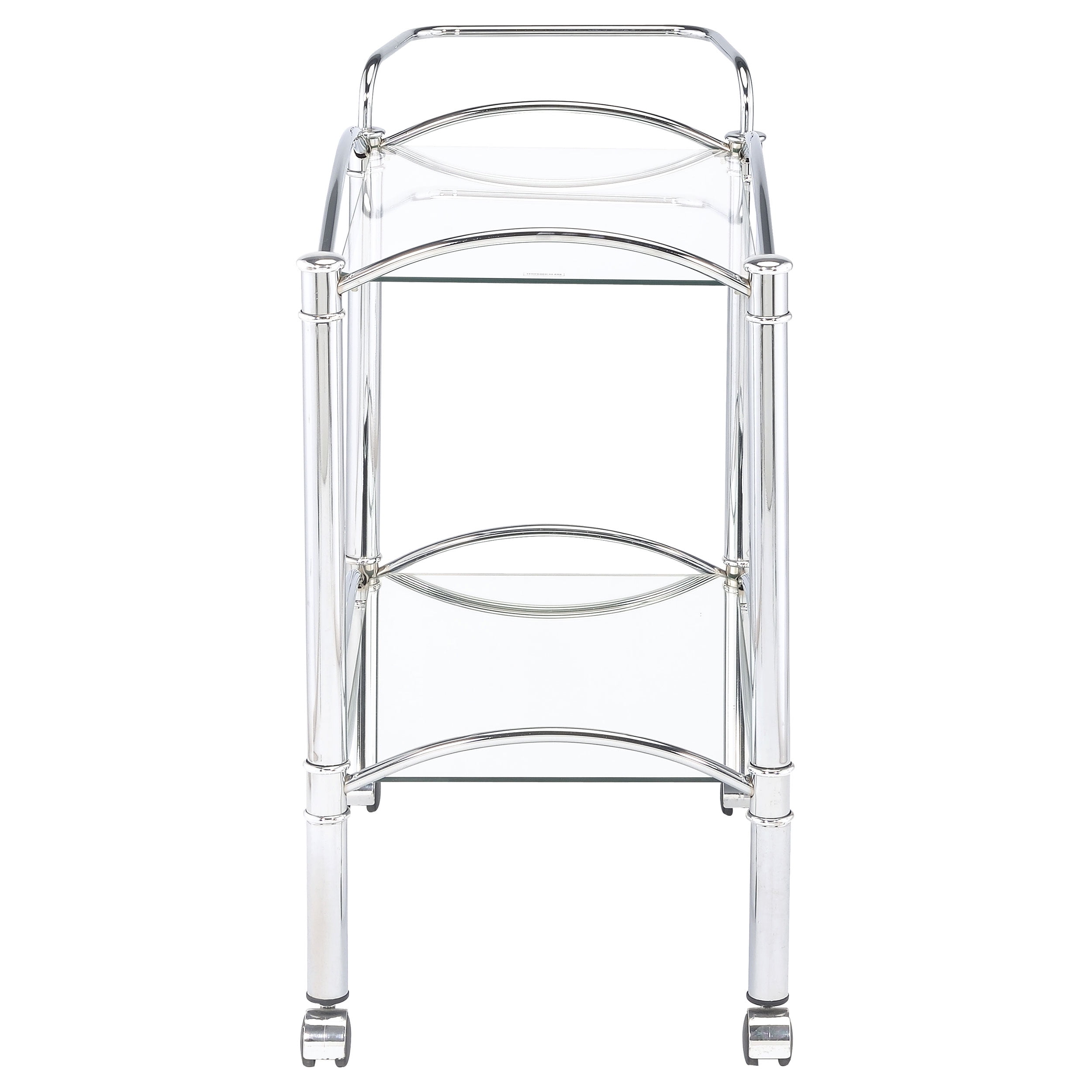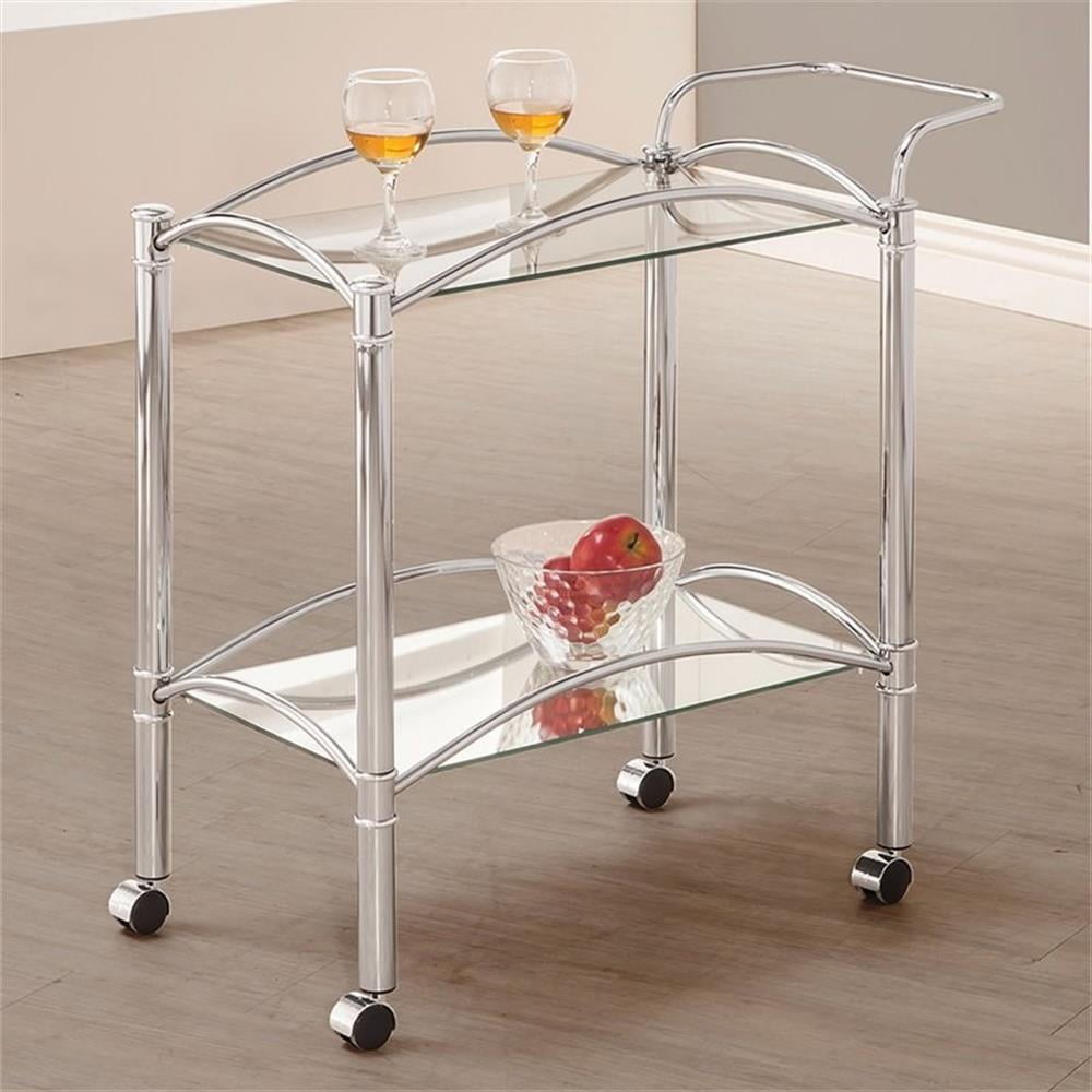 Includes: One (1) serving cart Metal finish: Chrome Materials: Glass, metal, mirror Classic serving cart is a conversation piece in any era Chrome finish creates timeless look Clear tempered glass top shelf and mirrored bottom shelf add visual intrigue and personality Form and function include two (2) tiers of shelving with guardrails and casters Glass: Clear tempered glass Bottom shelf is mirror Shape: Rectangular