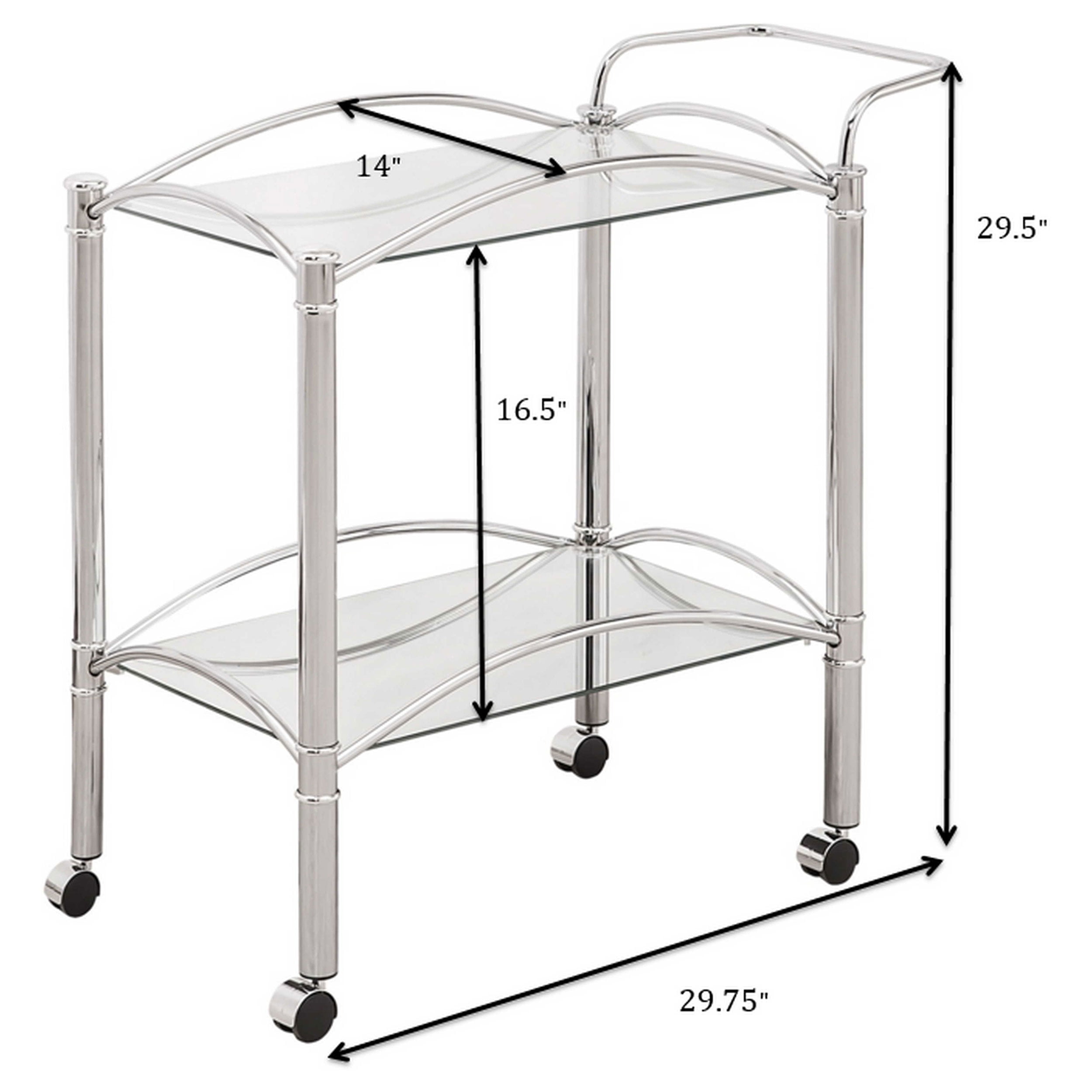 Simple elegance with a modern twist. This freshly styled serving cart offers a tasteful addition to contemporary decor. With a sleek chrome finish, its metal frame receives romantic curved accents. A tempered glass top shelf and mirrored bottom shelf accommodate beverages, food, and implements. Casters allow mobility to work the room easily. Features: Includes: One (1) serving cart Metal finish: Chrome Materials: Glass, metal, mirror Classic serving cart is a conversation piece in any era Chrome finish creates timeless look Clear tempered glass top shelf and mirrored bottom shelf add visual intrigue and personality Form and function include two (2) tiers of shelving with guardrails and casters Glass: Clear tempered glass Bottom shelf is mirror Shape: Rectangular Specifications: Product Dimensions: 29.5″ H x 29.75″ W x 14″ D Product Weight: 15.18 lbs Number of Shelves: 2 Assembly Required: Yes Warranty: One (1) year limited manufacturer warranty