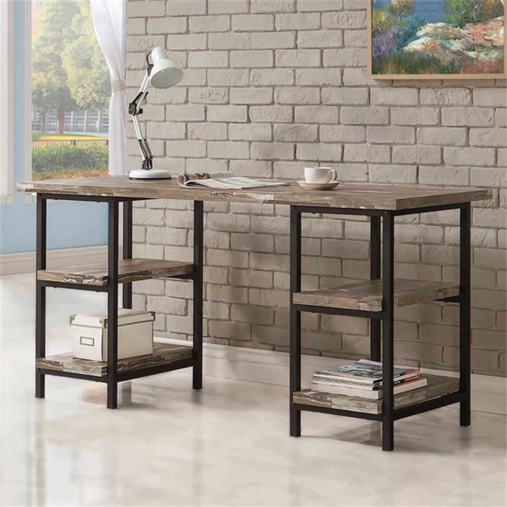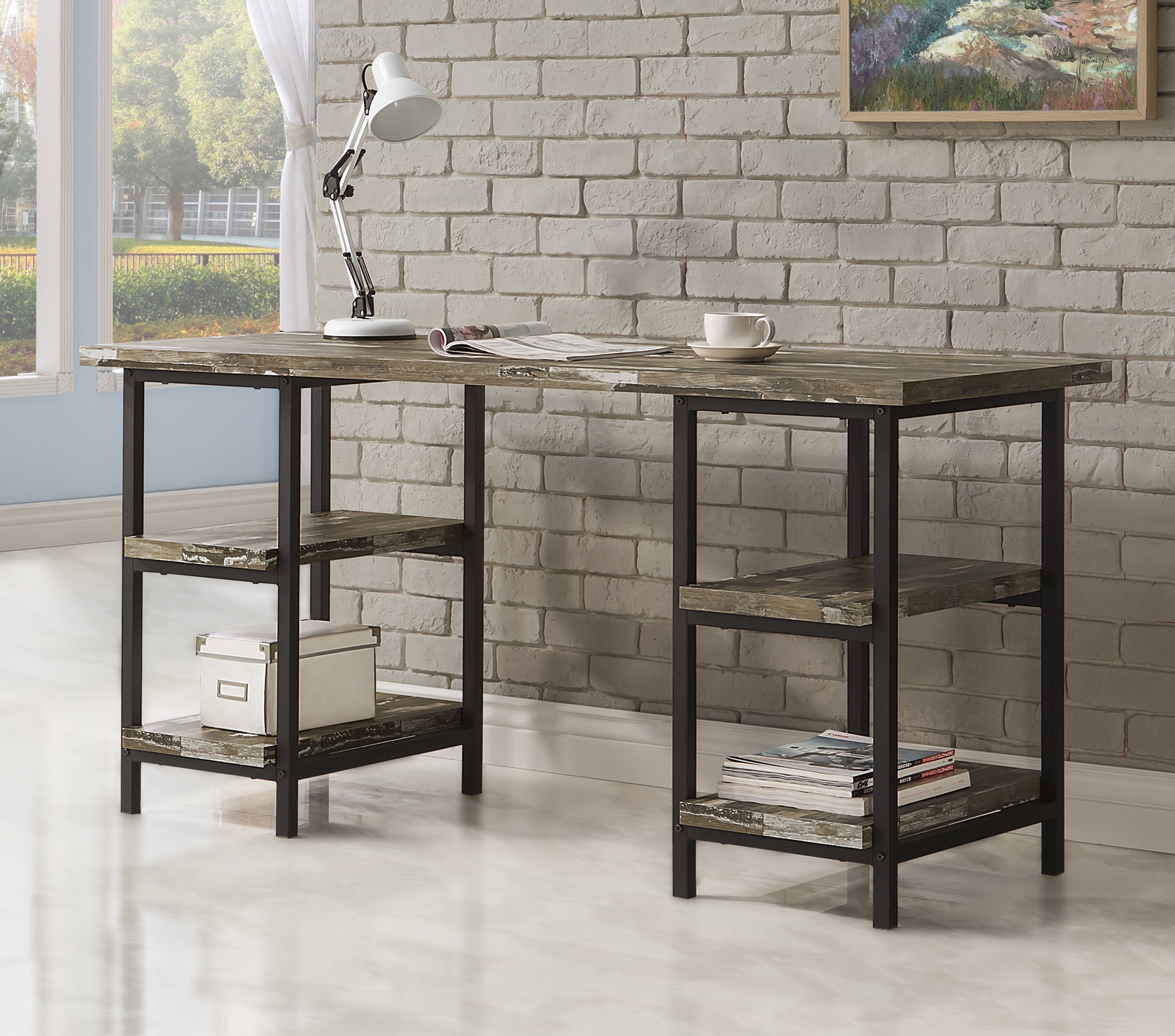 Includes: One (1) writing desk Wood finish: Salvaged cabin Metal finish: Black Materials: Wood, hollow board, hollow board w/honey comb, metal, paper laminate Home office collection combines rustic and industrial appeal Metal framework details accentuate style details Writing desk features four (4) storage shelves for easy access to materials