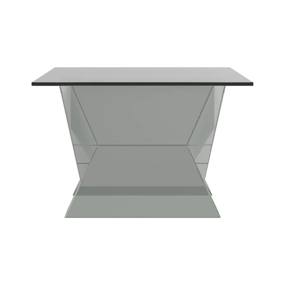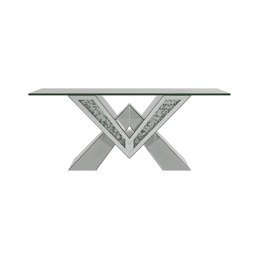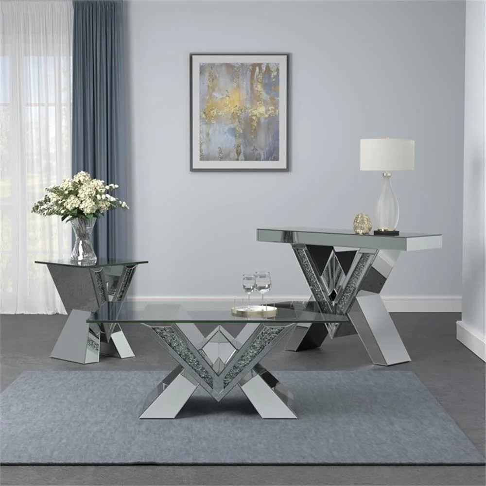 Includes: One (1) coffee table Finish: Silver Materials: MDF, mirror Contemporary style occasional set with gleaming, mirror lined surfaces Bold “V” motif with sparkling encrusted crystals Elegant beveled tempered glass table top Shape: Rectangular
