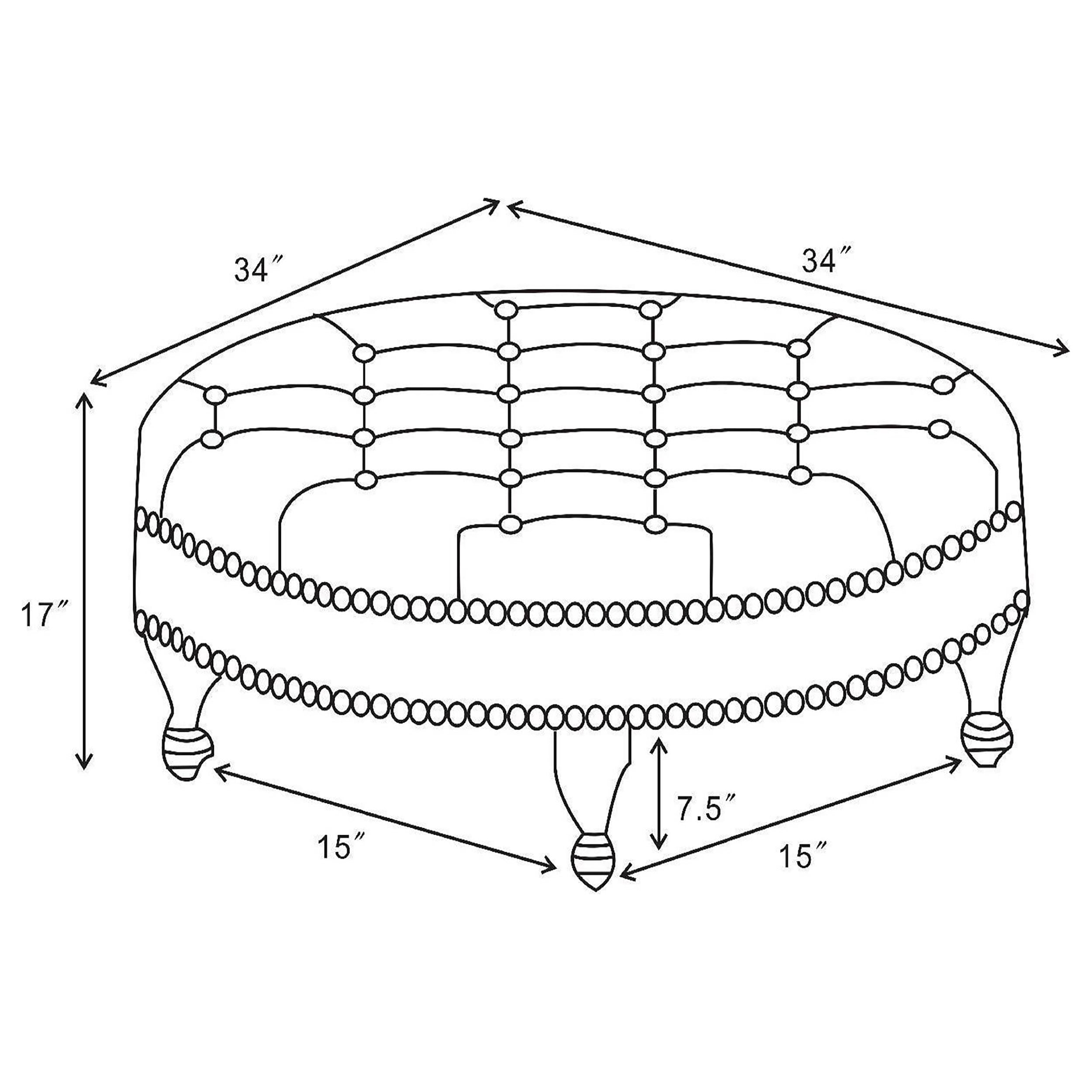 An ottoman is normally an ideal place to prop up your feet when relaxing in a comfortable recliner. At nearly three feet in diameter, however, this ottoman is more likely to accommodate both a sleeping child and dog. Upholstered in oatmeal color linen-like fabric, it feels as comfortable as it looks. Styled with two rows of bronze nailhead trim and a tufted seat, it has aesthetics to match. Completing the look are turned legs in dark brown. Features: Include: One (1) ottoman Upholstery: Oatmeal Finish: Dark Brown Materials: Rubberwood, Eucalyptus, Linen-Like Fabric Material content: 100% polyurethane Cleaning code: W-S Upscale design reminiscent of a swanky late-night lounge Round ottoman upholstered in an oatmeal colored linen-like fabric Features two rows of bronze nailhead trim Trendy tufted seat Turned legs in rich dark brown Seat construction: Elastic band, sponge Leveler/ plastic glide: Plastic glide Shape: Round Specifications: Product Dimensions: 17″H x 34″W x 34″D Product Weight: 18.26 lbs Assembly Required: Yes Warranty: One (1) year limited manufacturer warranty