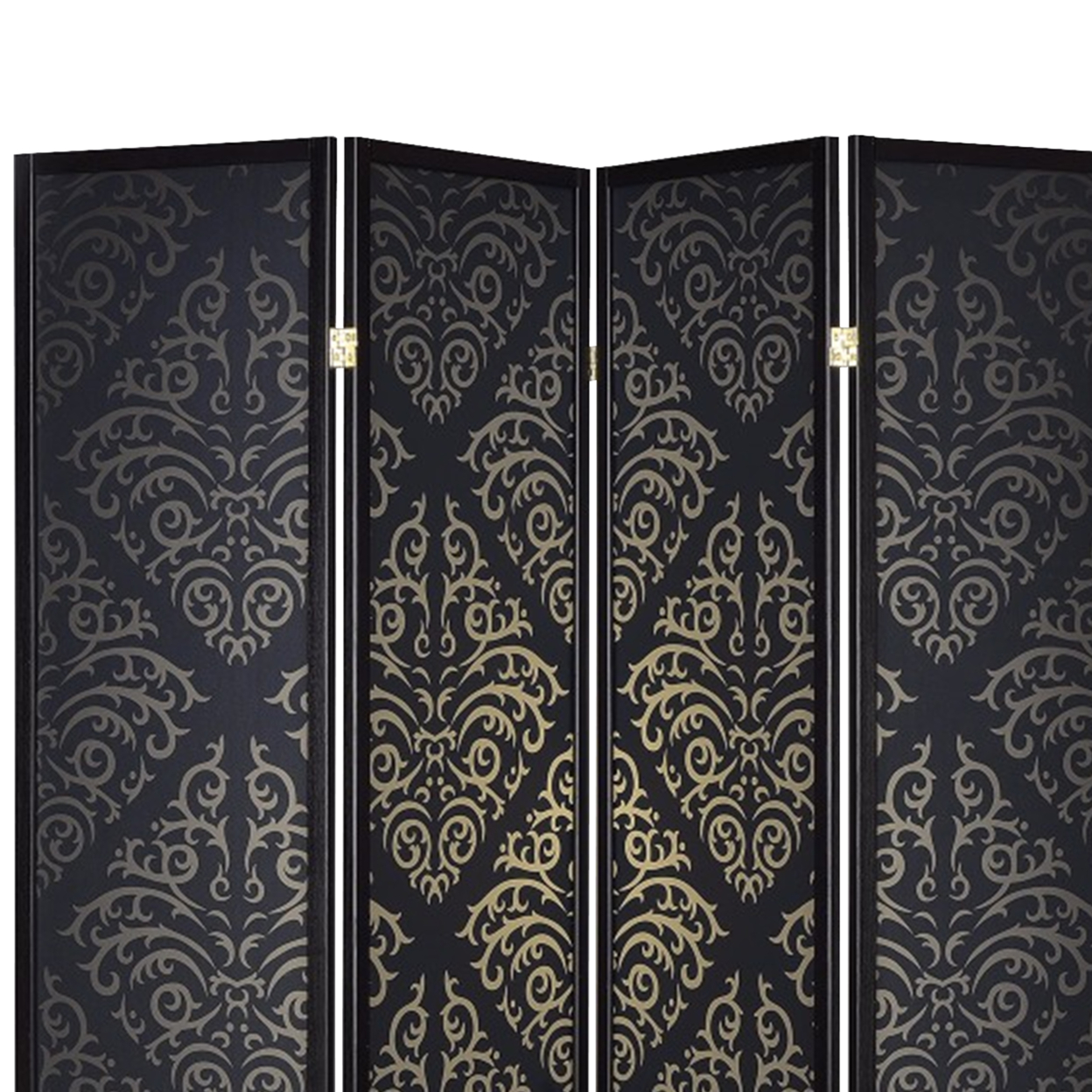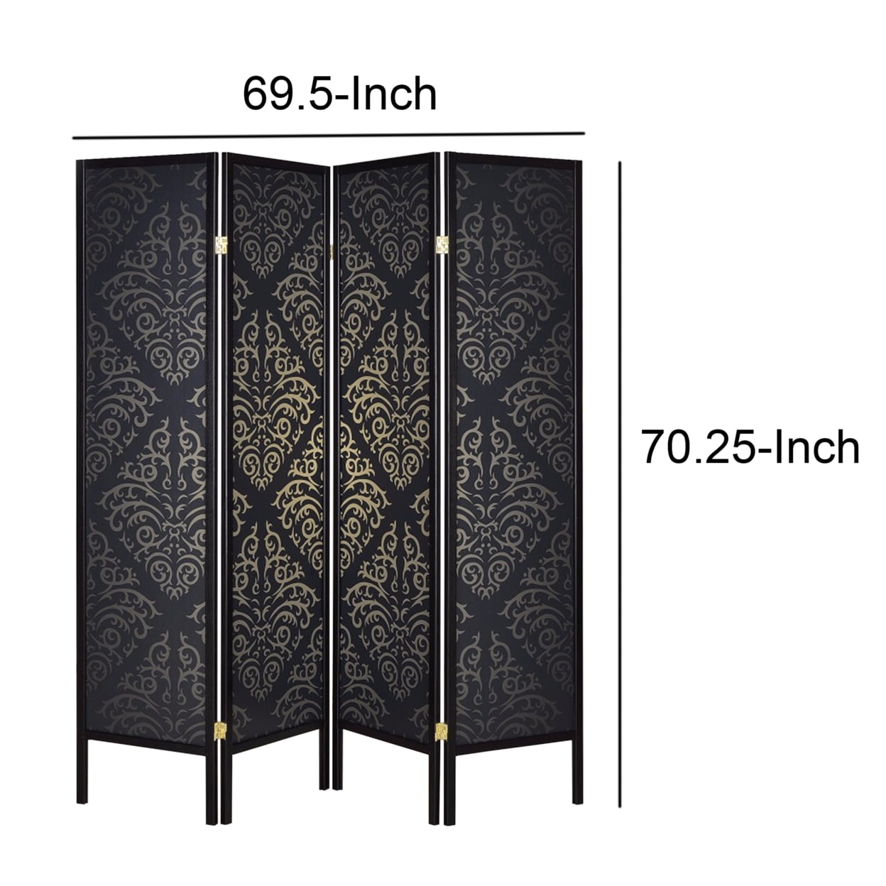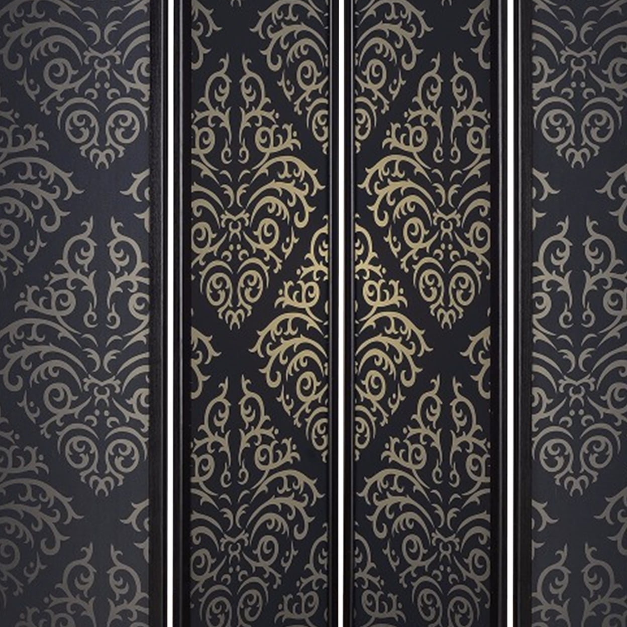 Includes: One (1) folding screen Finish: Black Panel: Black damask Materials: Pine, Wood, Particle Board Elegant Parisian style four panel screen with intricate panel detail Wood frame in black finish Black damask panels with gold pattern FSC certified wood frame rubberwood and polypropylene board construction Undercoat: 1 layer