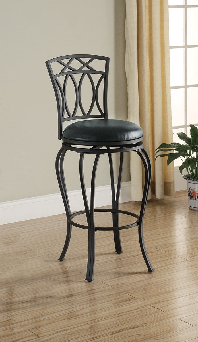 Introduce a decorative touch with the stylish presence of this metal barstool. Complete with a swivel seat that facilitates conversation, this barstool delivers transitional style with timeless appeal. Curvy legs surround a built-in footrest. A rounded seat is comfortably padded and wrapped in black faux leather for a rich touch. A decorative backrest adds detail to your decor while ensuring a supportive and enjoyable seating experience. Features: Includes: One (1) bar stool Metal finish: Black Upholstery: Black Materials: Metal, PVC, Foam, Faux Leather Materials content: 100% polyvinyl chloride Cleaning code: W-S Cushions: Attached Type of pattern: Black metal base and black vinyl seat Type of swivel plate: 360 degree (auto-return) Leveler/ plastic glide: Leveler Specifications: Product Dimensions: 44″H x 17″W x 19″D Product Weight: 19.8 lbs Seat Dimensions: 29″H x 16.5″D Assembly Required: Yes Warranty: One (1) year limited manufacturer warranty