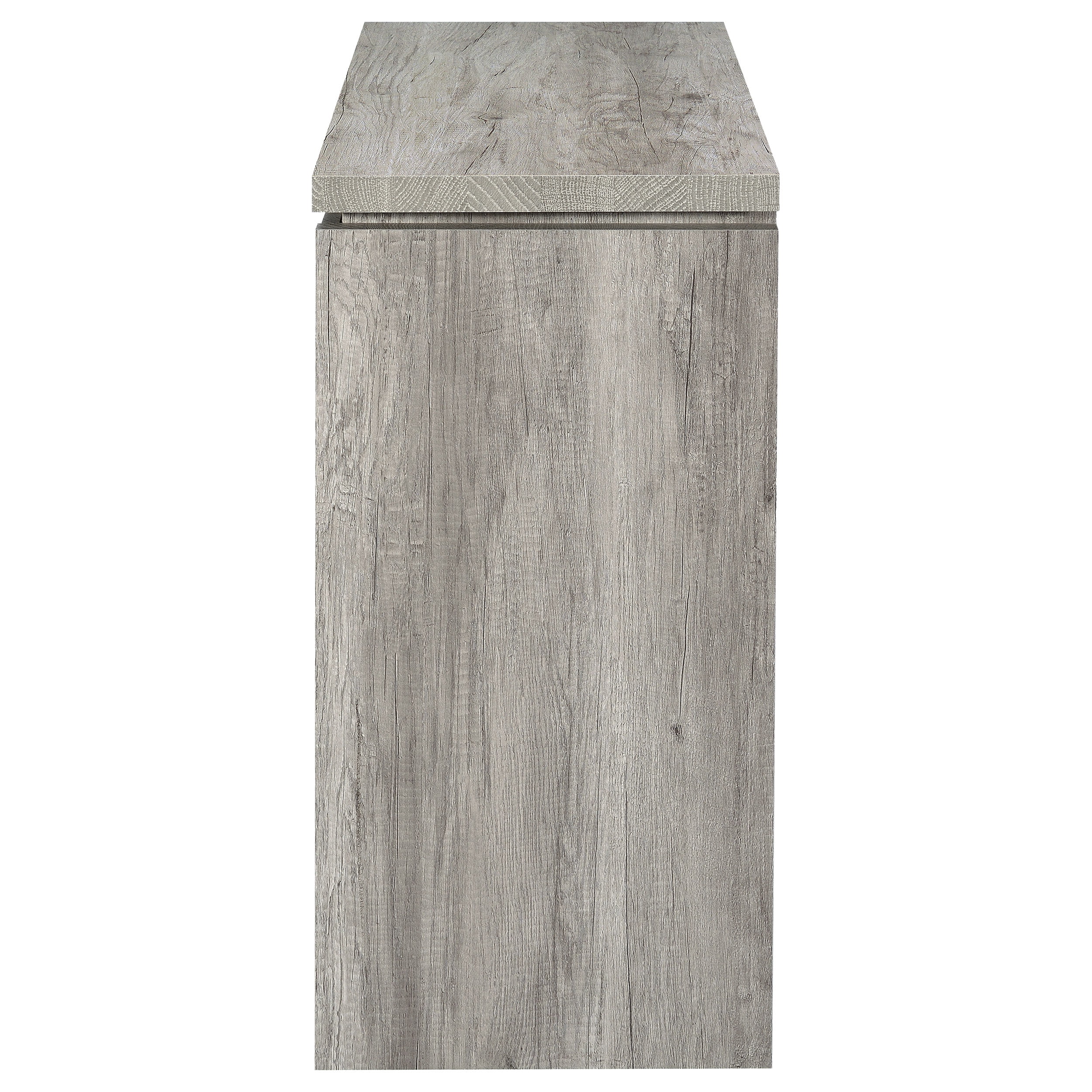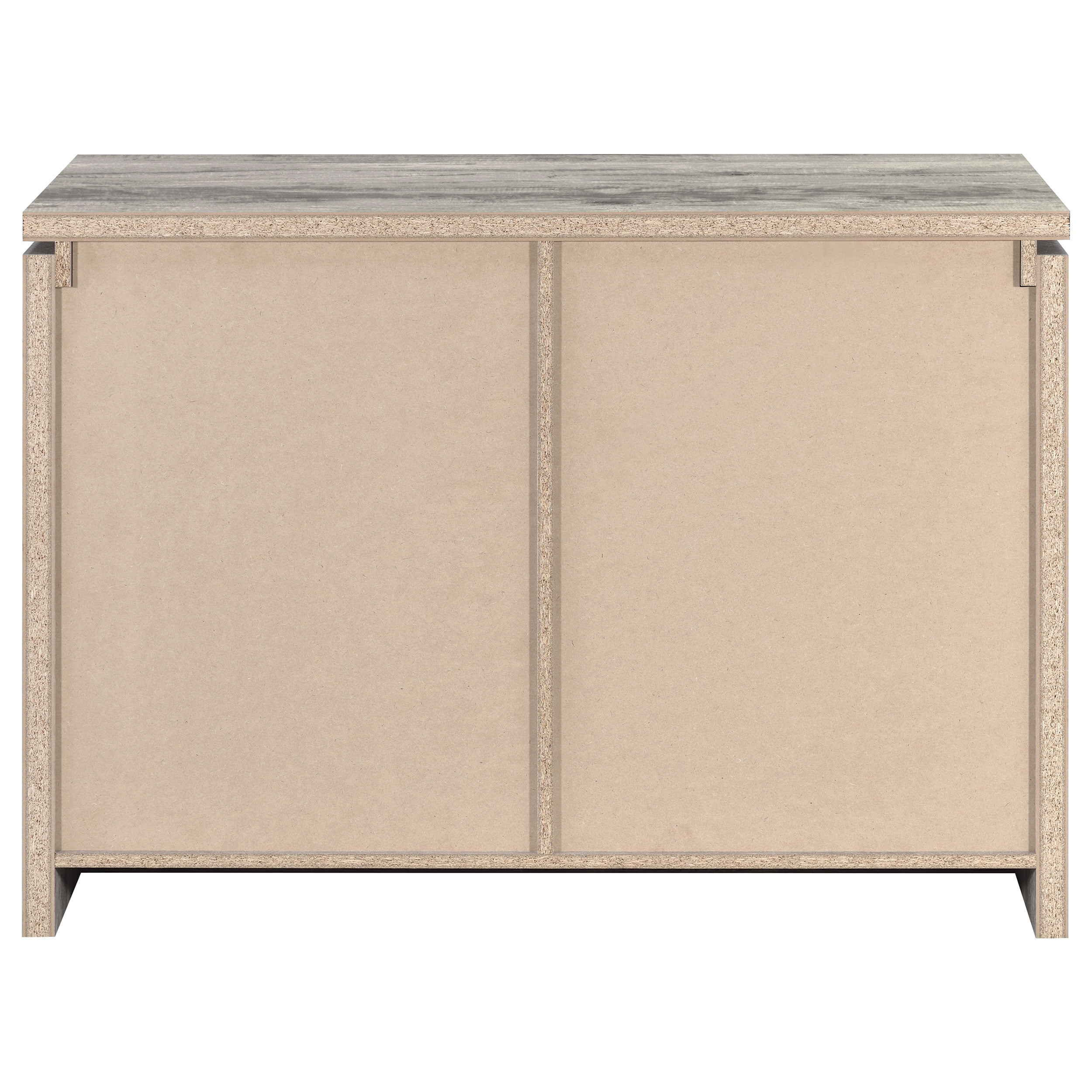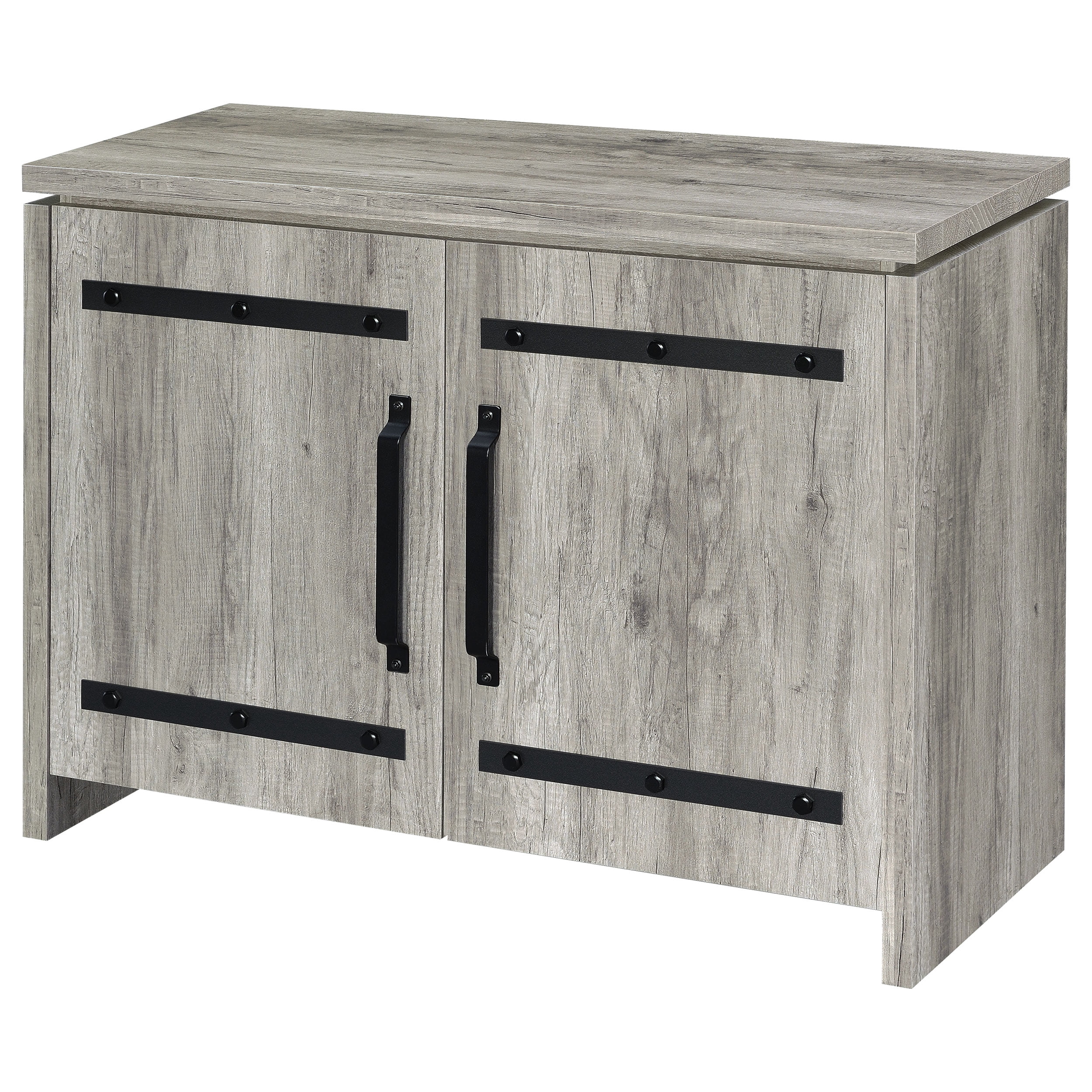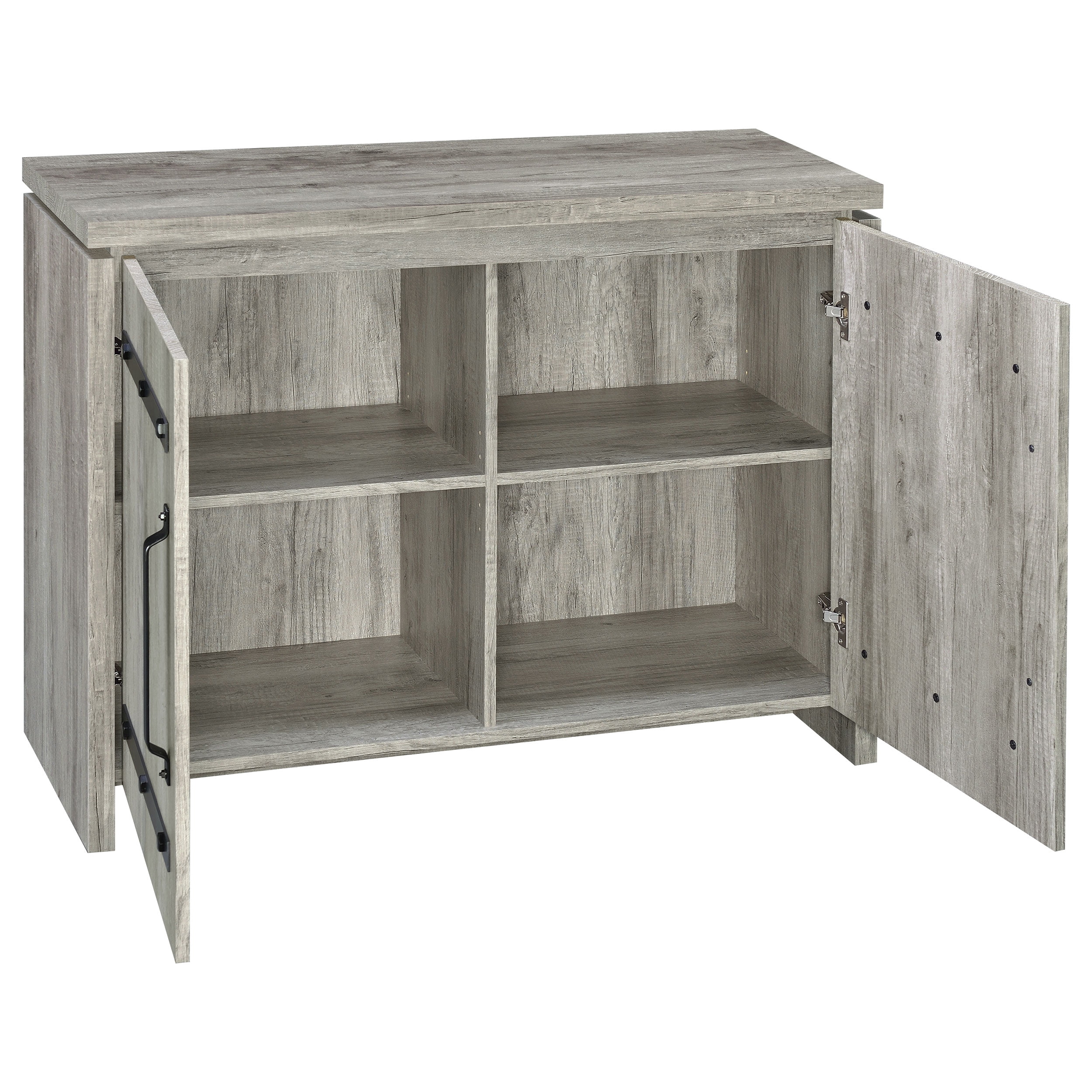 Includes: One (1) accent cabinet Finish: Gray driftwood Materials: Melamine Paper, Hollow Board, Particle Board, MDF, Wood Gray driftwood finish brings a coastal and homey vibe to this accent cabinet Two door, two shelf cabinet includes rustic metal details Number of compartments: 4 Hardware type: Pull handle Leveler/ plastic glide: Plastic glide